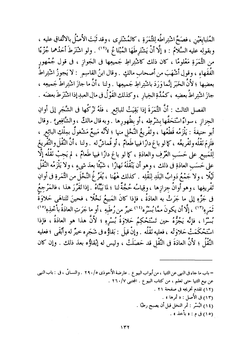 الفصل الثالث: أنَّ الثَّمَرَةَ إذا بَقِيَتْ للبائِعِ، فلَهُ تَرْكُها في الشَّجَرِ إلى أوانِ الجِزازِ، سواءٌ اسْتَحَقَّها بِشَرْطِه، أو بِظُهورِها. وبه قال مالكٌ، والشَّافِعِيُّ. وقال أبو حنيفةَ: يَلْزَمُه قَطْعُها، وتَفْريغُ النَّخْلِ منها؛ لأنَّه مَبيعٌ مَشْغولٌ بمِلْكِ البائِعِ، فلَزِمَ نَقْلُه وتَفْريغُه، كما لو باعَ دارًا فيها طَعامٌ، أو قُماشٌ له. ولنا، أنَّ النَّقْلَ والتَّفْريغَ لِلْمَبيعِ على حَسَبِ العُرْفِ والعادَةِ، كما لو باعَ دارًا فيها طَعامٌ، لم يَجِبْ نَقْلُه إلَّا على حَسَبِ العادَةِ في ذلك، وهو أن يَنْقُلَهُ نَهارًا، شَيْئًا بعدَ شىءٍ، ولا يَلْزَمُه النَّقْلُ لَيْلًا، ولا جَمْعُ دَوابِّ البَلَدِ لِنَقْلِه. كذلك هاهُنا، يُفَرِّغُ النَّخْلَ من الثَّمَرةِ في أوانِ تَفْريغِها، وهو أوانُ جِزازِها، وقِياسُه حُجَّةٌ لنا؛ لما بَيَّنَّاهُ. إذا تَقَرَّرَ هذا، فالمَرْجِعُ في جَزِّهِ إلى ما جَرَتْ به العادَةُ، فإذا كانَ المَبيعُ نَخْلًا، فحينَ تَتَناهَى حَلاوَةُ ثَمَرِهِ (١٣)، إلَّا أن يكونَ ممَّا بُسْرُه (١٤) خيرٌ من رُطَبِهِ، أو ما جَرَتِ العادَةُ بأخْذِهِ (١٥) بُسْرًا، فإنَّه يَجُزُّهُ حين تَسْتَحْكِمُ حَلاوَةُ بُسْرِهِ؛ لأنَّ هذا هو العادَةُ، فإذا اسْتَحْكَمَتْ حَلاوَتُه، فعليه نَقْلُه. وإنْ قيلَ: بَقاؤُه في شَجَرِه خيرٌ له وأبْقَى؛ فعليه النَّقْلُ؛ لأنَّ العادَةَ في النَّقْلِ قد حَصَلَتْ، وليس له إبْقاؤُه بعدَ ذلك. وإن كان