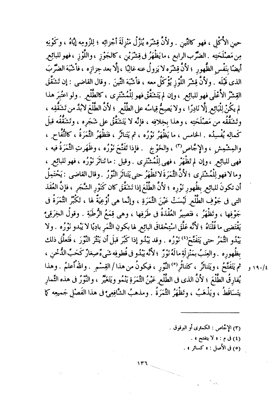 حينِ الأَكْلِ، فهو كالتِّينِ. ولأنَّ قِشْرَه يُنَزَّلُ مَنْزِلَةَ أجْزائِه؛ لِلزُومِه إيَّاهُ، وكَوْنِهِ مِن مَصْلَحَتِه. الضَّرْب الرابع، ما يَظْهَرُ في قِشْرَيْنِ، كالجَوْزِ، واللَّوْزِ، فهو للبائِعِ أيضًا بِنَفْسِ الظُّهورِ؛ لأنَّ قِشْرَه لا يَزولُ عنه غالِبًا، إلَّا بعد جِزازِه، فأشْبَهَ الضَّرْبَ الذى قَبْلَه. ولأنَّ قِشْرَ اللَّوْزِ يُؤْكَلُ معه، فأشْبَهَ التِّينَ. وقال القاضى: إن تَشَقَّقَ القِشْرُ الأَعْلَى فهو للبائِعِ، وإن لم يَتَشَقَّقْ فهو لِلْمُشْتَرِى، كالطَّلْعِ. ولو اعتُبِر هذا لم يكُنْ لِلْبَائِعِ إلَّا نَادِرًا، ولا يَصِحُّ قِياسُه على الطَّلْعِ؛ لأنَّ الطَّلْعَ لابدَّ من تَشَقُّقِه، وتَشَقُّقُه من مَصْلَحَتِه، وهذا بِخِلافِه، فإنَّه لا يَتَشَقَّقُ على شَجَرِه، وتَشَقُّقُه قبلَ كَمالِه يُفْسِدُه. الخامس، ما يَظْهَرُ نَوْرُه، ثم يَتَناثَرُ، فتَظْهَرُ الثَّمَرَةُ، كالتُّفَّاحِ، والمِشْمِشِ، والإِجَّاصِ (٣)، والخَوْخِ. فإذا تَفَتَّحَ نَوْرُه، وظَهَرتِ الثَّمَرَةُ فيه، فهى للبائِعِ، وإن لم تَظْهَرْ، فهى لِلْمُشْتَرِى. وقيل: ما تَناثَرَ نَوْرُه، فهو للبائِعِ، وما لا فهو لِلْمُشْتَرِى؛ لأنَّ الثَّمَرَةَ لا تَظْهَرُ حتى يَتَناثَرَ النَّوْرُ. وقال القاضى: يَحْتَمِلُ أن تكونَ للبائِعِ بِظُهورِ نَوْرِه؛ لأنَّ الطَّلْعَ إذا تَشَقَّقَ كان كَنَوْرِ الشَّجَرِ، فإنَّ العُقَدَ التى في جَوْفِ الطَّلْعِ لَيْسَتْ عَيْنَ الثَّمَرَةِ، وإنَّما هى أَوْعِيَةٌ لها، تَكْبُرُ الثَّمَرَةُ في جَوْفِها، وتَظْهَرُ، فتَصِيرُ العُقْدَةُ في طَرَفِها، وهى قِمَعُ الرُّطَبَةِ. وقولُ الخِرَقِيِّ يَقْتَضِى ما قُلْنَاهُ؛ لأنَّه عَلَّقَ اسْتِحْقاقَ البائِعِ لها بكونِ الثَّمَرِ بادِيًا لا يَبْدو نَوْرُه. ولا يَبْدُو الثَّمَرُ حتى يَتَفَتَّحَ (٤) نَوْرُه. وقد يَبْدُو إذا كَبُرَ قبلَ أن يَنْثُرَ النَّوْرَ، فَتَعلَّقَ ذلك بِظُهورِه. والعِنَبُ بمَنْزِلَةِ ما لَهُ نَوْرٌ؛ لأنَّه يَبْدُو في قُطوفِه شَيءٌ صِغارٌ كَحَبِّ الدُّخْنِ، ثم يَتَفَتَّحُ، ويَتَناثَرُ، كتَناثُرِ (٥) النَّوْرِ، فيكونُ من هذا القِسْمِ. واللهُ أعلمُ. وهذا يُفارِقُ الطَّلْعَ؛ لأنَّ الذى في الطَّلْعِ عَيْنُ الثَّمَرَةِ يَنْمُو ويَتَغَيَّرُ، والنَّوْرُ في هذه الثِّمارِ يتَسَاقَطُ، ويَذْهَبُ، وتَظْهَرُ الثَّمَرَةُ. ومذهبُ الشَّافِعِيِّ في هذا الفَصْلِ جَميعِه كما