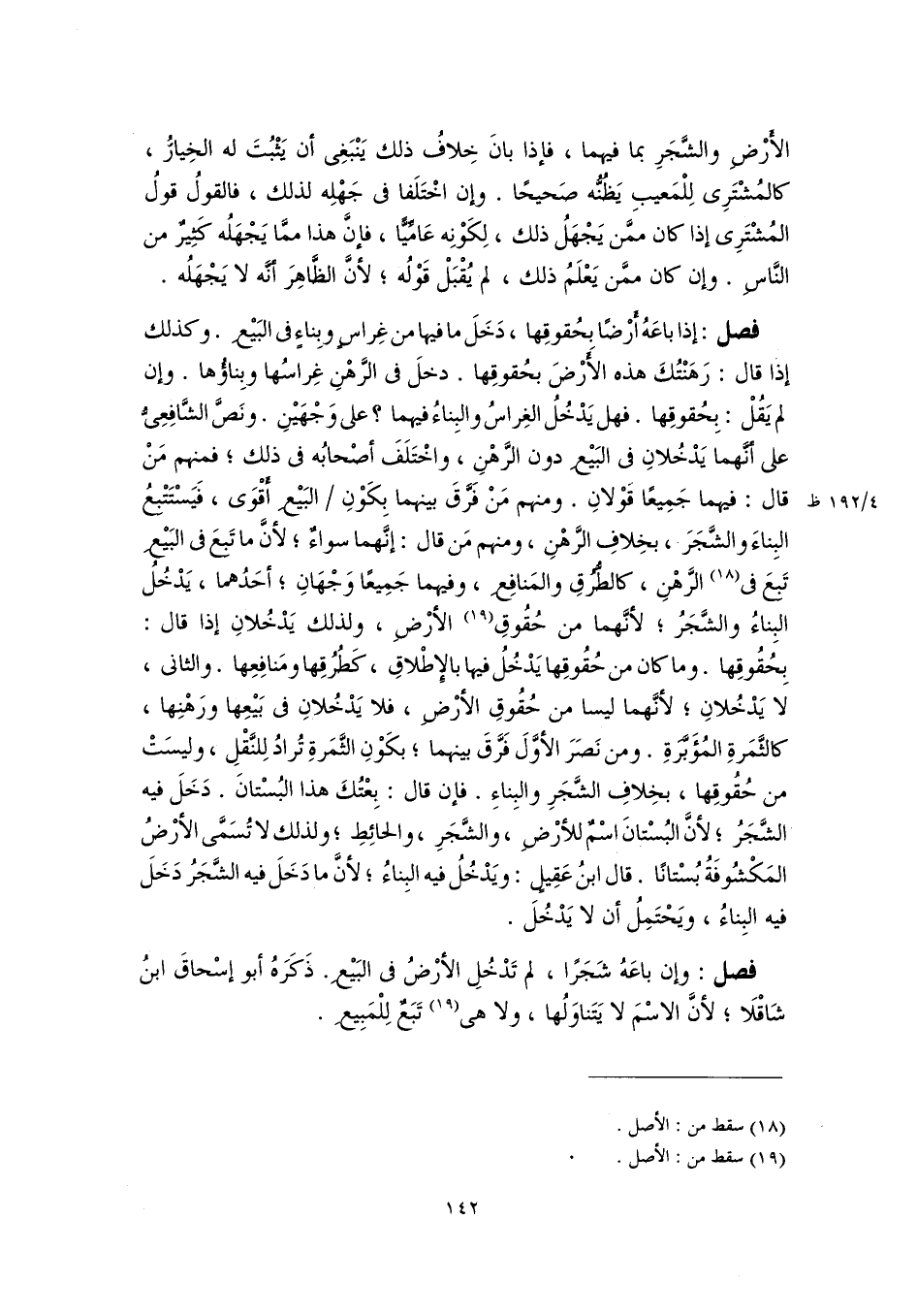 فصل: إذا باعَهُ أَرْضًا بحُقوقِها، دَخَلَ ما فيها من غِراسٍ وبِناءٍ في البَيْعِ. وكذلك إذا قال: رَهَنْتُكَ هذه الأَرْضَ بحُقوقِها. دخلَ في الرَّهْنِ غِراسُها وبِناؤُها. وإن لم يَقُلْ: بِحُقوقِها. فهل يَدْخُلُ الغِراسُ والبِناءُ فيهما؟ على وَجْهَيْنِ. ونَصَّ الشَّافِعِيُّ على أنَّهما يَدْخُلانِ في البَيْعِ دون الرَّهْنِ، واخْتَلَفَ أصْحابُه في ذلك؛ فمنهم مَنْ قال: فيهما جَمِيعًا قوْلانِ. ومنهم مَنْ فَرَّقَ بينهما بِكَوْنِ البَيْعِ أَقْوَى، فَيَسْتَتْبعُ البِناءَ والشَّجَرَ، بخِلافِ الرَّهْنِ، ومنهم مَن قال: إنَّهما سواءٌ؛ لأنَّ ما تَبِعَ في البَيْعِ تَبِعَ في (١٨) الرَّهْنِ، كالطُّرُقِ والمَنافِعِ، وفيهما جَمِيعًا وَجْهَانِ؛ أحَدُهما، يَدْخُلُ البِناءُ والشَّجَرُ؛ لأنَّهما من حُقُوقِ (١٩) الأرْضِ، ولذلك يَدْخُلانِ إذا قال: بِحُقُوقِها. وما كان من حُقُوقِها يَدْخُلُ فيها بالإِطْلاقِ، كَطُرُقِها ومَنافِعِها. والثانى، لا يَدْخُلانِ؛ لأنَّهما ليسا من حُقُوقِ الأرْضِ، فلا يَدْخُلانِ في بَيْعِها ورَهْنِها، كالثَّمَرةِ المُؤَبَّرَةِ. ومن نَصَرَ الأوَّلَ فَرَّقَ بينهما؛ بكَوْنِ الثَّمَرةِ تُرادُ لِلنَّقْلِ، وليسَتْ من حُقُوقِها، بخِلافِ الشَّجَرِ والبِناءِ. فإن قال: بِعْتُكَ هذا البُسْتانَ. دَخَلَ فيه الشَّجَرُ؛ لأنَّ البُسْتانَ اسْمٌ للأرْضِ، والشَّجَرِ، والحائِطِ؛ ولذلك لا تُسَمَّى الأرْضُ المَكْشُوفَةُ بُسْتانًا. قال ابنُ عَقِيلٍ: ويَدْخُلُ فيه البِناءُ؛ لأنَّ ما دَخَلَ فيه الشَّجَرُ دَخَلَ فيه البِناءُ، ويَحْتَمِلُ أن لا يَدْخُلَ.