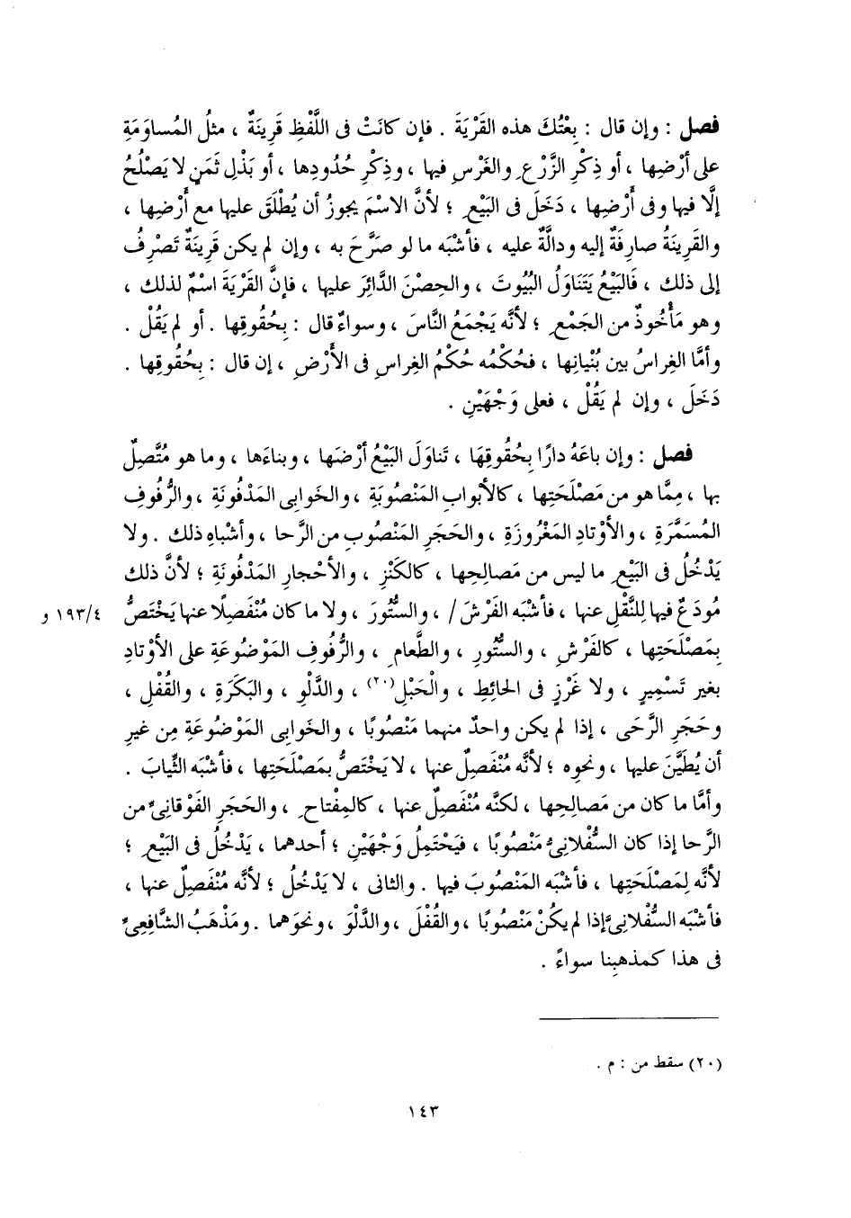 فصل: وإن قال: بِعْتُكَ هذه القَرْيَةَ. فإن كانَتْ في اللَّفْظِ قَرِينَةٌ، مثلُ المُساوَمَةِ على أرْضِها، أو ذِكْرِ الزَّزعِ والغَرْسِ فيها، وذِكْرِ حُدُودِها، أو بَذْلِ ثَمَنٍ لا يَصْلُحُ إلَّا فيها وفى أَرْضِها، دَخَلَ في البَيْعِ؛ لأنَّ الاسْمَ يجوزُ أن يُطْلَقَ عليها مع أَرْضِها، والقَرِينَةُ صارِفَةٌ إليه ودالَّةٌ عليه، فأشْبَه ما لو صَرَّحَ به، وإن لم يكن قَرِينَةٌ تَصْرِفُ إلى ذلك، فَالبَيْعُ يَتَنَاوَلُ البُيُوتَ، والحِصْنَ الدَّائِرَ عليها، فإنَّ القَرْيَةَ اسْمٌ لذلك، وهو مَأْخُوذٌ من الجَمْعِ؛ لأنَّه يَجْمَعُ النَّاسَ، وسواءٌ قال: بِحُقُوقِها. أو لم يَقُلْ. وأمَّا الغِراسُ بين بُنْيانِها، فحُكْمُه حُكْمُ الغِراسِ في الأَرْضِ، إن قال: بِحُقُوقِها. دَخَلَ، وإن لم يَقُلْ، فعلى وَجْهَيْنِ.