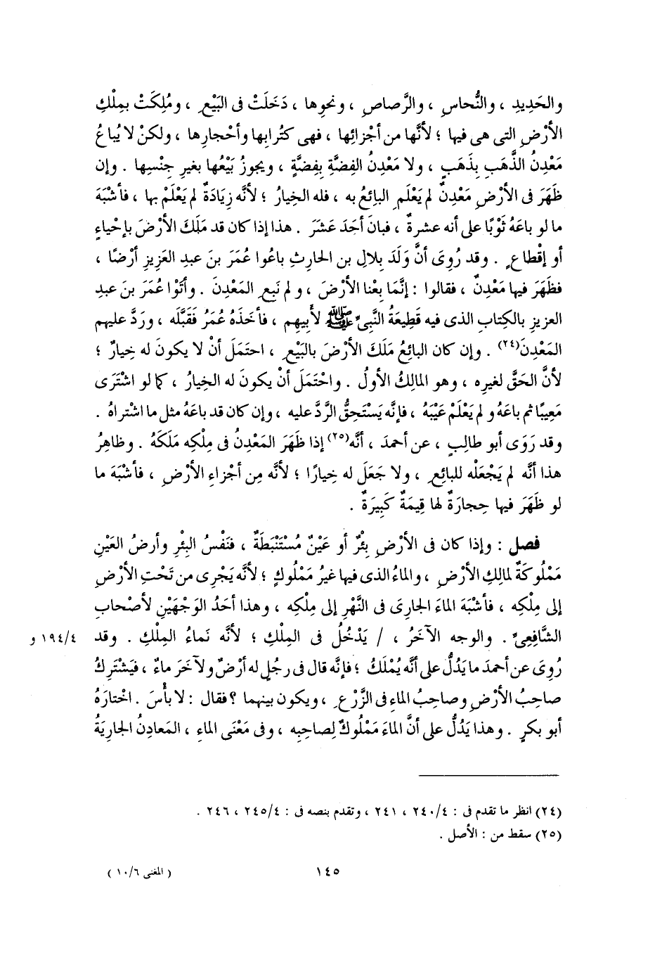 والحَدِيدِ، والنُّحاسِ، والرَّصاصِ، ونحوِها، دَخَلَتْ في البَيْعِ، ومُلِكَتْ بمِلْكِ الأرْضِ التى هى فيها؛ لأنَّها من أجْزائِها، فهى كتُرابِها وأحْجارِها، ولكنْ لا يُباعُ مَعْدِنُ الذَّهَبِ بِذَهَبٍ، ولا مَعْدِنُ الفِضَّةِ بِفِضَّةٍ، ويجوزُ بَيْعُها بغيرِ جِنْسِها. وإن ظَهَرَ في الأرْضِ مَعْدِنٌ لم يَعْلَمِ البائِعُ به، فله الخِيارُ؛ لأنَّه زِيَادَةٌ لم يَعْلَمْ بها، فأشْبَهَ ما لو باعَهُ ثَوْبًا على أنه عشرةٌ، فبانَ أحَدَ عَشَرَ. هذا إذا كان قد مَلَكَ الأرْضَ بإحْياءٍ أو إقْطاعٍ. وقد رُوِىَ أنَّ وَلَدَ بِلالِ بن الحارِثِ باعُوا عُمَرَ بنَ عبدِ العَزِيزِ أرْضًا، فظَهَرَ فيها مَعْدِنٌ، فقالوا: إنَّمَا بِعْنا الأرْضَ، ولم نَبعِ المَعْدِنَ. وأتَوْا عُمَرَ بنَ عبدِ العزيزِ بالكِتابِ الذى فيه قَطِيعَةُ النَّبِيِّ -صَلَّى اللهُ عَلَيْهِ وَسَلَّمَ- لأَبِيهِم، فأخَذَهُ عُمَرُ فَقَبَّلَه، ورَدَّ عليهم المَعْدِنَ (٢٤). وإن كان البائِعُ مَلَكَ الأرْضَ بالبَيْعِ، احتَمَلَ أنْ لا يكونَ له خِيارٌ؛ لأنَّ الحَقَّ لغيرِه، وهو المالِكُ الأولُ. واحْتَمَلَ أنْ يكونَ له الخِيارُ، كما لو اشْتَرَى مَعِيبًا ثم باعَهُ ولم يَعْلَمْ عَيْبَهُ، فإنَّه يَسْتَحِقُّ الرَّدَّ عليه، وإن كان قد باعَهُ مثل ما اشْتراهُ. وقد رَوَى أبو طالِبٍ، عن أحمدَ، أنَّه (٢٥) إذا ظَهَرَ المَعْدِنُ في مِلْكِه مَلَكَهُ. وظاهِرُ هذا أنَّه لم يَجْعَلْه للبائِعِ، ولا جَعَلَ له خِيارًا؛ لأنَّه مِن أجْزاءِ الأرْضِ، فأشْبَهَ ما لو ظَهَرَ فيها حِجارَةٌ لها قِيمَةٌ كَبِيرَةٌ.