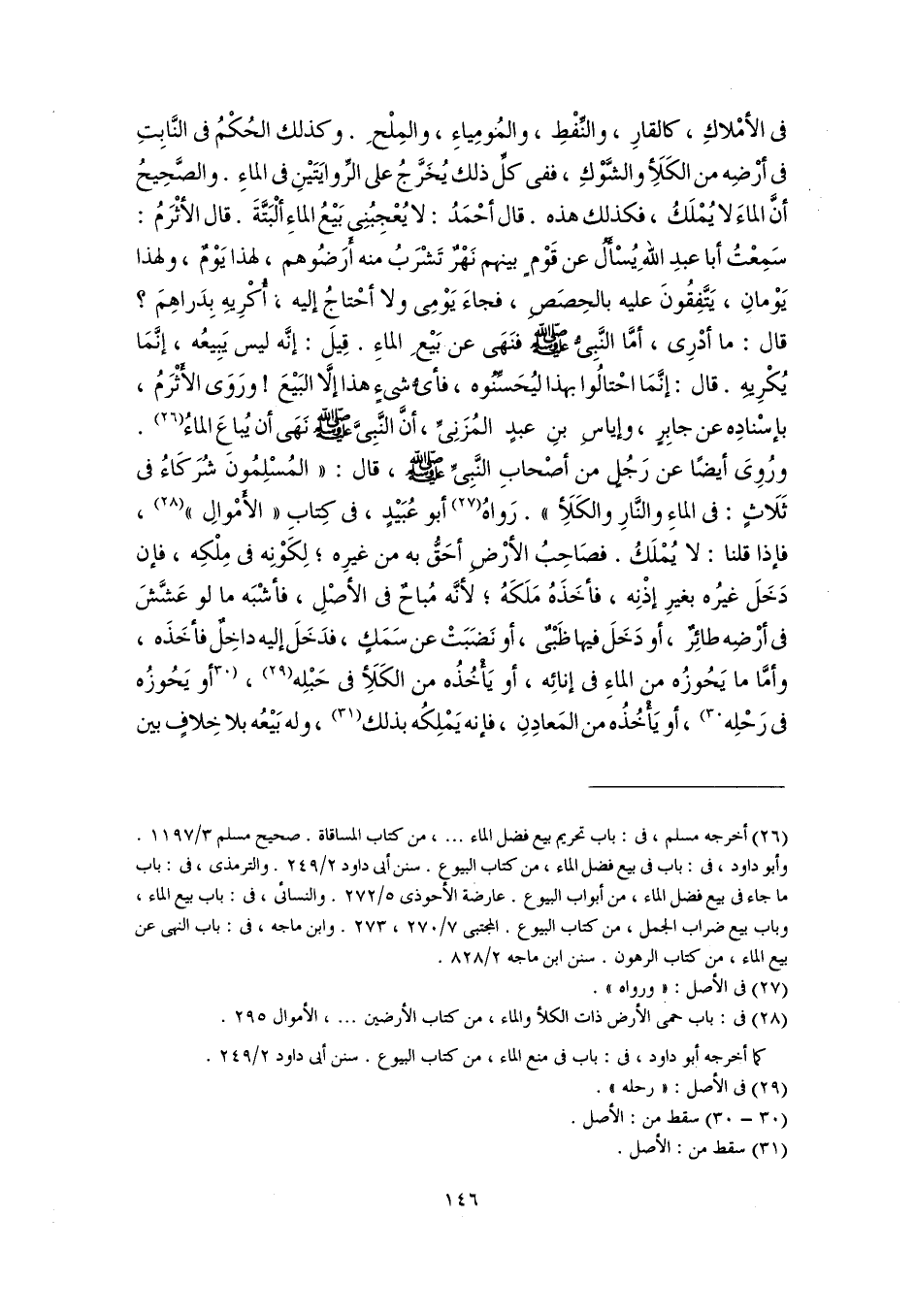 (٢٦) أخرجه مسلم، في: باب تحريم بيع فضل الماء. . .، من كتاب المساقاة. صحيح مسلم ٣/ ١١٩٧. وأبو داود، في: باب في بيع فضل الماء، من كتاب البيوع. سنن أبي داود ٢/ ٢٤٩. والترمذى، في: باب ما جاء في بيع فضل الماء، من أبواب البيوع. عارضة الأحوذى ٥/ ٢٧٢. والنسائى، في: باب بيع الماء، وباب بيع ضراب الجمل، من كتاب البيوع. المجتبى ٧/ ٢٧٠، ٢٧٣. وابن ماجه، في: باب النهى عن بيع الماء، من كتاب الرهون. سنن ابن ماجه ٢/ ٨٢٨.