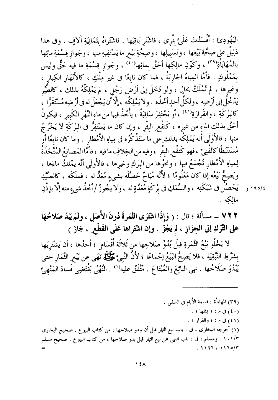 اليَهُودِيُّ. أفْسَدْتَ عَلَيَّ بِئْرِى، فاشْتَرِ بَاقِيَها. فاشْتَراهُ بِثَمَانِيَةِ آلافٍ. وفى هذا دَلِيلٌ على صِحَّةِ بَيْعِها، وتَسْبِيلِها، وصِحَّةِ بَيْعِ ما يَسْتَقِيهِ منها، وجَوازِ قِسْمَةِ مائِها بالمُهَايَأَةِ (٣٩)، وكَوْنِ مالِكِها أحَقَّ بِمائِها (٤٠)، وجَوازِ قِسْمَةِ ما فيه حَقٌّ وليس بِمَمْلُوكٍ. فأمَّا المِياهُ الجارِيَةُ، فما كان نابِعًا في غير مِلْكٍ، كالأنْهَارِ الكِبارِ، وغيرِها، لم تُمْلَكْ بحالٍ، ولو دَخَلَ إلى أرْضِ رَجُلٍ، لم يَمْلِكْهُ بذلك، كالطَّيْرِ يَدْخُلُ إلى أرْضِه، ولكلِّ أحدٍ أخْذُه. ولا يَمْلِكُه، إلَّا أن يَجْعَلَ له في أرْضِه مُسْتَقَرًّا، كالبِرْكَةِ، والقَرارَةِ (٤١)، أو يَحْتَفِرَ سَاقِيَةً، يأْخُذُ فيها من ماءِ النَّهْرِ الكَبِيرِ، فيكونُ أحَقَّ بذلك الماءِ من غيرِه، كَنقْعِ البِئْرِ، وإن كان ما يَسْتَقِرُّ في البِرْكَةِ لا يَخْرُجُ منها، فالأوْلَى أَنه يَمْلِكُه بذلك على ما سَنَذْكُرُه في مِياهِ الأمْطارِ. وما كان نابِعًا أو مُسْتَنْبَطًا كالقُنِيِّ، فهو كَنقْعِ البِئْرِ، وفيه من الخِلافِ ما فيه، فأمَّا المَصانِعُ المُتَّخَذَةُ لِمياهِ الأمْطارِ تُجْمَعُ فيها، ونحوُها من البِرَكِ وغيرِها، فالأولَى أنَّه يمْلكُ ماءَها، ويَصِحُّ بَيْعُه إذا كان مَعْلُومًا؛ لأنَّه مُبَاحٌ حَصَّلَه بشىءٍ مُعَدٍّ له، فملَكَه، كالصَّيْدِ يَحْصُلُ في شَبَكَتِه، والسَّمَكِ في بِرْكَةٍ مُعَدَّةٍ له، ولا يجُوزُ أخْذُ شىءٍ منه إلَّا بإذْنِ مالِكِه.