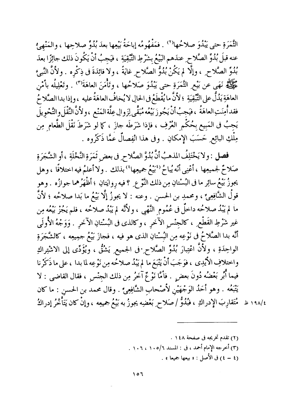 الثَّمَرَةِ حتى يَبْدُوَ صلاحُها (٢). فمَفْهُومُه إباحَةُ بَيْعِها بعدَ بُدُوِّ صلاحِها، والمَنْهِىُّ عنه قبلَ بُدُوِّ الصَّلاحِ عندَهم البَيْعُ بِشَرْطِ التَّبْقِيَةِ، فيَجِبُ أنْ يَكُونَ ذلك جائِزًا بعدَ بُدُوِّ الصَّلاحِ، وإلَّا لم يَكُنْ بُدُوُّ الصَّلاحِ غايَةً، ولا فائِدَةَ في ذِكْرِه. ولأنَّ النَّبيَّ -صَلَّى اللهُ عَلَيْهِ وَسَلَّمَ- نَهَى عن بَيْعِ الثَّمَرَةِ حتى يَبْدُوَ صَلاحُها، وتَأْمَنَ العاهَةَ (٣). وتَعْلِيلُه بأمْنِ العاهَةِ يَدُلُّ على التَّبْقِيَةِ؛ لأنَّ ما يُقْطَعُ في الحالِ لا يُخافُ العاهَةُ عليه، وإذا بدا الصَّلاحُ فقد أُمِنَتِ العاهَةُ، فيَجِبُ أنْ يَجُوزَ بَيْعُه مُبَقًّى لِزَوالِ عِلَّة المَنْع، ولأنَّ النَّقْلَ والتَّحْوِيلَ يَجِبُ في المَبِيعِ بِحُكْمِ العُرْفِ، فإذا شَرَطَه جازَ، كما لو شَرَطَ نَقْلَ الطَّعامِ مِن مِلْكِ البائِعِ حَسَبَ الإِمكانِ. وفي هذا انْفِصالٌ عمَّا ذَكَرُوه.