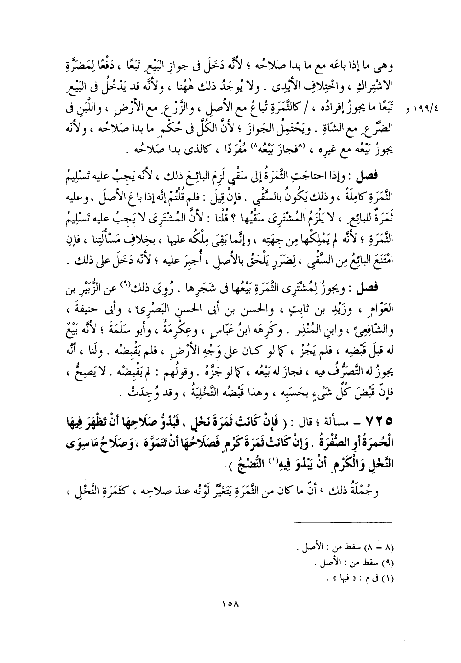 فصل: وإذا احتاجَتِ الثَّمَرَةُ إلى سَقْىٍ لَزِمَ البائِعَ ذلك، لأنّه يَجِبُ عليه تَسْلِيمُ الثَّمَرَةِ كامِلَةً، وذلك يَكُونُ بالسَّقْىِ. فإنْ قِيلَ: فلم قُلْتُمْ إنَّه إذا باعَ الأصلَ، وعليه ثَمَرَةٌ للبائِعِ، لا يَلْزَمُ المُشْتَرِىَ سَقْيُها؟ قُلْنا: لأنَّ المُشْتَرِىَ لا يَجِبُ عليه تَسْلِيمُ الثَّمَرَةِ، لأنَّه لم يَمْلِكْها مِن جِهَتِه، وإنَّما بَقِىَ مِلْكُه عليها، بخِلافِ مَسْأَلَتِنا، فإنِ امْتَنَعَ البائِعُ مِن السَّقْىِ، لِضَرَرٍ يَلْحَقُ بالأصلِ، أُجبِرَ عليه؛ لأنّه دَخَلَ على ذلك.