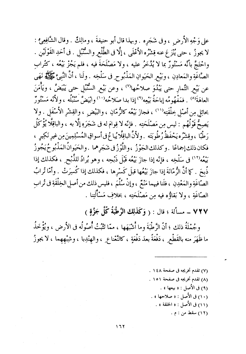 على وَجْهِ الأرضِ، وفي شَجَرِه. وبهذا قال أبو حنيفةَ، ومالِكٌ. وقال الشَّافِعيُّ: لا يجوزُ، حتى يُنْزَعَ عنه قِشْرُه الأعْلَى، إلَّا في الطَّلْعِ والسُّنْبُلِ. في أحَدِ القَوْلَيْنِ. واحْتَجَّ بأنَّه مَسْتُورٌ بما لا يُدَّخَرُ عليه، ولا مَصْلَحَةَ فيه، فلم يَجُزْ بَيْعُه، كتُرابِ الصَّاغَةِ والمَعادِنِ، وبَيْعِ الحَيَوانِ المَذْبُوحِ في سَلْخِه. ولَنا، أنَّ النَّبِيَّ -صَلَّى اللهُ عَلَيْهِ وَسَلَّمَ- نَهَى عن بَيْعِ الثِّمارِ حتى يَبْدُوَ صلاحُها (٧)، وعن بَيْعِ السُّنْبُلِ حتى يَبْيَضَّ، ويَأْمَنَ العاهَةَ (٨). فمَفْهُومُه إباحَةُ بَيْعِه (٩) إذا بدا صَلاحُه (١٠) وابْيَضَّ سُنْبُلُه، ولأنّه مَسْتُورٌ بحائِلٍ مِن أصْلِ خِلْقَتِه (١١)، فجازَ بَيْعُه كالرُّمّانِ، والبَيْضِ، والقِشْرِ الأسْفَلِ. ولا يَصِحُّ قَوْلُهُم: ليس مِن مَصْلَحَتِه. فإنّه لا قِوامَ له في شَجَرَهِ إلَّا به، والباقِلَّا يُؤْكَلُ رَطْبًا، وقِشْرُه يَحْفَظُ رُطُوبَتَه. ولأنَّ الباقِلَّا يُباعُ في أسواقِ المُسْلِمِينَ مِن غيرِ نَكِيرٍ، فكان ذلك إجماعًا. وكذلك الجَوْزُ، واللَّوْزُ في شَجَرِهما. والحَيَوانُ المَذْبُوحُ يَجُوزُ بَيْعُه (١٢) في سَلْخِه، فإنّه إذا جازَ بَيْعُه قَبْلَ ذَبْحِه، وهو يُرادُ للذَّبْحِ، فكذلك إذا ذُبِحَ. كما أنَّ الرُّمّانَةَ إذا جازَ بَيْعُها قبلَ كَسْرِها، فكذلك إذا كُسِرَتْ. وأمّا تُرابُ الصّاغَةِ والمَعْدِنِ، فلَنا فيهما مَنْعٌ، وإنْ سُلِّمَ، فليس ذلك من أصلِ الخِلْقَةِ في تُرابِ الصّاغَةِ، ولا بَقاؤُه فيه مِن مَصْلَحَتِه، بخلافِ مَسْأَلَتِنا.