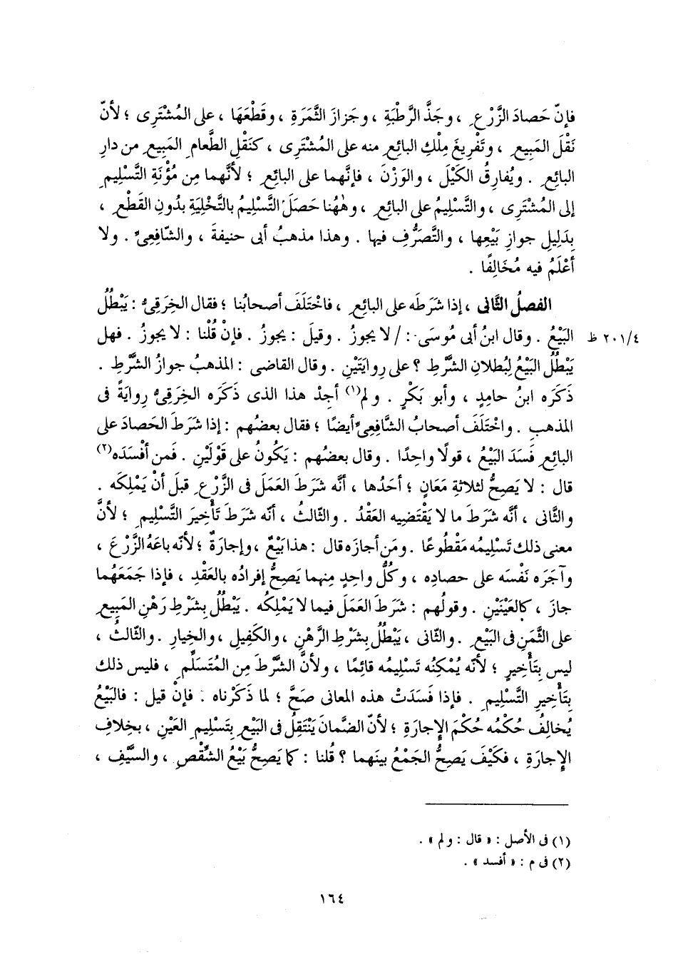 الفصلُ الثَّانى، إذا شَرَطَه على البائِعِ، فاخْتَلَفَ أصحابُنا؛ فقال الخِرَقِيُّ: يَبْطُلُ البَيْعُ. وقال ابنُ أبى مُوسَى: لا يجوزُ. وقيلَ: يجوزُ. فإنْ قُلْنا: لا يجوزُ. فهل يَبْطُلُ البَيْعُ لِبُطلانِ الشَّرْطِ؟ على رِوايَتَيْنِ. وقال القاضى: المذهبُ جوازُ الشَّرْطِ. ذَكَرَه ابنُ حامِدٍ، وأبو بَكْرٍ. ولم (١) أجِدْ هذا الذى ذَكَرَه الخِرَقِيُّ رِوايَةً في المذهبِ. واخْتَلَفَ أصحابُ الشَّافِعِيِّ أيضًا؛ فقال بعضُهم: إذا شَرَطَ الحَصادَ على البائِعِ فَسَدَ البَيْعُ، قولًا واحِدًا. وقال بعضُهم: يَكُونُ على قَوْلَيْنِ. فَمن أفْسَدَه (٢) قال: لا يَصِحُّ لثلاثةِ مَعَانٍ؛ أحَدُها، أنَّه شَرَطَ العَمَلَ في الزَّرْعِ قبلَ أنْ يَمْلِكَه. والثَّاني، أنَّه شَرَطَ ما لا يَقْتَضِيه العَقْدُ. والثّالثُ، أنَّه شَرَطَ تَأْخِيرَ التَّسْلِيمِ؛ لأنَّ معنى ذلك تَسْلِيمُه مَقْطُوعًا. ومَن أجازَه قال: هذا بَيْعٌ، وإجارَةٌ؛ لأنّه باعَهُ الزَّرْعَ، وآجَرَه نَفْسَه على حصادِه، وكُلُّ واحِدٍ مِنهما يَصِحُّ إفرادُه بالعَقْدِ، فإذا جَمَعَهُما جازَ، كالعَيْنَيْنِ. وقولُهم: شَرَطَ العَمَلَ فيما لا يَمْلِكُه. يَبْطُلُ بِشَرْطِ رَهْنِ المَبِيعِ على الثَّمَنِ في البَيْعِ. والثّاني، يَبْطُلُ بِشَرْطِ الرَّهْنِ، والكَفِيلِ، والخِيارِ. والثّالثُ، ليس بِتَأْخِيرٍ؛ لأنّه يُمْكِنُه تَسْلِيمُه قائِمًا، ولأنَّ الشَّرْطَ مِن المُتَسَلِّمِ، فليس ذلك بِتَأْخِيرِ التَّسْلِيمِ. فإذا فَسَدَتْ هذه المعاني صَحَّ؛ لما ذَكَرْناه. فإنْ قيل: فالبَيْعُ يُخالِفُ حُكْمُه حُكْمَ الإِجارَةِ؛ لأنّ الضَّمانَ يَنْتَقِلُ في البَيْعِ بِتَسْلِيمِ العَيْنِ، بخِلافِ الإِجارَةِ، فكَيْفَ يَصِحُّ الجَمْعُ بينَهما؟ قُلنا: كما يَصِحُّ بَيْعُ الشِّقْصِ، والسَّيْفِ،