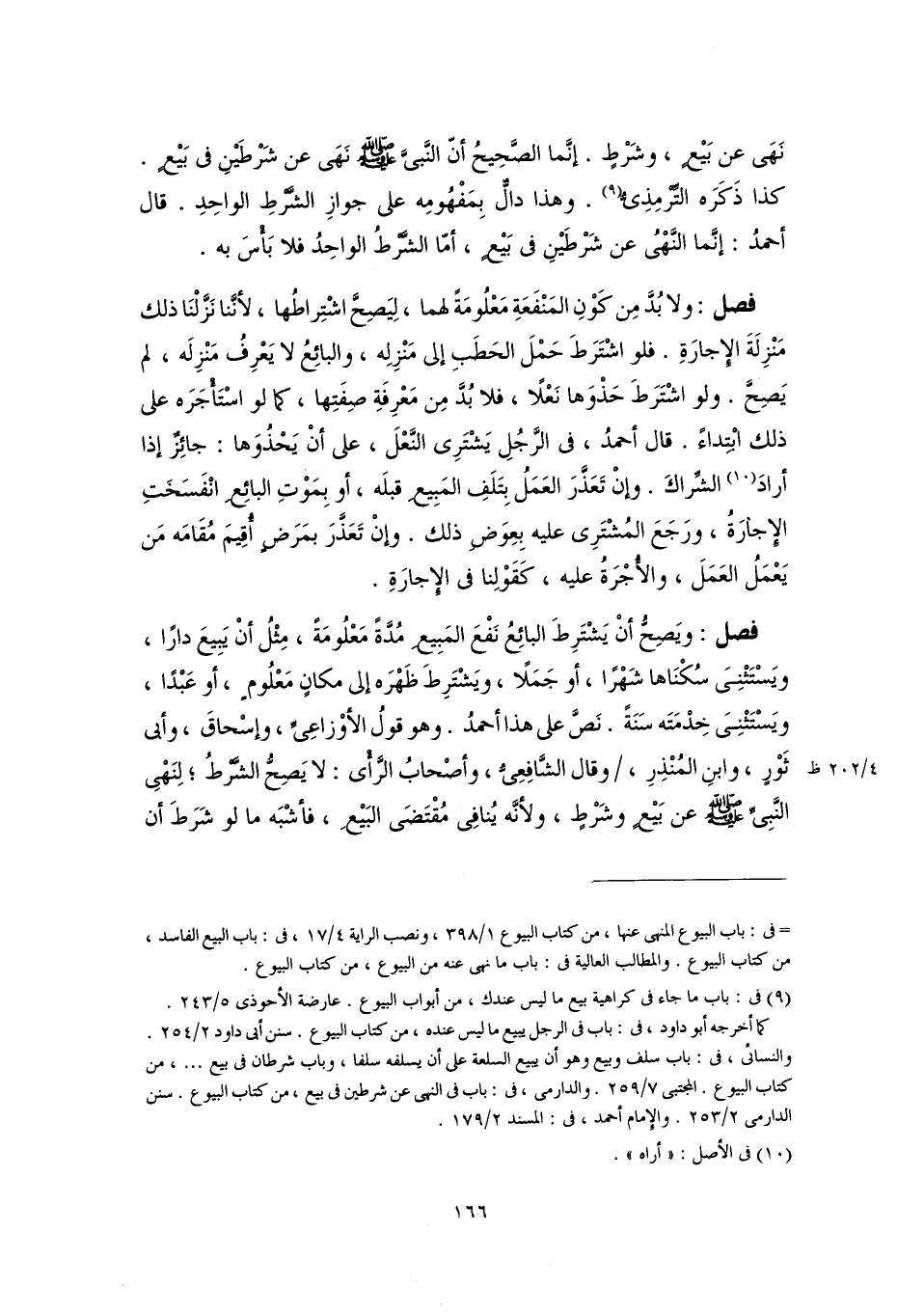 نَهَى عن بَيْعٍ، وشَرْطٍ. إنَّما الصَّحِيحُ أنّ النَّبِيَّ -صَلَّى اللهُ عَلَيْهِ وَسَلَّمَ- نَهَى عن شَرْطَيْنِ فى بَيْعٍ. كذا ذَكَرَه التِّرْمِذِيُّ (٩). وهذا دالٌّ بِمَفْهُومِه على جوازِ الشَّرْطِ الواحِدِ. قال أحمدُ: إنَّما النَّهْىُ عن شَرْطَيْنِ فى بَيْعٍ، أمّا الشَّرْطُ الواحِدُ فلا بَأْسَ به.