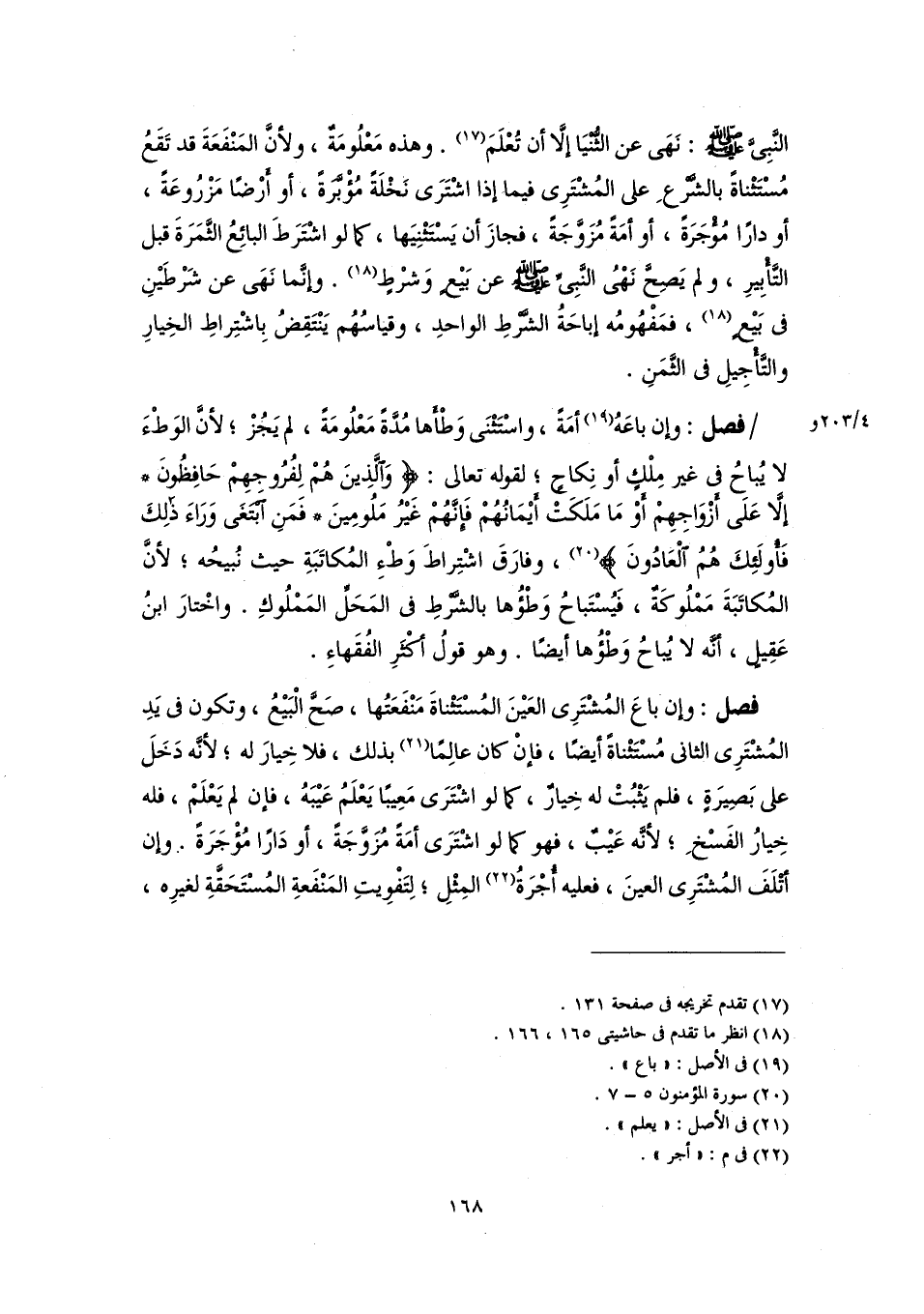 فصل: وإن باعَهُ (١٩) أمَةً، واسْتَثْنَى وَطْأَها مُدَّةً مَعْلُومَةً، لم يَجُزْ؛ لأنَّ الوَطْءَ لا يُباحُ فى غير مِلْكٍ أو نِكاحٍ؛ لقوله تعالى: {وَالَّذِينَ هُمْ لِفُرُوجِهِمْ حَافِظُونَ (٥) إِلَّا عَلَى أَزْوَاجِهِمْ أَوْ مَا مَلَكَتْ أَيْمَانُهُمْ فَإِنَّهُمْ غَيْرُ مَلُومِينَ (٦) فَمَنِ ابْتَغَى وَرَاءَ ذَلِكَ فَأُولَئِكَ هُمُ الْعَادُونَ} (٢٠)، وفارَقَ اشْتِراطَ وَطْءِ المُكاتَبَةِ حيث نُبيحُه؛ لأنَّ المُكاتَبَةَ مَمْلُوكَةٌ، فَيُسْتَباحُ وَطْؤُها بالشَّرْطِ فى المَحَلِّ المَمْلُوكِ. واخْتارَ ابنُ عَقِيلٍ، أنَّه لا يُباحُ وَطْؤُها أيضًا. وهو قولُ أَكْثَرِ الفُقَهاءِ.