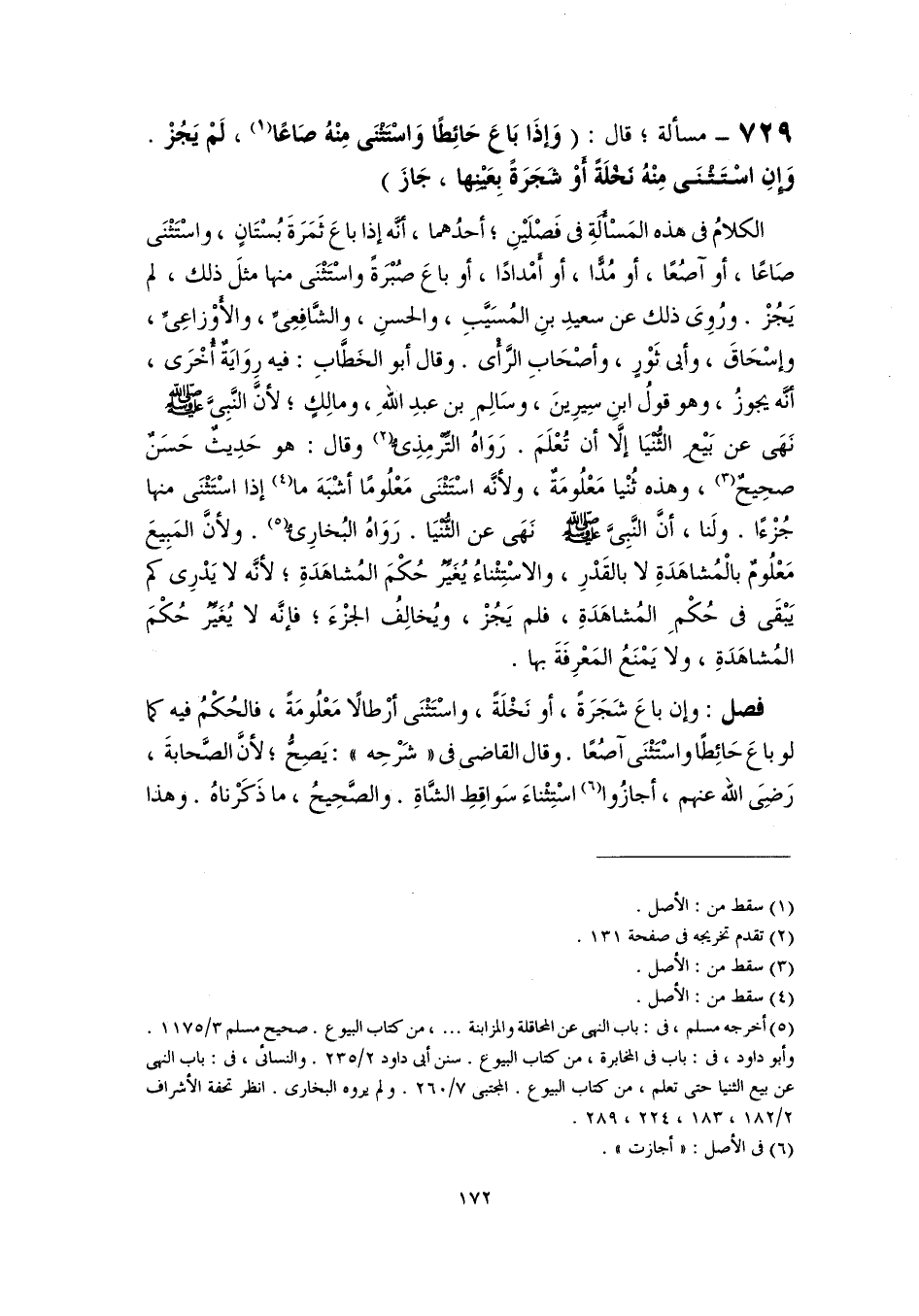٧٢٩ - مسألة؛ قال: (وَإذَا بَاعَ حَائِطًا وَاسْتَثْنَى مِنْهُ صَاعًا (١)، لَمْ يَجُزْ. وَإِنِ اسْتَثْنَى مِنْهُ نَخْلَةً أَوْ شَجَرَةً بِعَيْنِها، جَازَ)