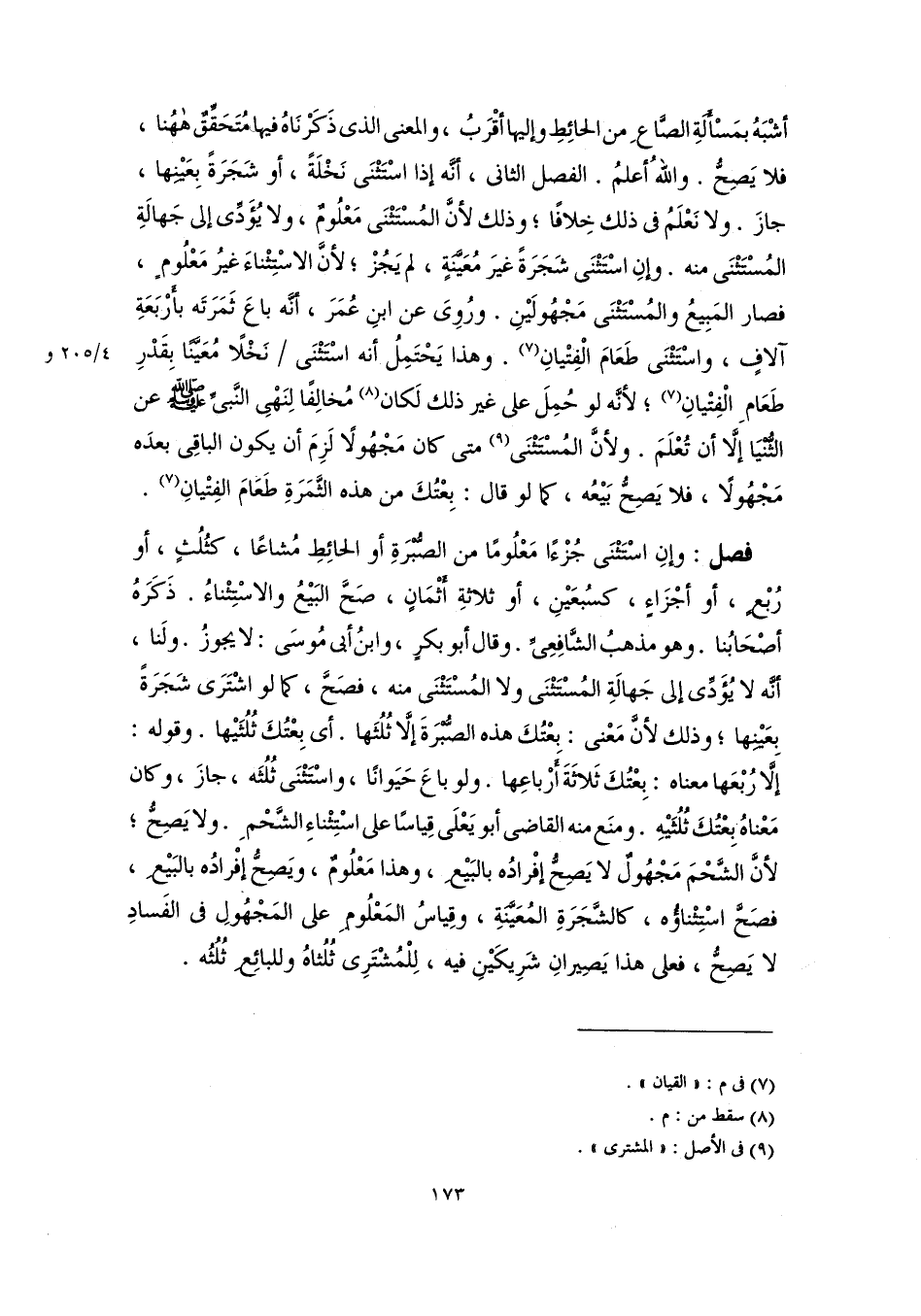 أشْبَهُ بمَسْأَلَةِ الصَّاعِ من الحائِطِ وإليها أقْرَبُ، والمعنى الذى ذَكَرْنَاهُ فيها مُتَحَقِّقٌ هاهُنا، فلا يَصِحُّ. واللهُ أعلمُ. الفصل الثاني، أَنَّه إذا اسْتَثْنَى نَخْلَةً، أو شَجَرَةً بِعَيْنِها، جازَ. ولا نَعْلَمُ فى ذلك خِلافًا؛ وذلك لأنَّ المُسْتَثْنَى مَعْلُومٌ، ولا يُؤَدِّى إلى جَهالَةِ المُسْتَثْنَى منه. وإنِ اسْتَثْنَى شَجَرَةً غيرَ مُعَيَّنَةٍ، لم يَجُزْ؛ لأنَّ الاسْتِثْناءَ غيرُ مَعْلُومٍ، فصار المَبِيعُ والمُسْتَثْنَى مَجْهُولَيْنِ. ورُوِىَ عن ابنِ عُمَرَ، أَنَّه باعَ ثَمَرَتَه بأَرْبَعَةِ آلافٍ، واسْتَثْنَى طَعَامَ الْفِتْيانِ (٧). وهذا يَحْتَمِلُ أنَّه اسْتَثْنَى نَخْلًا مُعَيَّنًا بقَدْرِ طَعَامِ الْفِتْيانِ (٧)؛ لأنَّه لو حُمِلَ على غير ذلك لَكان (٨) مُخالِفًا لِنَهْىِ النَّبيِّ -صَلَّى اللهُ عَلَيْهِ وَسَلَّمَ- عن الثُّنْيَا إلَّا أن تُعْلَمَ. ولأنَّ المُسْتَثْنَى (٩) متى كان مَجْهُولًا لَزِمَ أن يكون الباقِى بعدَه مَجْهُولًا، فلا يَصِحُّ بَيْعُه، كما لو قال: بِعْتُكَ من هذه الثَّمَرَةِ طَعَامَ الفِتْيانِ (٧).