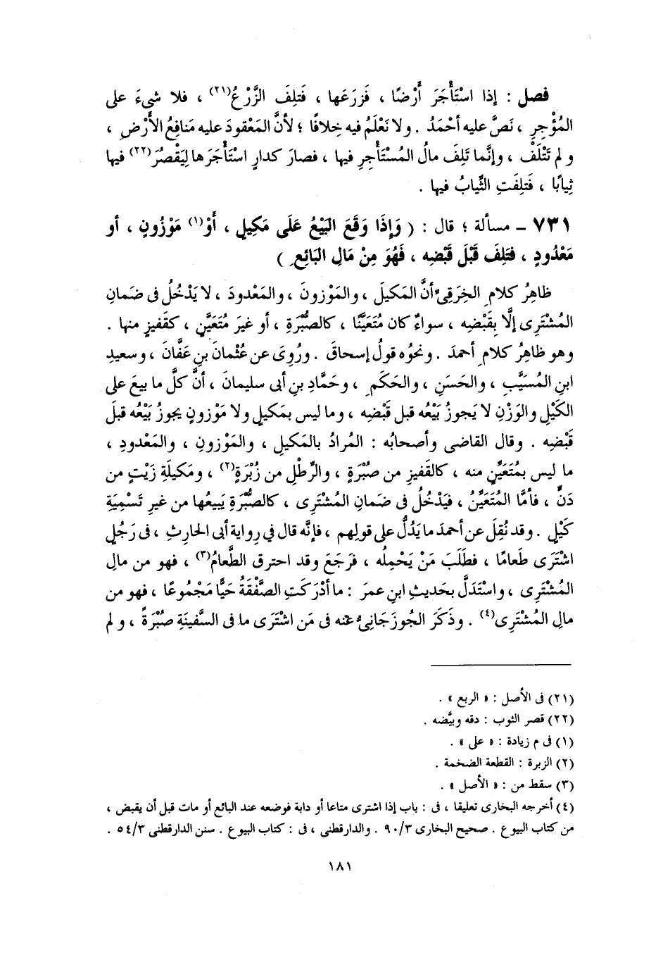 ظاهِرُ كلامِ الخِرَقِيِّ أنَّ المَكيلَ، والمَوْزونَ، والمَعْدودَ، لا يَدْخُلُ فى ضَمانِ المُشْتَرِى إلَّا بِقَبْضِه، سواءٌ كان مُتَعَيَّنًا، كالصُّبْرَةِ، أو غيرَ مُتَعَيَّنٍ، كقَفيزٍ منها. وهو ظاهِرُ كلامِ أحمدَ. ونحوُه قولُ إسحاقَ. ورُوِىَ عن عُثْمانَ بنِ عَفَّانَ، وسعيدِ ابنِ المُسَيَّبِ، والحَسَنِ، والحَكَمِ، وحَمَّادِ بنِ أبي سليمانَ، أنَّ كلَّ ما بيعَ على الكَيْلِ والوَزْنِ لا يَجوزُ بَيْعُه قبل قَبْضِه، وما ليس بمَكيلٍ ولا مَوْزونٍ يجوزُ بَيْعُه قبلَ قَبْضِه. وقال القاضى وأصحابُه: المُرادُ بالمَكيلِ، والمَوْزونِ، والمَعْدودِ، ما ليس بمُتَعَيَّنٍ منه، كالقَفيزِ من صُبْرَةٍ، والرِّطْلِ من زُبْرَةٍ (٢)، ومَكيلَةِ زَيْتٍ من دَنٍّ، فأمَّا المُتَعَيَّنُ، فيَدْخُلُ فى ضَمانِ المُشْتَرِى، كالصُّبْرَةِ يَبيعُها من غيرِ تَسْمِيَةِ كَيْلٍ. وقد نُقِلَ عن أحمدَ ما يَدُلُّ على قولِهم، فإنَّه قال في رِواية أبي الحارِثِ، فى رَجُلٍ اشْتَرَى طَعامًا، فطَلَبَ مَنْ يَحْمِلُه، فرَجَعَ وقد احترق الطَّعامُ (٣)، فهو من مالِ المُشْتَرِى، واسْتَدَلَّ بحَديثِ ابنِ عمرَ: ما أدْرَكَتِ الصَّفْقَةُ حَيًّا مَجْمُوعًا، فهو من مالِ المُشْتَرِى (٤). وذَكَرَ الجُوزَجَانِيُّ عنه فى مَن اشْتَرَى ما فى السَّفينَةِ صُبْرَةً، ولم