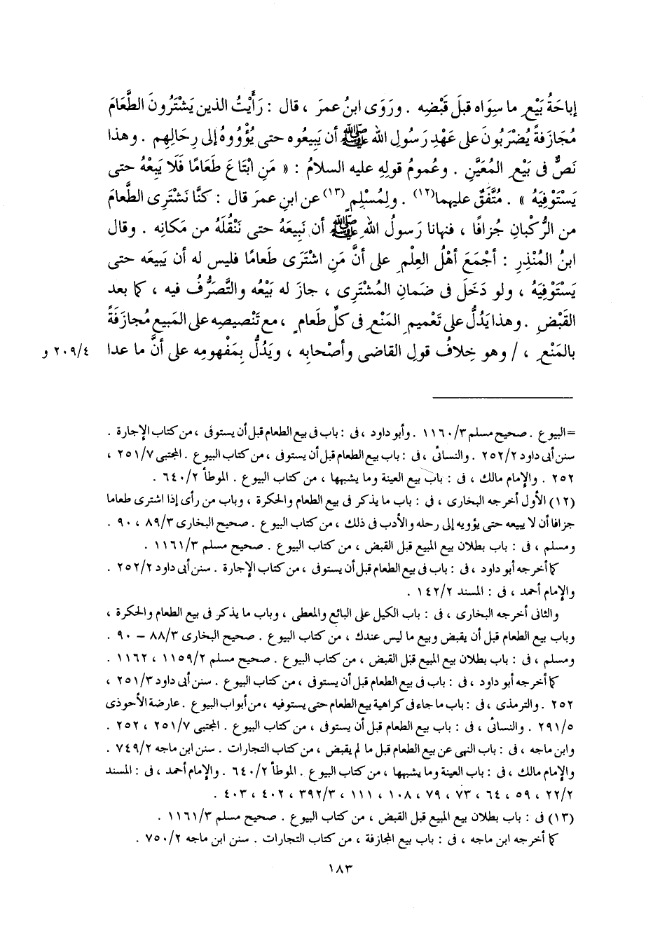 إباحَةُ بَيْعِ ما سِوَاه قبلَ قَبْضِه. ورَوَى ابنُ عمرَ، قال: رَأَيْتُ الذين يَشْتَرُونَ الطَّعَامَ مُجَازَفةً يُضْرَبُونَ على عَهْدِ رَسُولِ اللَّه -صَلَّى اللهُ عَلَيْهِ وَسَلَّمَ- أن يَبِيعُوه حتَّى يُؤْوُوهُ إلى رِحَالِهِم. وهذا نَصٌّ فى بَيْعِ المُعَيَّنِ. وعُمومُ قولِهِ عليه السلامُ: "مَنِ ابْتَاعَ طَعَامًا فَلَا يَبِعْهُ حتَّى يَسْتَوْفِيَهُ". مُتَّفَقٌ عليهما (١٢). ولِمُسْلِمٍ (١٣) عن ابنِ عمرَ قال: كنَّا نَشْتَرِى الطَّعامَ من الرُّكْبانِ جُزافًا، فنهانا رَسولُ اللهِ -صَلَّى اللهُ عَلَيْهِ وَسَلَّمَ- أن نَبِيعَهُ حتَّى نَنْقُلَهُ من مَكانِه. وقال ابنُ المُنْذِرِ: أجْمَعَ أهْلُ العِلْمِ على أنَّ مَنِ اشْتَرَى طَعامًا فليس له أن يَييعَه حتَّى يَسْتَوْفِيَهُ، ولو دَخَلَ فى ضَمانِ المُشْتَرِى، جازَ له بَيْعُه والتَّصَرُّفُ فيه، كما بعد القَبْضِ. وهذا يَدُلُّ على تَعْميمِ المَنْعِ فى كلِّ طَعامٍ، مع تَنْصيصِه على المَبيعِ مُجازَفَةً بالمَنْعِ، وهو خِلافُ قولِ القاضى وأصْحابِه، ويَدُلُّ بِمَفْهومِه على أنَّ ما عدا