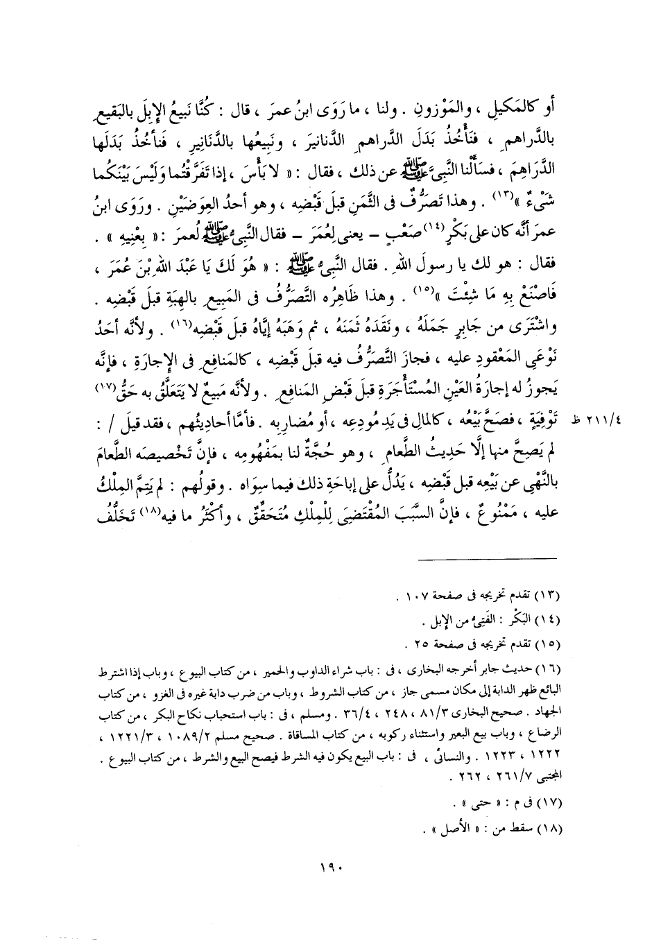 أو كالمَكيلِ، والمَوْزونِ. ولنا، ما رَوَى ابنُ عمرَ، قال: كُنَّا نَبيعُ الإِبِلَ بالبَقيعِ بالدَّراهمِ، فنَأْخُذُ بَدَلَ الدَّراهمِ الدَّنانيرَ، ونَبِيعُها بالدَّنَانِيرِ، فَنأخُذُ بَدَلَها الدَّرَاهِمَ، فسَأَلْنا النَّبِيَّ -صَلَّى اللهُ عَلَيْهِ وَسَلَّمَ- عن ذلك، فقال: "لا بَأْسَ، إذا تَفَرَّقْتُما وَلَيْسَ بَيْنَكُما شَىْءٌ" (١٣). وهذا تَصَرُّفٌ فى الثَّمَنِ قبلَ قَبْضِه، وهو أحدُ العِوَضَيْنِ. ورَوَى ابنُ عمرَ أنَّه كان على بَكْرٍ (١٤) صَعْبٍ -يعنى لِعُمَرَ- فقال النَّبِيُّ -صَلَّى اللهُ عَلَيْهِ وَسَلَّمَ- لُعمرَ: "بِعْنِيهِ". فقال: هو لك يا رسولَ اللهِ. فقال النَّبِيُّ -صَلَّى اللهُ عَلَيْهِ وَسَلَّمَ-: "هُوَ لَكَ يَا عَبْدَ اللهِ بْنَ عُمَرَ، فَاصْنَعْ بِهِ مَا شِئْتَ" (١٥). وهذا ظَاهِرُه التَّصَرُّفُ فى المَبِيعِ بالهِبَةِ قبلَ قَبْضِه. واشْتَرَى من جَابِرٍ جَمَلَهُ، ونَقَدَهُ ثَمَنَهُ، ثمَّ وَهَبَهُ إيَّاهُ قبلَ قَبْضِه (١٦). ولأنَّه أحَدُ نَوْعَىِ المَعْقودِ عليه، فجازَ التَّصَرُّفُ فيه قبلَ قَبْضِه، كالمَنافِعِ فى الإجارَةِ، فإنَّه يَجوزُ له إجارَةُ العَيْنِ المُسْتَأْجَرَةِ قبلَ قَبْضِ المَنافِعِ. ولأنَّه مَبيعٌ لا يَتَعَلَّقُ به حَقُّ (١٧) تَوْفِيَةٍ، فصَحَّ بَيْعُه، كالمالِ فى يَدِ مُودِعِه، أو مُضارِبِه. فأمَّا أحادِيثُهم، فقد قيلَ: لم يَصِحَّ منها إلَّا حَدِيثُ الطَّعامِ، وهو حُجَّةٌ لنا بمَفْهُومِه، فإنَّ تَخْصيصَه الطَّعامَ بالنَّهْىِ عن بَيْعِه قبل قَبْضِه، يَدُلُّ على إباحَةِ ذلك فيما سِوَاه. وقولُهم: لم يَتِمَّ المِلْكُ عليه، مَمْنُوعٌ، فإنَّ السَّبَبَ المُقْتَضِىَ لِلْمِلْكِ مُتَحَقِّقٌ، وأكْثَرُ ما فيه (١٨) تَخَلُّفُ