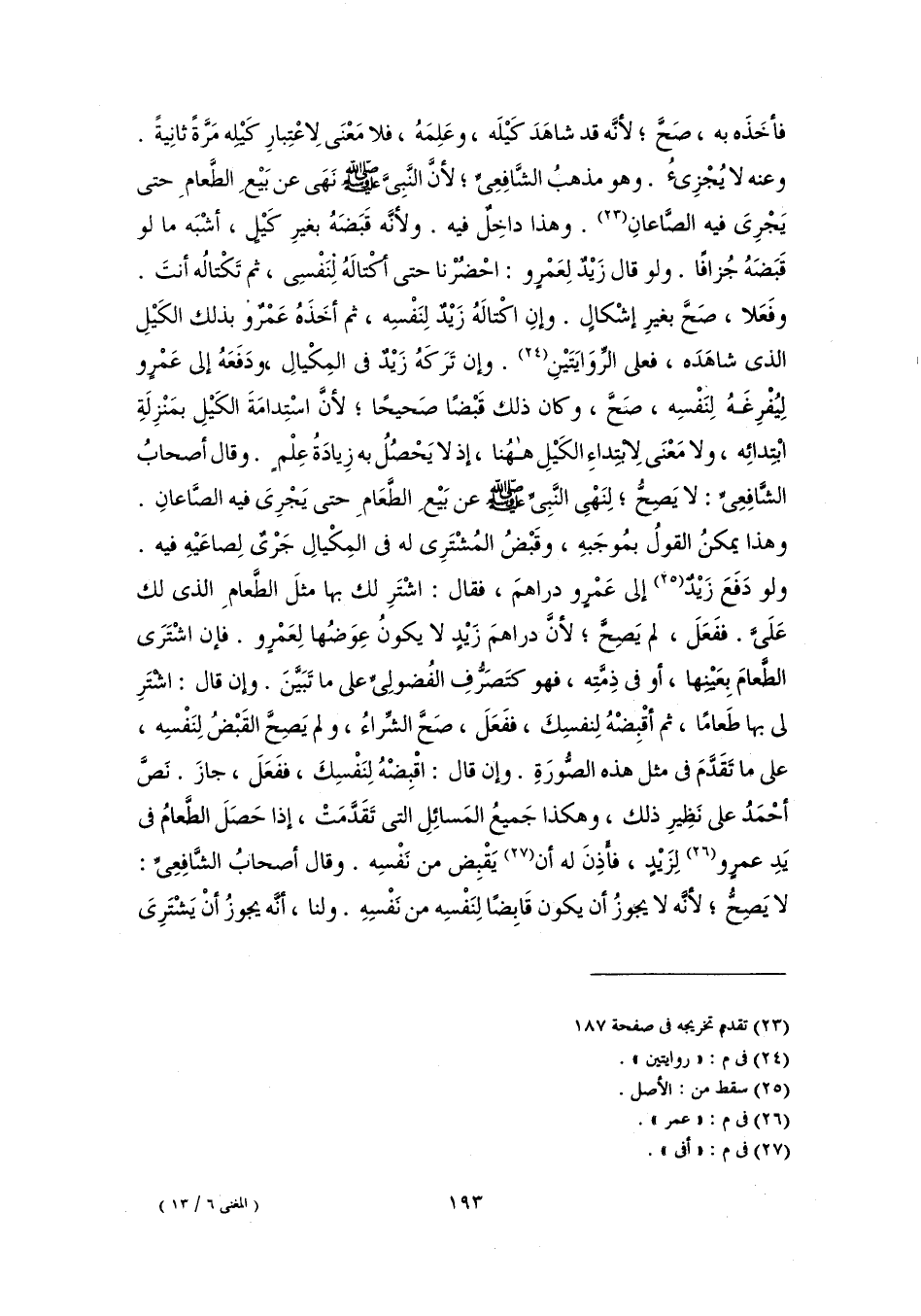 فأخَذَه به، صَحَّ؛ لأنَّه قد شاهَدَ كَيْلَه، وعَلِمَهُ، فلا مَعْنَى لِاعْتِبارِ كَيْلِه مَرَّةً ثانِيةً. وعنه لا يُجْزِىءُ. وهو مذهبُ الشَّافِعِيِّ؛ لأنَّ النَّبِيَّ -صَلَّى اللهُ عَلَيْهِ وَسَلَّمَ- نَهَى عن بَيْعِ الطَّعامِ حتَّى يَجْرِىَ فيه الصَّاعانِ (٢٣). وهذا داخِلٌ فيه. ولأنَّه قَبَضَهُ بغيرِ كَيْلٍ، أشْبَه ما لو قَبَضَهُ جُزافًا. ولو قال زَيْدٌ لِعَمْرٍو: احْضُرْنا حتَّى أكْتالَهُ لِنَفْسِى، ثمَّ تَكْتالُه أنتَ. وفَعَلا، صَحَّ بغيرِ إشْكالٍ. وإنِ اكْتالَهُ زَيْدٌ لِنَفْسِه، ثمَّ أخَذَهُ عَمْرٌو بذلك الكَيْلِ الذى شاهَدَه، فعلى الرِّوَايَتَيْنِ (٢٤). وإن تَرَكَهُ زَيْدٌ فى المِكْيالِ، ودَفَعَهُ إلى عَمْرٍو لِيُفْرِغَهُ لِنَفْسِه، صَحَّ، وكان ذلك قَبْضًا صَحيحًا؛ لأنَّ اسْتِدامَةَ الكَيلِ بمَنْزِلَةِ ابْتِدائِه، ولا مَعْنَى لِابْتِداءِ الكَيْلِ هاهُنا، إذ لا يَحْصُلُ به زِيادَةُ عِلْمٍ. وقال أصحابُ الشَّافِعِيِّ: لا يَصِحُّ؛ لِنَهْىِ النَّبِيِّ -صَلَّى اللهُ عَلَيْهِ وَسَلَّمَ- عن بَيْعِ الطَّعَامِ حتَّى يَجْرِىَ فيه الصَّاعانِ. وهذا يمكنُ القولُ بمُوجَبهِ، وقَبْضُ المُشْتَرِى له فى المِكْيالِ جَرْىٌ لِصاعَيْهِ فيه. ولو دَفَعَ زَيْدٌ (٢٥) إلى عَمْرٍو دراهمَ، فقال: اشْتَرِ لك بها مثلَ الطَّعامِ الذى لك عَلَيَّ. ففَعَلَ، لم يَصِحَّ؛ لأنَّ دراهمَ زَيْدٍ لا يكونُ عِوَضُها لِعَمْرٍو. فإن اشْتَرَى الطَّعامَ بِعَيْنِها، أو فى ذِمَّتِه، فهو كتَصَرُّفِ الفُضولِيِّ على ما تَبَيَّنَ. وإن قال: اشْتَرِ لى بها طَعامًا، ثمَّ أقْبِضْهُ لِنفسِكَ، ففَعَلَ، صَحَّ الشِّراءُ، ولم يَصِحَّ القَبْضُ لِنَفْسِه، على ما تَقَدَّمَ فى مثل هذه الصُّورَةِ. وإن قال: اقْبِضْهُ لِنَفْسِكَ، ففَعَلَ، جازَ. نَصَّ أحْمَدُ على نَظِيرِ ذلك، وهكذا جَميعُ المَسائِلِ التى تَقَدَّمَتْ، إذا حَصَلَ الطَّعامُ فى يَدِ عمرٍو (٢٦) لِزَيْدٍ، فأَذِنَ له أن (٢٧) يَقْبِض من نَفْسِه. وقال أصحابُ الشَّافِعِيِّ: لا يَصِحُّ؛ لأنَّه لا يجوزُ أن يكون قَابِضًا لِنَفْسِه من نَفْسِهِ. ولنا، أنَّه يجوزُ أنْ يَشْتَرِىَ
