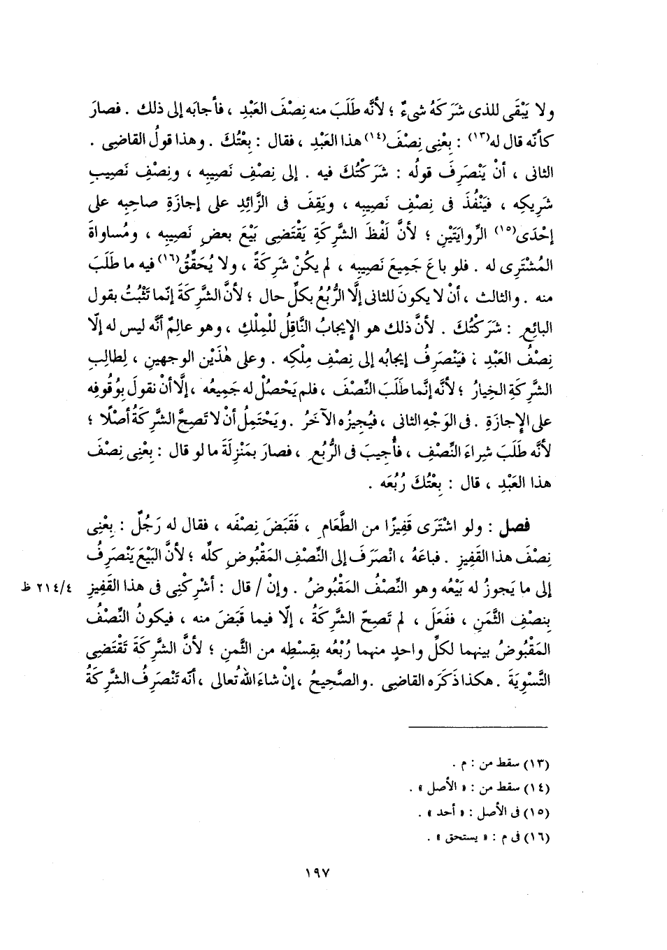 ولا يَبْقَى للذى شَرَكَهُ شىءٌ، لأنَّه طَلَبَ منه نِصْفَ العَبْدِ، فأجابَه إلى ذلك. فصارَ كأنّه قال له (١٣): بِعْنِى نِصْفَ (١٤) هذا العَبْدِ، فقال: بِعْتُكَ. وهذا قولُ القاضِى. الثانى، أنْ يَنْصَرِفَ قولُه: شَرَكْتُكَ فيه. إلى نِصْفِ نَصِيبِه، ونِصْفِ نَصِيبِ شَرِيكِه، فيَنْفُذَ فى نِصْفِ نَصِيبِه، ويَقِفَ فى الزَّائِدِ على إجازَةِ صاحِبِه على إحْدَى (١٥) الرِّوايَتَيْنِ؛ لأنَّ لَفْظَ الشَّرِكَةِ يَقْتَضِى بَيْعَ بعضِ نَصِيبِه، ومُساواةَ المُشْتَرِى له. فلو باعَ جَمِيعَ نَصِيبِه، لم يكُنْ شَرِكَةً، ولا يُحَقِّقُ (١٦) فيه ما طَلَبَ منه. والثالث، أنْ لا يكونَ للثانى إلَّا الرُّبُعُ بكلِّ حال؛ لأنَّ الشَّرِكَةَ إنّما تَثْبُتُ بقول البائِعِ: شَرَكْتُكَ. لأنَّ ذلك هو الإِيجابُ النَّاقِلُ للْمِلْكِ، وهو عالِمٌ أنَّه ليس له إلّا نِصْفُ العَبْدِ، فيَنْصَرِفُ إيجابُه إلى نِصْفِ مِلْكِه. وعلى هذَيْن الوجهينِ، لِطالِبِ الشَّرِكَةِ الخِيارُ؛ لأنَّه إنَّما طَلَبَ النِّصْفَ، فلم يَحْصُلْ له جَمِيعُه، إلَّا أنْ نقولَ بِوُقُوفِه على الإِجازَةِ. فى الوَجْهِ الثانى، فيُجِيزُه الآخَرُ. ويَحْتَمِلُ أنْ لا تَصِحَّ الشَّرِكَةُ أصْلًا؛ لأنَّه طَلَبَ شِراءَ النِّصْفِ، فأُجِيبَ فى الرُّبُعِ، فصارَ بمَنْزِلَةَ ما لو قال: بِعْنِى نِصْفَ هذا العَبْدِ، قال: بِعْتُكَ رُبُعَه.