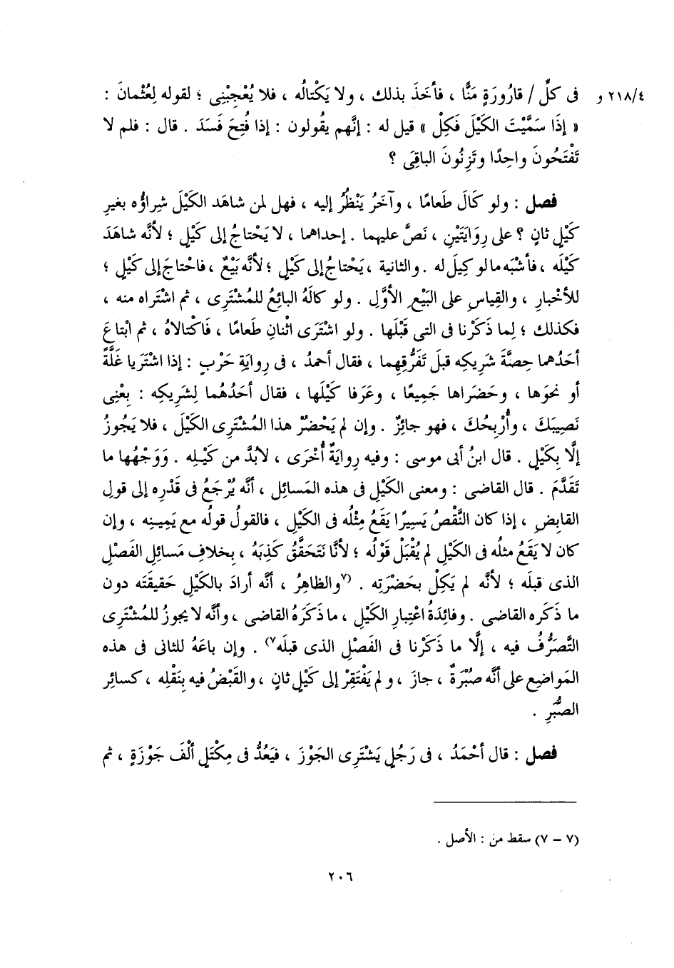 فصل: ولو كَالَ طَعامًا، وآخَرُ يَنْظُرُ إليه، فهل لمن شاهَد الكَيْلَ شِراؤُه بغيرِ كَيْلٍ ثانٍ؛ على رِوَايَتَيْنِ، نَصَّ عليهما. إحداهما، لا يَحْتاجُ إلى كَيْلٍ؛ لأنَّه شاهَدَ كَيْلَه، فأشْبَه ما لو كِيلَ له. والثانية، يَحْتاجُ إلى كَيْلٍ؛ لأنَّه بَيْعٌ، فاحْتاجَ إلى كَيْلٍ؛ للأخْبارِ، والقِياسِ على البَيْعِ الأوَّلِ. ولو كالَهُ البائِعُ للمُشْتَرِى، ثم اشْتَراه منه، فكذلك؛ لِما ذَكَرْنا فى التىِ قَبْلَها. ولو اشْتَرَى اثْنانِ طَعامًا، فَاكْتالاهُ، ثم ابْتاعَ أحَدُهما حِصَّةَ شَرِيكِه قبلَ تَفرُّقِهِما، فقال أحمدُ، فى رِوايَةِ حَرْبٍ: إذا اشْتَرَيا غَلَّةً أو نحوَها، وحَضَراها جَمِيعًا، وعَرَفا كَيْلَها، فقال أحَدُهُما لِشَرِيكِه: بِعْنِى نَصِيبَكَ، وأُرْبِحُكَ، فهو جائِزٌ. وإن لم يَحْضُرْ هذا المُشْتَرِى الكَيْلَ، فلا يَجُوزُ إلَّا بِكَيْلٍ. قال ابنُ أبي موسى: وفيه رِوايَةٌ أُخْرَى، لا بُدَّ من كَيْلِه. وَوَجْهُها ما تَقَدَّمَ. قال القاضى: ومعنى الكَيْلِ فى هذه المَسائِل، أنَّه يُرْجَعُ فى قَدْرِه إلى قولِ القابِضِ، إذا كان النَّقْصُ يَسِيرًا يَقَعُ مِثْلُه فى الكَيْلِ، فالقولُ قولُه مع يَمِينِه، وإن كان لا يَقَعُ مثلُه فى الكَيْلِ لم يُقْبَلْ قَوْلُه؛ لأنَّا نَتَحَقَّقُ كَذِبَهُ، بِخلافِ مَسائِلِ الفَصْلِ الذى قبلَه؛ لأنَّه لم يَكِلْ بحَضْرَتِه. [والظاهِرُ، أنَّه أرادَ بالكَيْلِ حَقيقَتَه دون ما ذَكَره القاضى. وفائِدَةُ اعْتِبارِ الكَيْلِ، ما ذَكَرهُ القاضى، وأنَّه لا يجوزُ للمُشْتَرِى التَّصَرُّفُ فيه، إلَّا ما ذَكَرْنا فى الفَصْلِ الذى قبلَه] (٧). وإن باعَهُ للثانى فى هذه المَواضِع على أنَّه صُبْرَةٌ، جازَ، ولم يَفْتَقِرْ إلى كَيْلٍ ثانٍ، والقَبْضُ فيه بِنَقْلِه، كسائِر الصُّبَرِ.