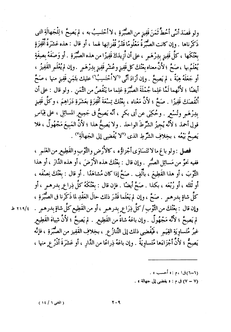 فصل: ولو باعَ ما لا تَتَسَاوَى أجْزاؤُه، كالأَرْضِ والثَّوْبِ والقَطِيعِ من الغَنَمِ، ففيه نحوٌ من مَسائِل الصُّبَرِ. وإن قال: بِعْتُكَ هذه الأرْضَ، أو هذه الدَّارَ، أو هذا الثَّوْبَ، أو هذا القَطِيعَ، بأَلْفٍ. صَحَّ إذا كان مُشاهَدًا. أو قال: بِعْتُكَ نِصْفَه، أو ثُلثَه، أو رُبْعَه، بكذا. صَحَّ أيضًا. فإن قال: بِعْتُكَهُ كلَّ ذِراعٍ بِدرهمٍ، أو كلَّ شاةٍ بِدرهمٍ. صَحَّ، وإن لم يَعْلَما قَدْرَ ذلك حالَ العَقْدِ لما ذَكَرْنا في الصُّبْرَةِ، وإن قال: بِعْتُكَ من الثَّوْبِ كلَّ ذِرَاعٍ بِدرهمٍ، أو من القَطِيع كلَّ شاةٍ بِدرهمٍ. لم يَصِحَّ؛ لأنَّه مَجْهُولٌ. وإن باعَهُ شاةً من القَطِيعِ. لم يَصِحَّ؛ لأنَّ شِياهَ القَطِيعِ غيرُ مُتَساوِيَةِ القِيَمِ، فَيْفُضِى ذلك إلى التَّنازُعِ، بخِلافِ القَفِيز من الصُّبْرَةِ، فإنَّه يَصِحُّ؛ لأنَّ أجْزَاءَها مُتَساوِيَةٌ. وإن باعَهُ ذِراعًا من الدَّارِ، أو عَشَرَةَ أذْرُعٍ منها،