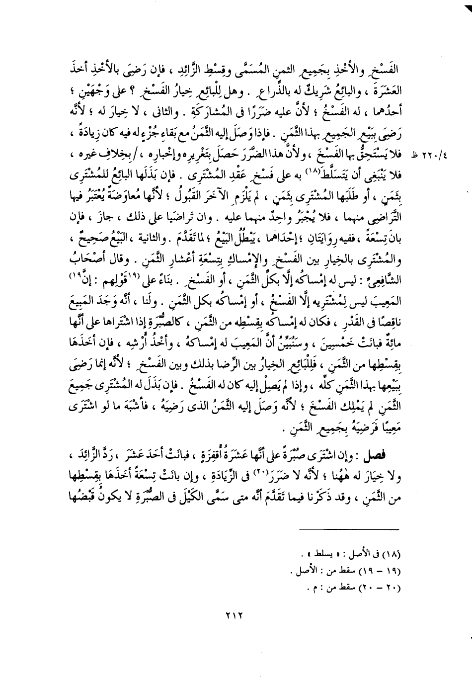 الفَسْخِ والأخْذِ بِجَمِيعِ الثمنِ المُسَمَّى وقِسْطِ الزَّائِدِ، فإن رَضِىَ بالأخْذِ أخذَ العَشَرَةَ، والبائِعُ شَرِيكٌ له بالذِّراعِ. وهل لِلْبائِعِ خِيارُ الفَسْخِ؟ على وَجْهَيْنِ؛ أحدُهما، له الفَسْخُ؛ لأنَّ عليه ضَرَرًا في المُشارَكَةِ. والثاني، لا خِيارَ له؛ لأنَّه رَضِىَ بِبَيْعِ الجَمِيعِ بهذا الثَّمَنِ. فإذا وَصَلَ إليه الثَّمَنُ مع بَقاءِ جُزْءٍ له فيه كان زِيادَةً، فلا يَسْتَحِقُّ بها الفَسْخَ، ولأنَّ هذا الضَّرَرَ حَصَلَ بِتَغْرِيرِه وإخْبارِه، بِخِلافِ غيره، فلا يَنْبَغِى أن يَتَسَلَّطَ (١٨) به على فَسْخِ عَقْدِ المُشْتَرِي. فإن بَذَلَها البائِعُ للمُشْتَرِى بِثَمَنٍ، أو طَلَبَها المُشْتَرِي بِثَمَنٍ، لم يَلْزَمِ الآخَرَ القَبُولُ؛ لأنَّها مُعاوَضَةٌ يُعْتَبَرُ فيها التَّرَاضِى منهما، فلا يُجْبَرُ واحِدٌ منهما عليه. وان تَراضَيا على ذلك، جازَ، فإن بانَ تِسْعَةً، ففيه رِوَايَتَانِ؛ إحْدَاهما، يَبْطُلُ البَيْعُ؛ لما تَقَدَّمَ. والثانية، البَيْعُ صَحِيحٌ، والمُشْتَرِى بالخِيارِ بين الفَسْخِ والإمْساكِ بِتِسْعَةِ أعْشارِ الثَّمَنِ. وقال أصْحَابُ الشَّافِعِيِّ: ليس له إمْساكُه إلَّا بكلِّ الثَّمَنِ، أو الفَسْخِ. بنَاءً على [قَوْلِهم: إنَّ] (١٩) المَعِيبَ ليس لِمُشْتَرِيه إلَّا الفَسْخُ، أو إمْساكُه بكل الثَّمَنِ. ولَنا، أنَّه وَجَدَ المَبيعَ ناقِصًا في القَدْرِ، فكان له إمْساكُه بِقِسْطِه من الثَّمَنِ، كالصُّبْرَةِ إذا اشْتَراها على أنَّها مائِةٌ فبانَتْ خَمْسِينَ، وسَنُبَيِّنُ أنَّ المَعِيبَ له إمْساكهُ، وأخْذُ أرْشِه، فإن أخَذَهَا بِقِسْطِها من الثَّمَنِ، فَلِلْبَائِعِ الخِيارُ بين الرِّضا بذلك وبين الفَسْخِ؛ لأنَّه إنما رَضِىَ بِبَيْعِها بهذا الثَّمَنِ كلِّه، وإذا لم يَصِلْ إليه كان له الفَسْخُ. فإن بَذَلَ له المُشْتَرِي جَمِيعَ الثَّمَنِ لم يَمْلِك الفَسْخَ؛ لأنَّه وَصَلَ إليه الثَّمَنُ الذى رَضِيَهُ، فأشْبَهَ ما لو اشْتَرَى مَعِيبًا فَرَضِيَهُ بِجَمِيعِ الثَّمَنِ.