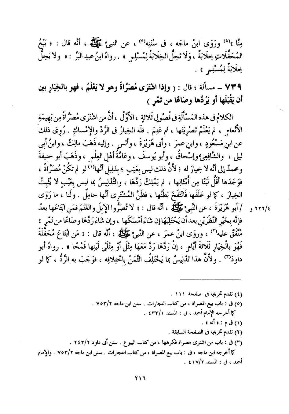 الكلامُ في هذه المَسْأَلَةِ في فُصُولٍ ثَلاثةٍ، الأوَّلُ، أنَّ من اشْتَرَى مُصَرَّاةً مِن بَهِيمَةِ الأنعامِ، لم يَعْلَمْ تَصْرِيَتَها، ثم عَلِمَ. فلَه الخِيارُ في الرَّدِّ والإمْساكِ. رُوِىَ ذلك عن ابنِ مَسْعُودٍ، وابنِ عمرَ، وأبى هُرَيْرَةَ، وأنَسٍ. وإليه ذَهَبَ مالِكٌ، وابنُ أبِى ليلى، والشَّافِعِيُّ وإسْحاقُ، وأبو يُوسفَ، وعَامَّةُ أهْلِ العِلْمِ، وذَهَبَ أبو حنيفةَ ومحمدٌ إلى أنَّه لا خِيارَ له؛ لأنَّ ذلك ليس بِعَيْبٍ؛ بِدَلِيلِ أنَّها (١) لو لم تكُنْ مُصَرَّاةً، فوَجَدَها أقَلَّ لَبَنًا مِن أمْثَالِها، لم يَمْلِكْ رَدَّهَا، والتَّدْلِيسُ بما ليس بِعَيْبٍ لا يُثْبِتُ الخِيارَ، كما لو عَلَفَها فَانتفَخَ بَطْنُها، فظَنَّ المُشْتَرِي أنَّها حامِلٌ. ولَنا، ما رَوَى أبو هُرَيْرَةَ، عن النَّبِيِّ -صَلَّى اللهُ عَلَيْهِ وَسَلَّمَ-، أنَّه قال: "لا تُصَرُّوا الإبِلَ والغَنَمَ فمَنِ ابْتَاعَها بعدُ فإنَّه بِخَيْرِ النَّظَرَيْنِ بعد أن يَحْتَلِبَهَا إن شَاءَ أمْسَكَها، وإن شَاءَ رَدَّهَا وصَاعًا من تَمْرٍ" مُتَّفَقٌ عليه (٢)، وروَى ابنُ عمرَ، عن النَّبيِّ -صَلَّى اللهُ عَلَيْهِ وَسَلَّمَ-، أنَّه قال: "مَن ابْتَاعَ مُحَفَّلَةً فَهُوَ بالْخِيَارِ ثَلَاثةَ أيَّامٍ، إنْ رَدَّهَا رَدَّ مَعَهَا مِثْلَ أوْ مِثْلَيْ لَبَنِها قَمْحًا". رواهُ أبو داودَ (٣). ولأنَّ هذا تَدْلِيسٌ بما يَخْتَلِفُ الثَّمَنُ بِاخْتِلافِه، فوَجَبَ به الرَّدُّ، كما لو
