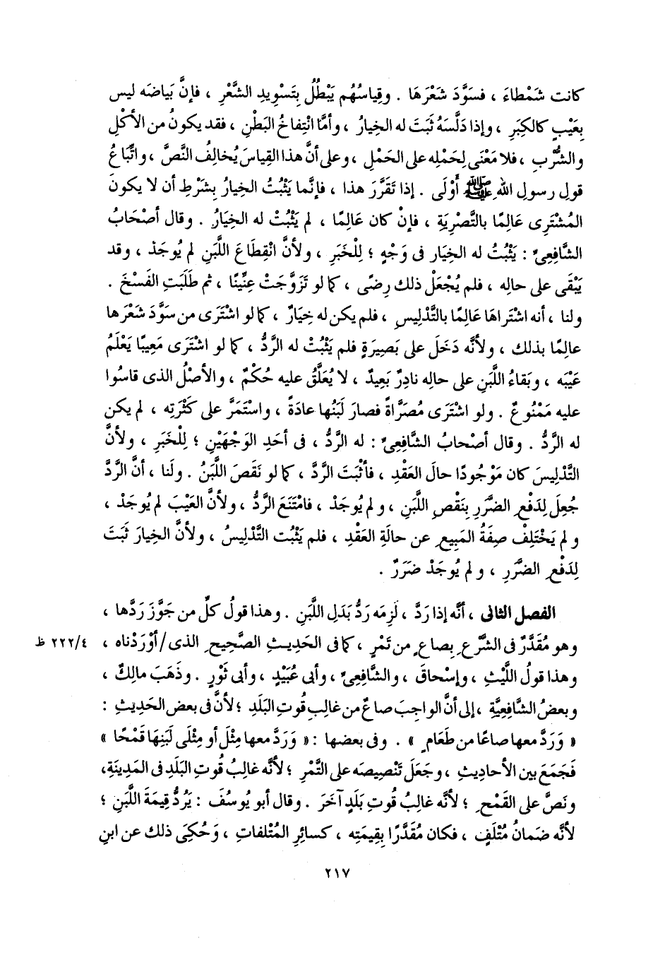 الفصل الثاني، أنَّه إذا رَدَّ، لَزِمَه رَدُّ بَدَلِ اللَّبَنِ. وهذا قولُ كلِّ من جَوَّزَ رَدَّها، وهو مُقَدَّرٌ في الشَّرْعِ بِصاعٍ من تَمْرٍ، كما في الحَدِيثِ الصَّحِيحِ الذى أوْرَدْناه، وهذا قولُ اللَّيْثِ، وإسْحاقَ، والشَّافِعِيِّ، وأبى عُبَيْدٍ، وأبى ثَوْرٍ. وذَهَبَ مالِكٌ، وبعضُ الشَّافِعِيَّةِ، إلى أنَّ الواجِبَ صاعٌ من غالِبِ قُوتِ البَلَدِ؛ لأنَّ في بعض الحَدِيثِ: "وَرَدَّ معها صاعًا من طَعَامٍ". وفي بعضها: "وَرَدَّ معها مِثْلَ أو مِثْلَى لَبَنِهَا قَمْحًا" فَجَمَعَ بين الأحادِيثِ، وجَعَلَ تَنْصِيصَه على التَّمْرِ؛ لأْنَّه غالِبُ قُوتِ البَلَدِ في المَدِينَةِ، ونَصَّ على القَمْحِ؛ لأنَّه غالِبُ قُوتِ بَلَدٍ آخَرَ. وقال أبو يُوسُفَ: يَرُدُّ قِيمَةَ اللَّبَنِ؛ لأنَّه ضَمانُ مُتْلَفٍ، فكان مُقَدَّرًا بِقِيمَتِه، كسائِرِ المُتْلفاتِ، وَحُكِىَ ذلك عن ابنِ