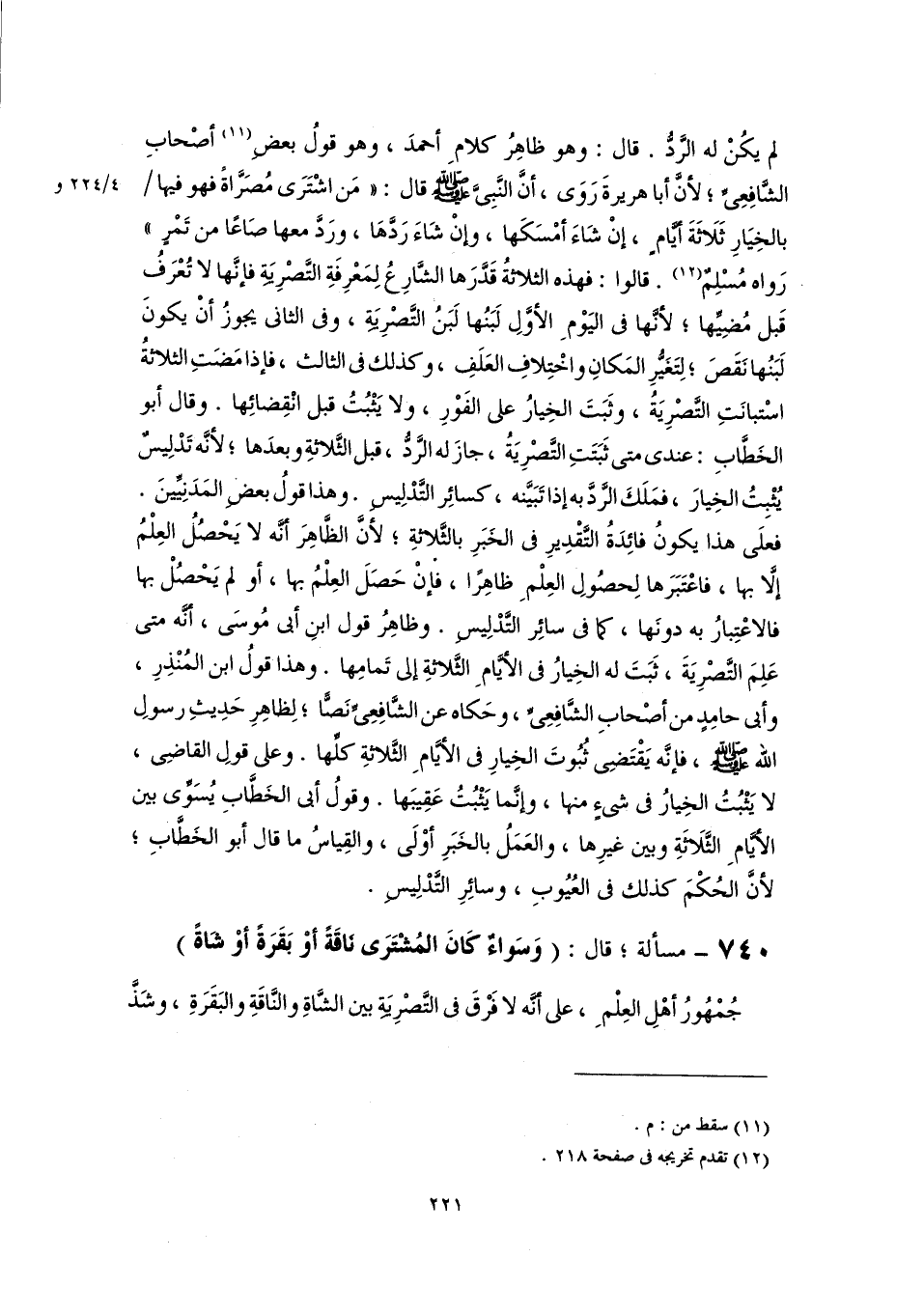 لم يكُنْ له الرَّدُّ. قال: وهو ظاهِرُ كلامِ أحمدَ، وهو قولُ بعضِ (١١) أصْحابِ الشَّافِعِيِّ؛ لأنَّ أبا هريرةَ رَوَى، أنَّ النَّبِىَّ -صَلَّى اللهُ عَلَيْهِ وَسَلَّمَ- قال: "مَن اشْتَرَى مُصَرَّاةً فهو فيها بالخِيَارِ ثَلَاثَةَ أيَّامٍ، إنْ شَاءَ أمْسَكَها، وإنْ شَاءَ رَدَّهَا، ورَدَّ معها صَاعًا من تَمْرٍ" رَواه مُسْلِمٌ (١٢). قالوا: فهذه الثلاثةُ قَدَّرَها الشَّارِعُ لِمَعْرِفَةِ التَّصْرِيَةِ فإنَّها لا تُعْرَفُ قَبل مُضِيِّها؛ لأنَّها في اليَوْمِ الأوَّلِ لَبَنُها لَبَنُ التَّصْرِيَةِ، وفي الثاني يجوزُ أنْ يكونَ لَبَنُها نَقَصَ؛ لِتَغَيُّرِ المَكانِ واخْتِلافِ العَلَفِ، وكذلك في الثالث، فإذا مَضَتِ الثلاثةُ اسْتبانَتِ التَّصْرِيَةُ، وثَبَتَ الخِيارُ على الفَوْرِ، ولا يَثْبُتُ قبل انْقِضائِها. وقال أبو الخَطَّابِ: عندى متى ثَبَتَتِ التَّصْرِيَةُ، جازَ له الرَّدُّ، قبل الثَّلاثةِ وبعدَها؛ لأنَّه تَدْلِيسٌ يُثْبِتُ الخِيارَ، فمَلَكَ الرَّدَّ به إذا تَبَيَّنه، كسائِر التَّدْلِيسِ. وهذا قولُ بعضِ المَدَنِيِّينَ. فعلَى هذا يكونُ فائِدَةُ التَّقْدِيرِ في الخَبَرِ بالثَّلاثةِ؛ لأنَّ الظَّاهِرَ أنَّه لا يَحْصُل العِلْمُ إلَّا بها، فاعْتَبَرَها لِحصُولِ العِلْمِ ظاهِرًا، فإنْ حَصَلَ العِلْمُ بها، أو لم يَحْصُلْ بها فالاعْتِبارُ به دونَها، كما في سائِر التَّدْلِيسِ. وظاهِرُ قول ابنِ أبي مُوسَى، أنَّه متى عَلِمَ التَّصْرِيَةَ، ثَبَتَ له الخِيارُ في الأيَّامِ الثَّلاثةِ إلى تَمامِها. وهذا قولُ ابن المُنْذِرِ، وأبى حامِدٍ من أصْحابِ الشَّافِعِيِّ، وحَكاه عن الشَّافِعِيِّ نَصًّا؛ لِظاهِرِ حَدِيثِ رسولِ اللَّه -صَلَّى اللهُ عَلَيْهِ وَسَلَّمَ-، فإنَّه يَقْتَضِي ثُبُوتَ الخِيارِ في الأَيامِ الثَّلاثةِ كلها. وعلى قولِ القاضِى، لا يَثْبُتُ الخِيارُ في شىءٍ منها، وإنَّما يَثْبُتُ عَقِيبَها. وقولُ أبي الخَطَّابِ يُسَوِّى بين الأَيَّامِ الثَّلَاثةِ وبين غيرِها، والعَمَلُ بالخَبَرِ أوْلَى، والقِياسُ ما قال أبو الخَطَّابِ؛ لأنَّ الحُكْمَ كذلك في العُيُوبِ، وسائِرِ التَّدْلِيسِ.
