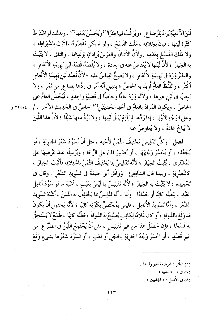 فصل: وكلُّ تَدْلِيسٍ يَخْتَلِفُ الثَّمَنُ لأجْلِه، مثل أنْ يُسَودَ شَعْرَ الجارِيَةِ، أو يُجَعِّدَه، أو يُحَمِّرَ وَجْهَهَا، أو يُضْمِرَ الماءَ على الرَّحَا، ويُرْسِلَه عندَ عَرْضِهَا على المُشْتَرِي، يُثْبِتُ الخِيَارَ؛ لأنَّه تَدْلِيسٌ بما يَخْتَلِفُ الثَّمَنُ بِاخْتِلافِه فأثْبَتَ الخِيارَ، كالتَّصْرِيَةِ، وبهذا قال الشَّافِعِيُّ. وَوافَقَ أبو حنيفةَ في تَسْوِيدِ الشَّعْرِ. وقال في تَجْعِيدِه: لا يَثْبُتُ به الخِيارُ؛ لأنَّه تَدْلِيسٌ بما لَيْسَ بِعَيْبٍ، أشْبَهَ ما لو سَوَّدَ أنامِلَ العَبْدِ، لِيَظُنَّه كاتِبًا أو حَدَّادًا. ولَنا، أنَّه تَدْلِيسٌ بما يَخْتَلِفُ به الثَّمَنُ، أشْبَهَ تَسْوِيدَ الشَّعْرِ، وأمَّا تَسْوِيدُ الأنامِلِ، فليس بمُخْتَصٍّ بِكَوْنِه كاتِبًا؛ لأنَّه يَحتمِل أنْ يكونَ قد وَلَغَ بالدَّواةِ، أو كان غُلامًا لِكاتِبٍ يُصْلِحُ له الدَّواةَ، فظَنُّه كاتِبًا، طَمَعٌ لا يَسْتَحِقُّ به فَسْخًا، فإن حَصَل هذا من غيرِ تَدْلِيسٍ، مثل أنْ يَجْتَمِعَ اللَّبَنُ في الضَّرْعِ من غيرِ قَصْدٍ، أو احْمَرَّ وَجْهُ الجارِيَةِ لِخَجَلٍ أو تَعَبٍ، أو تَسَوَّدَ شَعْرُها بشىءٍ وَقَعَ