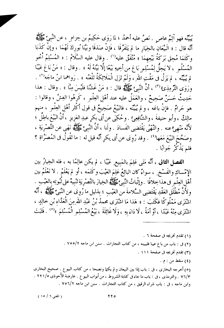 الفصل الثاني، أنَّه مَتَى عَلِمَ بالمَبِيعِ عَيْبًا، لم يكن عالِمًا به، فله الخِيارُ بين الإمْساكِ والفَسْخِ، سواءٌ كان البائِعُ عَلِمَ العَيْبَ وكَتَمَه، أو لم يَعْلَمْ. لا نَعْلَمُ بين أهْلِ العِلْمِ في هذا خِلافًا. وإثْباتُ النَّبِىِّ -صَلَّى اللهُ عَلَيْهِ وَسَلَّمَ- الخِيارَ بالتَّصْرِيَةِ تَنْبِيهٌ على ثُبُوتِه بالعَيْبِ. ولأنَّ مُطْلَقَ العَقْدِ يَقْتَضِى السَّلامةَ من العَيْبِ، بِدَليل ما رُوِىَ عن النَّبِيِّ -صَلَّى اللهُ عَلَيْهِ وَسَلَّمَ-، أنَّه اشْتَرَى مَمْلُوكًا فكَتَبَ: "هَذا مَا اشْتَرَى محمدُ بْنُ عَبْدِ اللهِ مِنَ الْعَدَّاءِ بْنِ خالِدٍ، اشْتَرَى مِنْهُ عَبْدًا، أوْ أمَةً، لَا دَاءَ بِهِ، وَلَا غَائِلَةَ، بَيْعُ المُسْلِمِ الْمُسلمَ" (٥). فَثَبَتَ