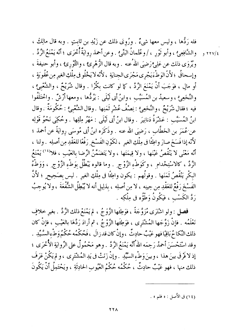 فله رَدُّها، وليس معها شىءٌ. ورُوِىَ ذلك عن زَيْدِ بن ثابتٍ. وبه قال مالِكٌ، والشَّافِعِىُّ، وأبو ثَوْرٍ، وعُثْمانُ البَتِّىُّ. وعن أحمدَ رِوايَةٌ أُخْرَى؛ أنَّه يَمْنَعُ الرَّدَّ. ويُرْوَى ذلك عن عَلِىٍّ رَضِىَ اللهُ عنه. وبه قال الزُّهْرِىُّ، والثَّوْرِىُّ، وأبو حنيفةَ، وإسحاقُ؛ لأنّ الوَطْءَ يَجْرِى مَجْرَى الجِنايَةِ، لأنّه لا يَخْلُو فى مِلْكِ الغيرِ مِن عُقُوبَةٍ، أو مالٍ، فوَجَبَ أنْ يَمْنَعَ الرَّدَّ، كما لو كانت بِكْرًا. وقال شُرَيْحٌ، والشَّعْبِىُّ، والنَّخَعِىُّ، وسعيدُ بن المُسَيَّبِ، وابنُ أبى لَيْلَى: يَرُدُّها، ومعها أرْشٌ. واخْتَلَفُوا فيه؛ فقال شُرَيْحٌ، والنَّخَعِىُّ: نِصْفُ عُشْرِ ثَمَنِها. وقال الشَّعْبِىُّ: حُكُومَةٌ. وقال ابنُ المُسَيَّبِ: عَشْرَةُ دَنانِيرَ. وقال ابنُ أبى لَيْلَى: مَهْرُ مِثْلِها. وحُكِىَ نَحْوُ قَوْلِه عن عُمَرَ بن الخَطَّابِ، رَضِىَ اللَّه عنه. وذَكَرَه ابنُ أبى مُوسَى رِوايَةً عن أحمدَ؛ لأنّه إذا فَسَخَ صارَ واطِئًا فى مِلْكِ الغيرِ، لكَوْنِ الفَسْخِ رَفْعًا للعَقْدِ مِن أصلِه. ولنا، أنّه مَعْنًى لا يَنْقُصُ عَيْنَها، ولا قِيمَتَها، ولا يَتَضَمَّنُ الرِّضا بِالعَيْبِ، فلا (١٤) يَمْنَعُ الرَّدَّ، كالاسْتِخْدامِ، وكَوَطْءِ الزَّوْجِ. وما قالوه يَبْطُلُ بِوَطْءِ الزَّوْجِ، وَوَطْءُ البِكْرِ يَنْقُصُ ثَمَنَها. وقولُهم: يكون واطِئًا فى مِلْكِ الغيرِ. ليس بِصَحِيحٍ؛ لأنَّ الفَسْخَ رَفْعٌ للعَقْدِ مِن حِينِه، لا مِن أصلِه، بِدَلِيلِ أنه لا يُبْطِلُ الشُّفْعَةَ، ولا يُوجِبُ رَدَّ الكَسْبِ، فيَكُونُ وَطْؤُه فى مِلْكِه.