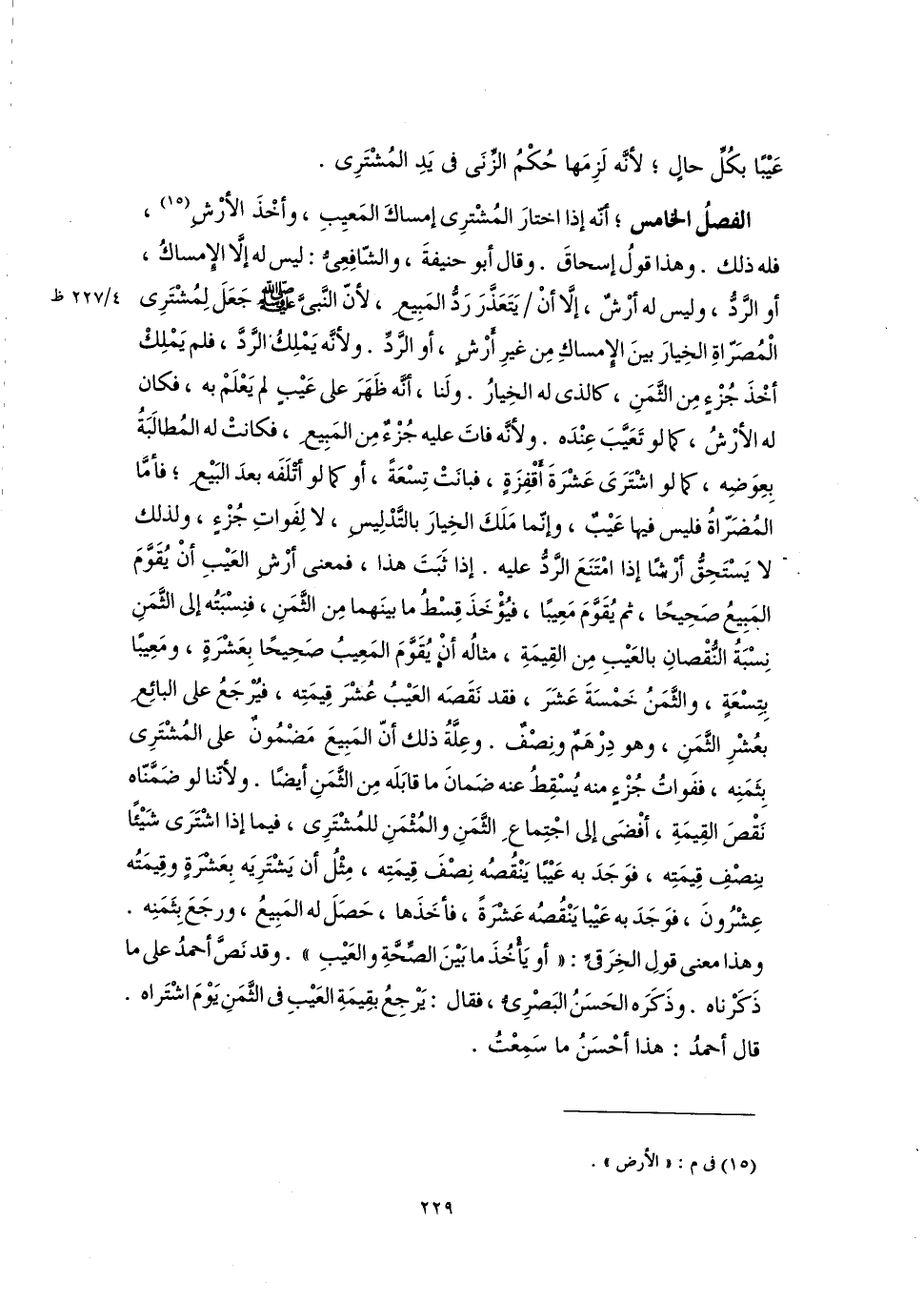 الفصلُ الخامس؛ أنّه إذا اختارَ المُشْترِى إمساكَ المَعيِبِ، وأخْذَ الأرْشِ (١٥)، فله ذلك. وهذا قولُ إسحاقَ. وقال أبو حنيفةَ، والشّافِعِىُّ: ليس له إلَّا الإمساكُ، أو الرَّدُّ، وليس له أرْشٌ، إلَّا أنْ يَتَعَذَّرَ رَدُّ المَبِيعِ، لأنّ النَّبىَّ -صَلَّى اللهُ عَلَيْهِ وَسَلَّمَ- جَعَلَ لِمُشْتَرِى الْمُصَرّاةِ الخِيارَ بينَ الإمساكِ مِن غيرِ أرْشٍ، أو الرَّدِّ. ولأنَّه يَمْلِكُ الرَّدَّ، فلم يَمْلِكْ أخْذَ جُزْءٍ مِن الثَّمَنِ، كالذى له الخِيارُ. ولَنا، أنَّه ظَهَرَ على عَيْبٍ لم يَعْلَمْ به، فكان له الأرْشُ، كما لو تَعَيَّبَ عِنْدَه. ولأنَّه فاتَ عليه جُزْءٌ مِن المَبِيعِ، فكانتْ له المُطالَبَةُ بِعِوَضِه، كما لو اشْتَرَىَ عَشْرَةَ أقْفِزَةٍ، فبانَتْ تِسْعَةً، أو كما لو أتْلَفَه بعدَ البَيْعِ؛ فأمَّا المُصَرّاةُ فليس فيها عَيْبٌ، وإنّما مَلَكَ الخِيارَ بالتَّدْلِيسِ، لا لِفَواتِ جُزْءٍ، ولذلك لا يَسْتَحِقُّ أرْشًا إذا امْتَنَعَ الرَّدُّ عليه. إذا ثَبَتَ هذا، فمعنى أرْشِ العَيْبِ أنْ يُقَوَّمَ المبِيعُ صَحِيحًا، ثم يُقَوَّمَ مَعِيبًا، فيُؤْخَذَ قِسْطُ ما بينَهما مِن الثَّمَنِ، فنِسْبَتُه إلى الثَّمَنِ نِسْبَةُ النُّقْصانِ بالعَيْبِ مِن القِيمَةِ، مثالُه أنْ يُقَوَّمَ المَعِيبُ صَحِيحًا بِعَشْرَةٍ، ومَعِيبًا بِتِسْعَةٍ، والثَّمَنُ خَمْسَةَ عَشَرَ، فقد نَقَصَه العَيْبُ عُشْرَ قِيمَتِه، فيُرْجَعُ على البائِعِ بعُشْرِ الثَّمَنِ، وهو دِرْهَمٌ ونِصْفٌ. وعِلَّةُ ذلك أنّ المَبِيعَ مَضْمُونٌ على المُشْتَرِى بِثَمَنِه، ففَواتُ جُزْءٍ منه يُسْقِطُ عنه ضَمانَ ما قابَلَه مِن الثَّمَنِ أيضًا. ولأنّنا لو ضَمَّنّاه نَقْصَ القِيمَةِ، أفْضَى إلى اجْتِماعِ الثَّمَنِ والمُثْمَنِ للمُشْتَرِى، فيما إذا اشْتَرَى شَيْئًا بنِصْفِ قِيمَتِه، فوَجَدَ به عَيْبًا يَنْقُصُه نِصْفَ قِيمَتِه، مِثْلُ أن يَشْتَرِيَه بِعَشْرَةٍ وقِيمَتُه عِشْرُونَ، فوَجَدَ به عَيْبا يَنْقُصُه عَشْرَةً، فأخَذَها، حَصَلَ له المَبِيعُ، ورجَعَ بِثَمَنِه. وهذا معنى قولِ الخِرَقىِّ: "أو يَأْخُذَ ما بَيْنَ الصِّحَّةِ والعَيْبِ". وقد نَصَّ أحمدُ على ما ذَكَرْناه. وذَكَرَه الحَسَنُ البَصْرِىُّ، فقال: يَرْجِعُ بقِيمَةِ العَيْبِ فى الثَّمَنِ يَوْمَ اشْتَراه. قال أحمدُ: هذا أحْسَنُ ما سَمِعْتُ.
