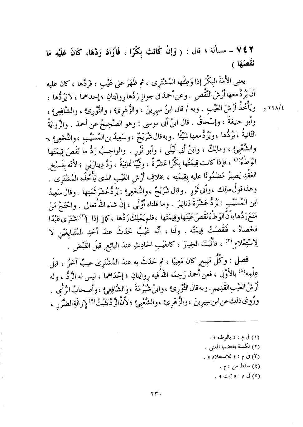 يعنى الأمَةَ البِكْرَ إذا وَطِئَها المُشْتَرِى، ثم ظَهَرَ على عَيْبٍ، فرَدَّها، كان عليه أنْ يَرُدَّ معها أرْشَ النَّقْصِ. وعن أحمدَ فى جوازِ رَدِّها رِوايَتانِ؛ إحداهما، لا يَرُدُّها، ويَأْخُذُ أرْشَ العَيْبِ. وبه قال ابنُ سيِرِينَ، والزُّهْرِىُّ، والثَّوْرِىُّ، والشَّافِعىُّ، وأبو حنيفةَ، وإسْحاقُ. قال ابنُ أبى موسى: وهو الصَّحِيحُ عن أحمدَ. والرِّوايَةُ الثّانيةُ، يَرُدُّها، ويَرُدُّ معها شَيْئًا. وبه قال شُرَيْحٌ، وسَعِيدُ بن المُسَيَّبِ، والنَّخَعِىُّ، والشَّعْبِىُّ، ومالِكٌ، وابنُ أبى لَيْلَى، وأبو ثَوْرٍ. والواجِبُ رَدُّ ما نَقَصَ قِيمَتَها الوَطْءُ (١)، فإذا كانت قِيمَتُها بِكْرًا عَشْرَةً، وثَيِّبًا ثمانِيَةً، رَدَّ دِينارَيْنِ؛ لأنّه بِفَسْخِ العَقْدِ يَصِيرُ مَضْمُونًا عليه بِقِيمَتِه، بخلافِ أرْشِ العَيْبِ الذى يَأْخُذُه المُشْتَرِى. وهذا قولُ مالِك، وأبى ثَوْرٍ. وقال شُرَيْحٌ، والنَّخَعِىُّ: يَرُدُّ عُشْرَ ثَمَنِها. وقال سَعِيدُ ابن المُسَيَّبِ: يَرُدُّ عَشْرَةَ دَنانِيرَ. وما قلناه أوْلَى، إنْ شاء اللهُ تعالى. واحْتَجَّ مَنْ مَنَعَ رَدَّها بأنَّ الوَطْءَ نَقَصَ عَيْنَها وقِيمَتَها، فلم يَمْلِكْ رَدَّها، كما [إذا] (٢) اشْتَرَى عَبْدًا فخَصاهُ، فَنَقَصَتْ قِيمَتُه. ولَنا، أنَّه عَيْبٌ حَدَثَ عندَ أحَدِ المُتَبايِعَيْنِ لا لِاسْتِعْلامٍ (٣)، فأثْبَتَ الخِيارَ، كالعَيْبِ الحادِثِ عندَ البائِعِ قبلَ القَبْضِ.