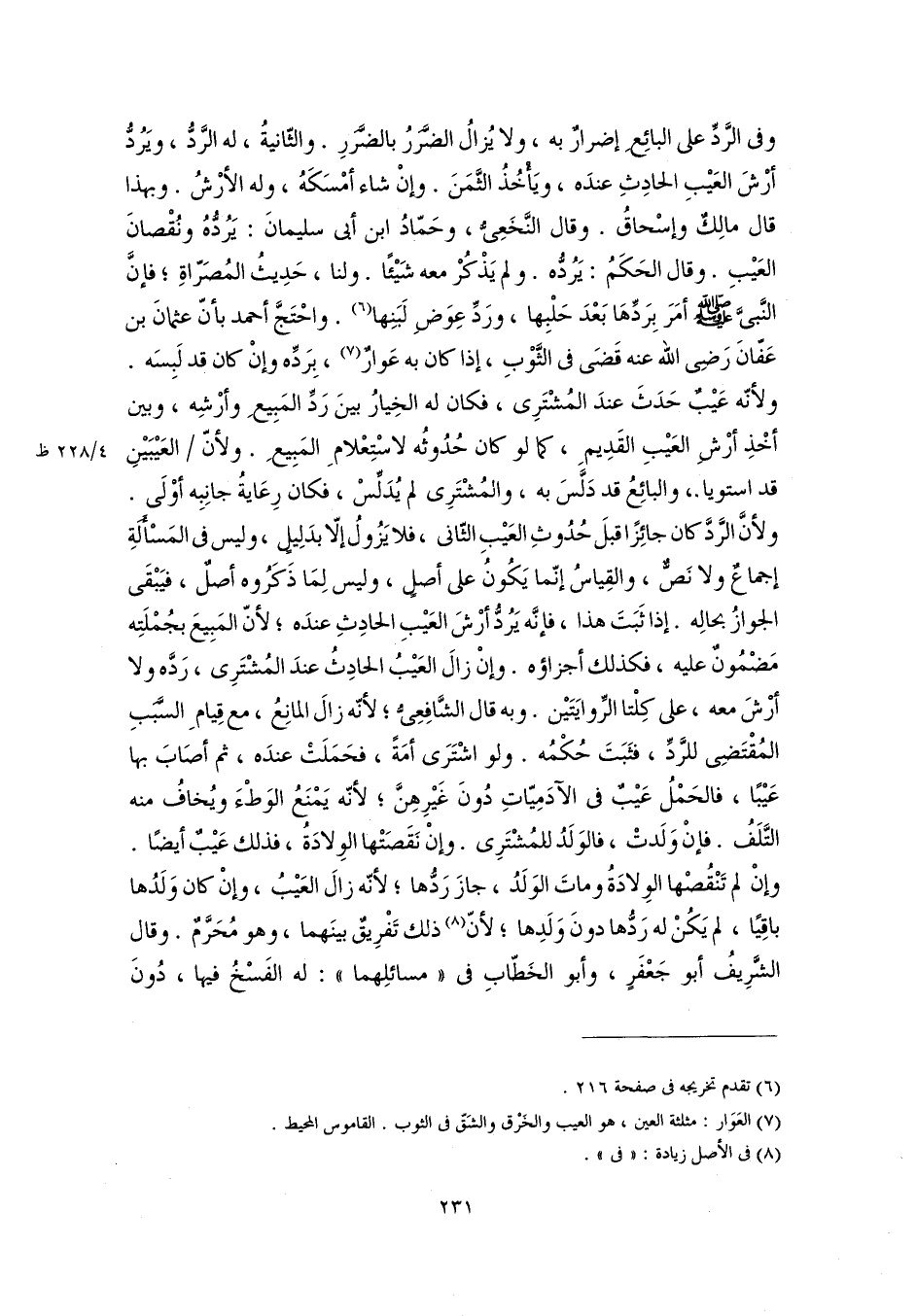 وفى الرَّدِّ على البائِعِ إضرارٌ به، ولا يُزالُ الضَّرَرُ بالضَّرَرِ. والثّانيةُ، له الرَّدُّ، ويَرُدُّ أرْشَ العَيْبِ الحادِثِ عندَه، ويَأْخُذُ الثَّمَنَ. وإنْ شاء أمْسَكَهُ، وله الأرْشُ. وبهذا قال مالِكٌ وإسْحاقُ. وقال النَّخَعِىُّ، وحَمّادُ ابن أبى سليمانَ: يَرُدُّهُ ونُقْصانَ العَيْبِ. وقال الحَكَمُ: يَرُدُّه. ولم يَذْكُرْ معه شَيْئًا. ولنا، حَدِيثُ المُصَرّاةِ؛ فإنَّ النَّبىَّ -صَلَّى اللهُ عَلَيْهِ وَسَلَّمَ- أمَرَ بِرَدِّهَا بَعْدَ حَلْبِها، ورَدِّ عِوَضِ لَبَنِها (٦). واحْتَجَّ أحمد بأنّ عثمانَ بن عَفانَ رَضِى اللَّه عنه قَضَى فى الثَّوْبِ، إذا كان به عَوارٌ (٧)، بِرَدِّه وإنْ كان قد لَبِسَه. ولأنّه عَيْبٌ حَدَثَ عندَ المُشْتَرِى، فكان له الخِيارُ بينَ رَدِّ المَبِيعِ وأرْشِه، وبين أخْذِ أرْشِ العَيْبِ القَدِيمِ، كما لو كان حُدُوثُه لاسْتِعْلامِ المَبِيعِ. ولأنّ العَيْبَيْنِ قد استويا، والبائِعُ قد دَلَّسَ به، والمُشْتَرِى لم يُدَلِّسْ، فكان رِعَايةُ جانِبِه أوْلَى. ولأنَّ الرَّدَّ كان جائِزًا قبلَ حُدُوثِ العَيْبِ الثّانى، فلا يَزُولُ إلّا بدَلِيلٍ، وليس فى المَسْأَلَةِ إجماعٌ ولا نَصٌّ، والقِياسُ إنّما يَكُونُ على أصلٍ، وليس لِمَا ذَكَرُوه أصلٌ، فيَبْقَى الجوازُ بحالِه. إذا ثَبَتَ هذا، فإنَّه يَرُدُّ أرْشَ العَيْبِ الحادِثِ عندَه؛ لأنّ المَبِيعَ بجُمْلَتِه مَضْمُونٌ عليه، فكذلك أجزاؤه. وإنْ زالَ العَيْبُ الحادِثُ عندَ المُشْتَرِى، رَدَّه ولا أرْشَ معه، على كِلْتا الرِّوايَتَيْن. وبه قال الشَّافِعِىُّ؛ لأنّه زالَ المانِعُ، مع قِيامِ السَّبَبِ المُقْتَضِى للرَّدِّ، فثَبَتَ حُكْمُه. ولو اشْتَرَى أمَةً، فحَمَلَتْ عندَه، ثم أصَابَ بها عَيْبًا، فالحَمْلُ عَيْبٌ فى الآدَمِيّاتِ دُونَ غَيْرِهِنَّ؛ لأنّه يَمْنَعُ الوَطْءَ ويُخافُ منه التَّلَفُ. فإنْ وَلَدتْ، فالوَلَدُ للمُشْتَرِى. وإنْ نَقَصَتْها الوِلادَةُ، فذلك عَيْبٌ أيضًا. وإنْ لم تَنْقُصْها الوِلادَةُ وماتَ الوَلَدُ، جازَ رَدُّها؛ لأنّه زالَ العَيْبُ، وإنْ كان وَلَدُها باقِيًا، لم يَكُنْ له رَدُّها دونَ وَلَدِها؛ لأنّ (٨) ذلك تَفْرِيقٌ بينَهما، وهو مُحَرَّمٌ. وقال الشَّرِيفُ أبو جَعْفَرٍ، وأبو الخَطّابِ فى "مسائلِهما": له الفَسْخُ فيها، دُونَ