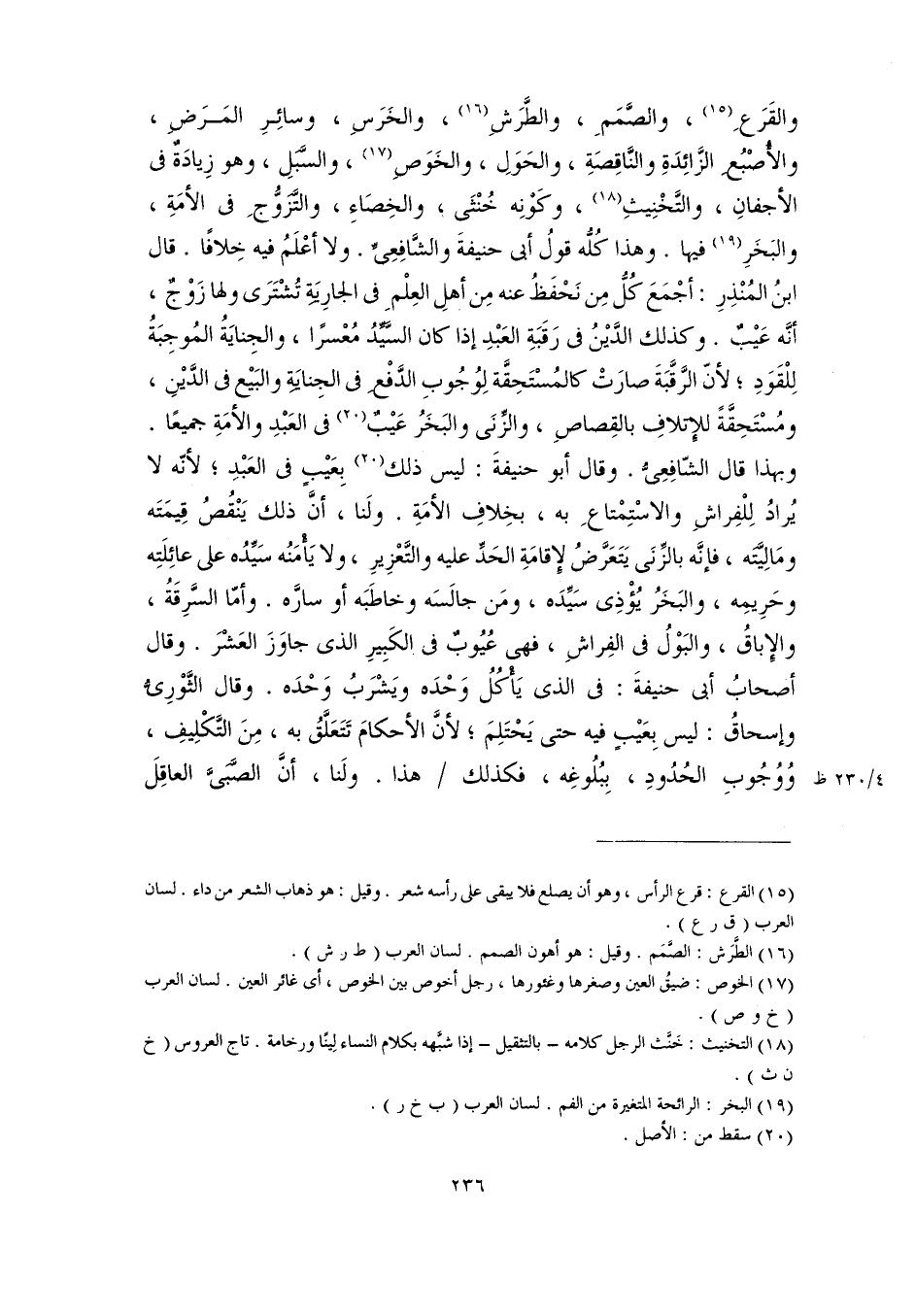 والقَرَعِ (١٥)، والصَّمَمِ، والطَّرَشِ (١٦)، والخَرَسِ، وسائِرِ المَرَضِ، والأُصْبُع الزَّائِدَةِ والنَّاقِصَةِ، والحَوَلِ، والخَوَصِ (١٧)، والسَّبَلِ، وهو زِيادَةٌ فى الأجفانِ، والتَّخْنِيثِ (١٨)، وكَوْنِه خُنْثَى؛ والخِصَاءِ، والتَّزَوُّجِ فى الأمَةِ، والبَخَرِ (١٩) فيها. وهذا كُلُّه قولُ أبى حنيفةَ والشَّافِعِىِّ. ولا أعْلَمُ فيه خِلافًا. قال ابنُ المُنْذِرِ: أجْمَعَ كُلُّ من نَحْفَظُ عنه مِن أهلِ العِلْمِ فى الجارِيَةِ تُشْتَرَى ولها زَوْجٌ، أنَّه عَيْبٌ. وكذلك الدَّيْنُ فى رَقَبَةِ العَبْدِ إذا كان السَّيِّدُ مُعْسرًا، والجِنايَةُ المُوجِبَةُ لِلْقَوَدِ؛ لأنّ الرَّقَّبَةَ صارَتْ كالمُسْتَحِقَّة لِوُجُوبِ الدَّفْعِ فى الجِنايَةِ والبَيْع فى الدَّيْنِ، ومُسْتَحِقَّةً للإتلافِ بالقِصاصِ، والزِّنَى والبَخَرُ عَيْبٌ (٢٠) فى العَبْدِ والأمَةِ جميعًا. وبهذا قال الشّافِعِىُّ. وقال أبو حنيفةَ: ليس ذلك (٢٠) بِعَيْبٍ فى العَبْدِ؛ لأنّه لا يُرادُ لِلْفِراشِ والاسْتِمْتاعِ به، بخِلافِ الأمَةِ. ولَنا، أنَّ ذلك يَنْقُصُ قِيمَتَه ومَالِيَّتَه، فإنَّه بالزِّنَى يَتَعَرَّضُ لِإقامَةِ الحَدِّ عليه والتَّعْزِيرِ، ولا يَأْمَنُه سَيِّدُه على عائِلَتِه وحَرِيمِه، والبَخَرُ يُؤْذِى سَيِّدَه، ومَن جالَسَه وخاطَبَه أو سارَّه. وأمّا السَّرِقَةُ، والإباقُ، والبَوْلُ فى الفِراشِ، فهى عُيُوبٌ فى الكَبِيرِ الذى جاوَزَ العَشْرَ. وقال أصحابُ أبى حنيفةَ: فى الذى يَأْكُلُ وَحْدَه ويَشْرَبُ وَحْدَه. وقال الثَّوْرِىُّ وإسحاقُ: ليس بِعَيْبٍ فيه حتى يَحْتَلِمَ؛ لأنَّ الأحكامَ تَتَعَلَّقُ به، مِنَ التَّكْلِيفِ، وُوُجُوبِ الحُدُودِ، بِبُلُوغِه، فكذلك هذا. ولَنا، أنَّ الصَّبِىَّ العاقِلَ