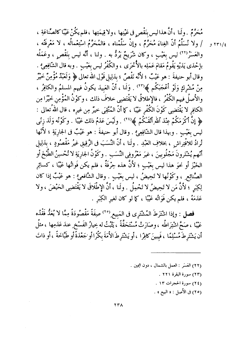 مُحَرَّمٌ. ولَنا، أنَّ هذا ليس بِنَقْصٍ فى عَيْنِها، ولا قِيمَتِها، فلم يكُنْ عَيْبًا كالصِّناعَةِ، ولا نُسَلِّمُ أنّ الغِناءَ مُحَرَّمٌ، وإنْ سَلَّمْناه، فالمُحَرَّمُ اسْتِعْمالُه، لا مَعْرِفَتُه، والعَسَرُ (٢٢) ليس بِعَيْبٍ، وكان شُرَيحٌ يَرُدُّ به. ولنا، أنَّه ليس بِنَقْصٍ، وعَمَلُه بإحْدَى يَدَيْهِ يَقُومُ مَقامَ عَمَلِه بالأُخْرَى، والكُفْرُ ليس بعَيْبٍ. وبه قال الشّافِعِىُّ. وقال أبو حنيفةَ: هو عَيْبٌ؛ لأنَّه نَقْصٌ؛ بدَلِيلِ قَوْلِ اللَّه تعالى {وَلَعَبْدٌ مُؤْمِنٌ خَيْرٌ مِنْ مُشْرِكٍ وَلَوْ أَعْجَبَكُمْ} (٢٣). وَلَنا، أَنّ العَبِيدَ يكونُ فيهم المسلمُ والكافِرُ، والأصلُ فيهم الكُفْرُ، فالإطلاقُ لا يَقْتَضِى خلافَ ذلك، وكوْنُ المُؤْمِنِ خَيْرًا مِن الكافِرِ لا يَقْتَضِى كَوْنَ الكُفْرِ عَيْبًا، كما أنّ المُتَّقِىَ خيرٌ مِن غيرِه، قال اللهُ تعالى: {إِنَّ أَكْرَمَكُمْ عِنْدَ اللَّهِ أَتْقَاكُمْ} (٢٤). ولَيْسَ عَدَمُ ذلك عَيْبًا. وكَوْنُه وَلَدَ زِنًى ليس بِعَيْبٍ. وبهذا قال الشّافِعِىُّ. وقال أبو حنيفةَ: هو عَيْبٌ فى الجارِيَةِ؛ لأنّها تُرادُ للافْتِراشِ، بخلافِ العَبْدِ. ولَنا، أنّ النَّسَبَ فى الرَّقِيقِ غيرُ مَقْصُودٍ، بِدَلِيلِ أنّهم يُشْتَرونَ مَجْلُوبِينَ، غيرَ مَعْرُوفِى النَّسَبِ. وكَوْنُ الجارِيةِ لا تُحْسِنُ الطَّبْخَ أو الخَبْزَ أو نحوَ هذا ليس بِعَيْبٍ؛ لأنَّ هذه حِرْفَةٌ، فلم يكن فَواتُها عَيْبًا، كسائِرِ الصَّنائِعِ، وكَوْنُها لا تَحِيضُ، ليس بِعَيْبٍ. وقال الشَّافعىُّ: هو عَيْبٌ إذا كان لِكِبَرٍ؛ لأنَّ مَن لا تَحِيضُ لا تَحْمِلُ. ولَنا، أنَّ الإطْلَاقَ لا يَقْتَضِى الحَيْضَ، ولا عَدَمَهُ، فلم يكن فَوَاتُه عَيْبًا، كما لو كان لغيرِ الكِبَرِ.