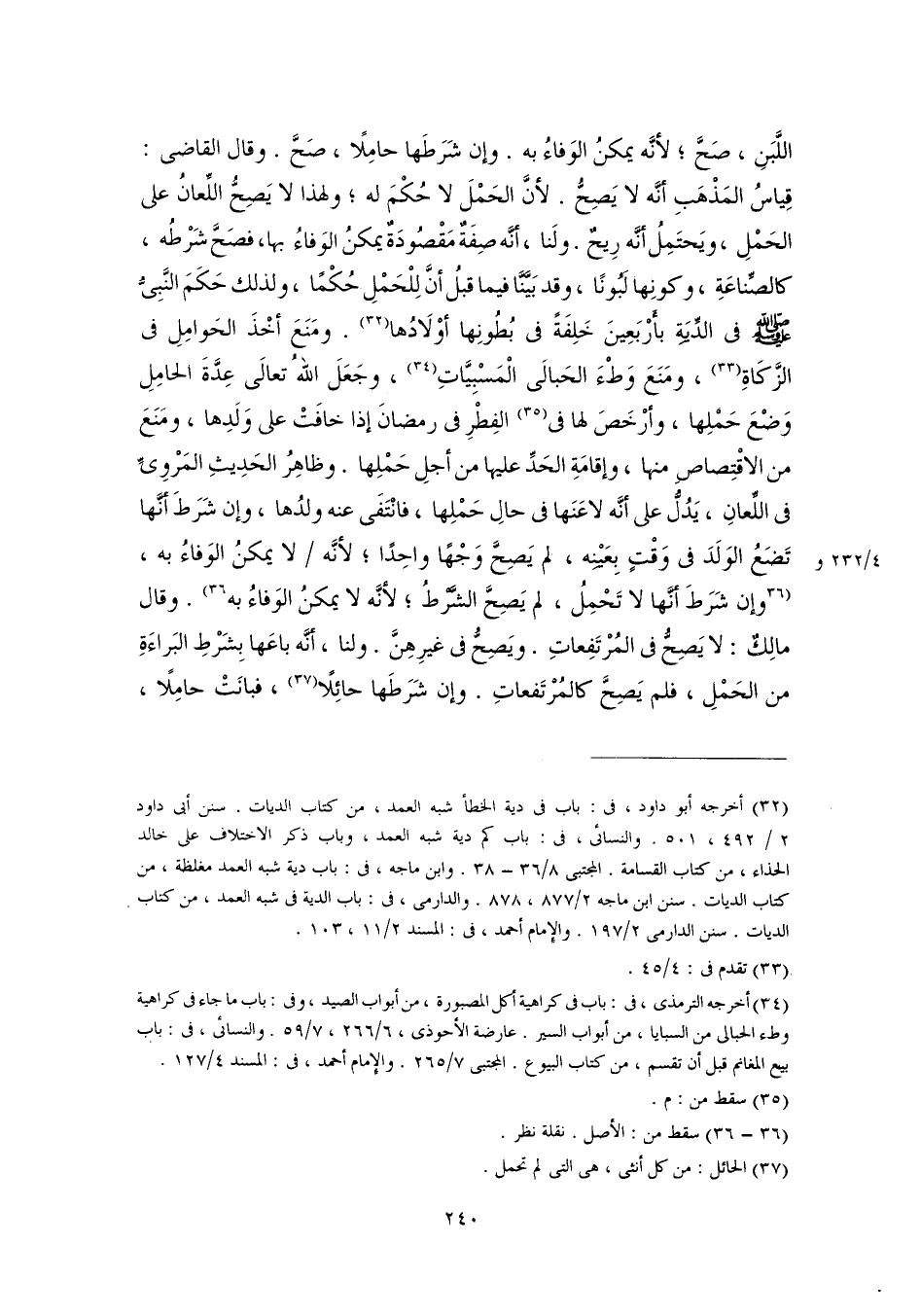 اللَّبَنِ، صَحَّ؛ لأنَّه يمكنُ الوَفاءُ به. وإن شَرَطَها حامِلًا، صَحَّ. وقال القاضى: قِياسُ المَذْهَبِ أنَّه لا يَصِحُّ. لأنَّ الحَمْلَ لا حُكْمَ له؛ ولهذا لا يَصِحُّ اللِّعانُ على الحَمْلِ، ويَحتَمِلُ أنَّه رِيحٌ. ولَنا، أنَّه صِفَةٌ مَقْصُودَةٌ يمكنُ الوَفاءُ بها، فصَحَّ شَرْطُه، كالصِّناعَةِ، وكونِها لَبُونًا، وقد بَيَّنَّا فيما قبلُ أنَّ لِلْحَمْلِ حُكْمًا، ولذلك حَكَمَ النَّبِىُّ -صَلَّى اللهُ عَلَيْهِ وَسَلَّمَ- فى الدِّيَةِ بأَرْبَعِينَ خَلِفَةً فى بُطُونِها أوْلَادُها (٣٢). ومَنَعَ أخْذَ الحَوامِلِ فى الزَّكَاةِ (٣٣)، ومَنَعَ وَطْءَ الحَبالَى الْمَسْبِيَّاتِ (٣٤)، وجَعَلَ اللهُ تعالَى عِدَّةَ الحامِلِ وَضْعَ حَمْلِها، وأرْخَصَ لها فى (٣٥) الفِطْرِ فى رمضانَ إذا خافَتْ على ولَدِها، ومَنَعَ من الاقْتِصاصِ منها، وإقامَةِ الحَدِّ عليها من أجلِ حَمْلِها. وظاهِرُ الحَدِيثِ المَرْوِىِّ فى اللِّعانِ، يَدُلُّ على أنَّه لاعَنَها فى حالِ حَمْلِها، فانْتَفَى عنه ولدُها، وإن شَرَطَ أنَّها تَضَعُ الوَلَدَ فى وَقْتٍ بِعَيْنِه، لم يَصِحَّ وَجْهًا واحِدًا؛ لأنَّه لا يمكنُ الوَفاءُ به، [وإن شَرَطَ أنَّها لا تَحْمِلُ، لم يَصِحَّ الشَّرْطُ؛ لأنَّه لا يمكنُ الوَفاءُ به] (٣٦). وقال مالِكٌ: لا يَصِحُّ فى المُرْتَفِعاتِ. ويَصِحُّ فى غيرِهِنَّ. ولنا، أنَّه باعَها بِشَرْطِ البَراءَةِ من الحَمْلِ، فلم يَصِحَّ كالمُرتَفعاتِ. وإن شَرَطَها حائِلًا (٣٧)، فبانَتْ حامِلًا،
