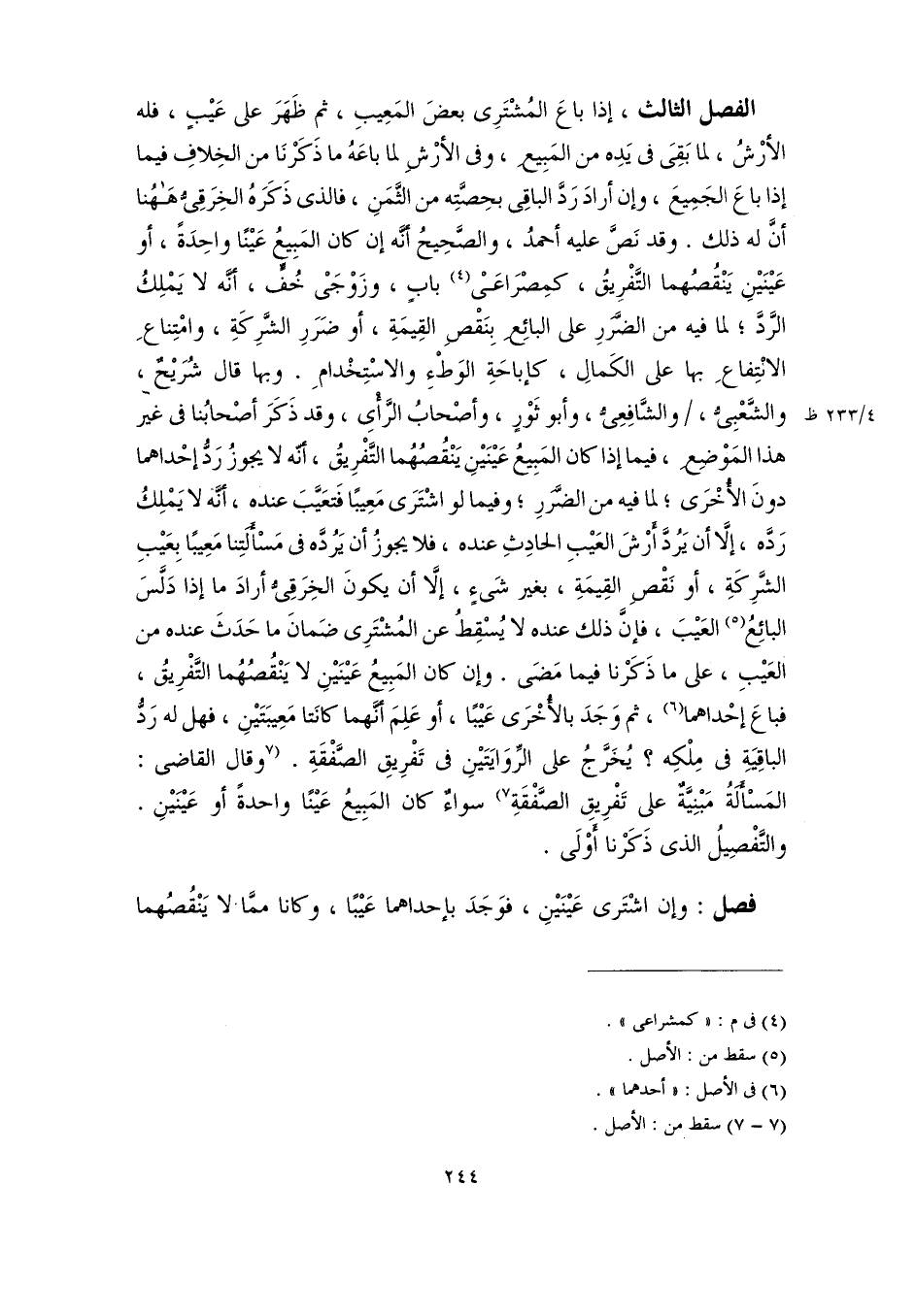 الفصل الثالث، إذا باعَ المُشْتَرِى بعضَ المَعِيبِ، ثم ظَهَرَ على عَيْبٍ، فله الأرْشُ، لما بَقِىَ فى يَدِه من المَبِيعِ، وفى الأرْشِ لما باعَهُ ما ذَكَرْنَا من الخِلافِ فيما إذا باعَ الجَمِيعَ، وإن أرادَ رَدَّ الباقِى بحِصَّتِه من الثَّمَنِ، فالذى ذَكَرَهُ الخِرَقِىُّ هَاهُنا أنَّ له ذلك. وقد نَصَّ عليه أحمدُ، والصَّحِيحُ أنَّه إن كان المَبِيعُ عَيْنًا واحِدَةً، أو عَيْنَيْنِ يَنْقُصُهما التَّفْرِيقُ، كمِصْرَاعَىْ (٤) بابٍ، وزَوْجَىْ خُفٍّ، أنَّه لا يَمْلِكُ الرَّدَّ؛ لما فيه من الضَّرَرِ على البائِعِ بِنَقْصِ القِيمَةِ، أو ضَرَرِ الشَّرِكَةِ، وامْتِناعِ الانْتِفاعِ بها على الكَمالِ، كإباحَةِ الوَطْءِ والاسْتِخْدامِ. وبها قال شُرَيْحٌ، والشَّعْبِىُّ، والشَّافِعِىُّ، وأبو ثَوْرٍ، وأصْحابُ الرَّأْىِ، وقد ذَكَرَ أصْحابُنا فى غير هذا المَوْضِعِ، فيما إذا كان المَبِيعُ عَيْنَيْنِ يَنْقُصُهُما التَّفْرِيقُ، أنَّه لا يجوزُ رَدُّ إحْداهما دونَ الأُخْرَى؛ لما فيه من الضَّرَرِ؛ وفيما لو اشْتَرَى مَعِيبًا فَتعَيَّبَ عنده، أنَّه لا يَمْلِكُ رَدَّه، إلَّا أن يَرُدَّ أَرْشَ العَيْبِ الحادِثِ عنده، فلا يجوزُ أن يَرُدَّه فى مَسْأَلَتِنا مَعِيبًا بِعَيْبِ الشَّرِكَةِ، أو نَقْصِ القِيمَةِ، بغير شَىءٍ، إلَّا أن يكونَ الخِرَقِىُّ أرادَ ما إذا دَلَّسَ البائِعُ (٥) العَيْبَ، فإنَّ ذلك عنده لا يُسْقِطُ عن المُشْتَرِى ضَمانَ ما حَدَثَ عنده من العَيْبِ، على ما ذَكَرْنا فيما مَضَى. وإن كان المَبِيعُ عَيْنَيْنِ لا يَنْقُصُهُما التَّفْرِيقُ، فباعَ إحْداهما (٦)، ثم وَجَدَ بالأُخْرَى عَيْبًا، أو عَلِمَ أنَّهما كانَتا مَعِيبَتَيْنِ، فهل له رَدُّ الباقِيَةِ فى مِلْكِه؟ يُخَرَّجُ على الرِّوَايَتَيْنِ فى تَفْرِيقِ الصَّفْقَةِ. [وقال القاضى: المَسْأَلَةُ مَبْنِيَّةٌ على تَفْرِيقِ الصَّفْقَةِ] (٧) سواءٌ كان المَبِيعُ عَيْنًا واحدةً أو عَيْنَيْنِ. والتَّفْصِيلُ الذى ذَكَرْنا أَوْلَى.