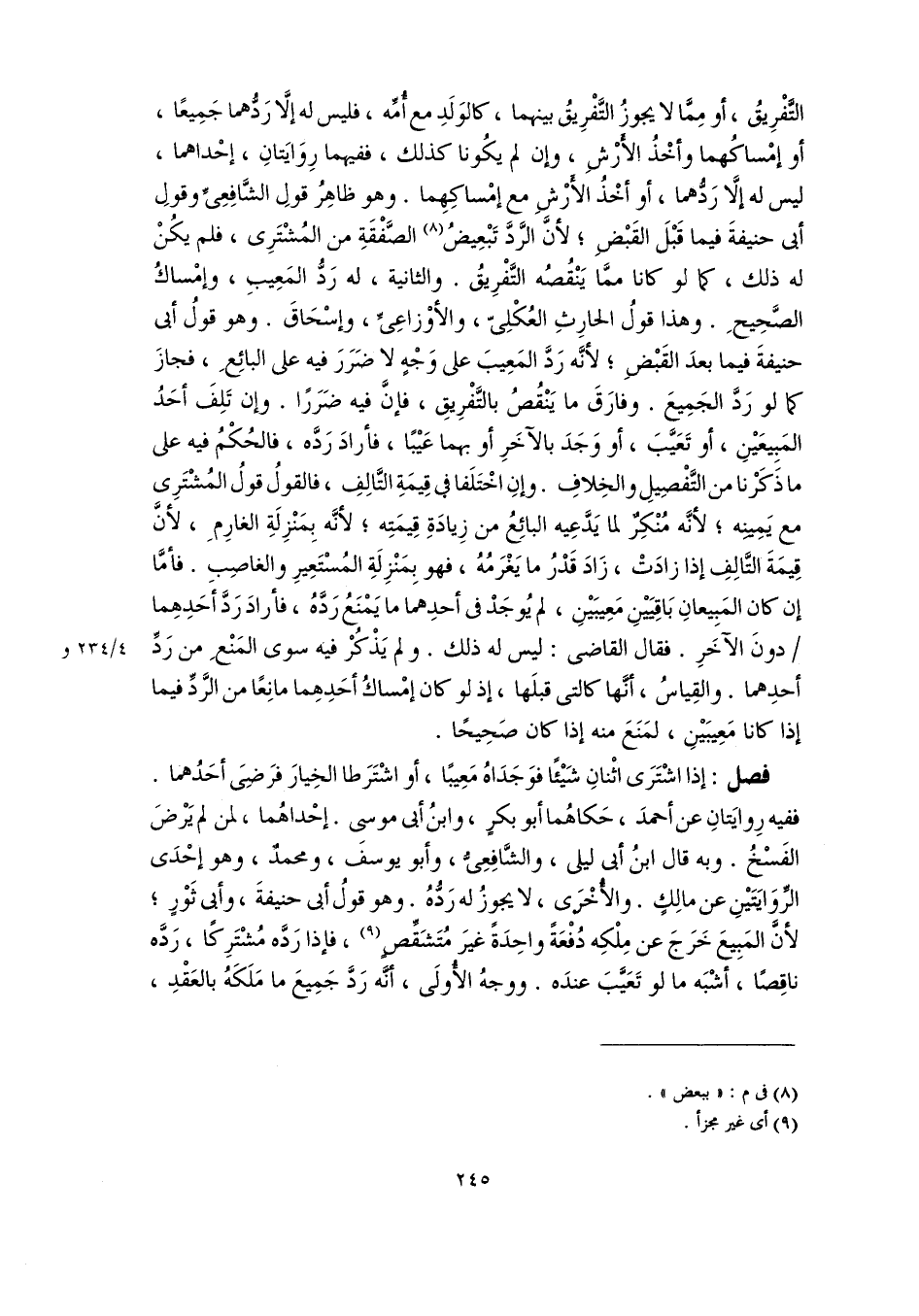 التَّفْرِيقُ، أو مِمَّا لا يجوزُ التَّفْرِيقُ بينهما، كالوَلَدِ مع أُمِّه، فليس له إلَّا رَدُّهما جَمِيعًا، أو إمْساكُهما وأخْذُ الأَرْشِ، وإن لم يكُونا كذلك، ففيهما رِوَايَتانِ، إحْداهما، ليس له إلَّا رَدُّهما، أو أخْذُ الأَرْشِ مع إمْساكِهِما. وهو ظاهِرُ قولِ الشَّافِعِىِّ وقولِ أبى حنيفةَ فيما قَبْلَ القَبْضِ؛ لأنَّ الرَّدَّ تَبْعِيضُ (٨) الصَّفْقَةِ من المُشْتَرِى، فلم يكُنْ له ذلك، كما لو كانا ممَّا يَنْقُصُه التَّفْرِيقُ. والثانية، له رَدُّ المَعِيبِ، وإمْساكُ الصَّحِيحِ. وهذا قولُ الحارِثِ العُكْلِىّ، والأوْزاعِىِّ، وإسْحَاقَ. وهو قولُ أبى حنيفةَ فيما بعدَ القَبْضِ؛ لأنَّه رَدَّ المَعِيبَ على وَجْهٍ لا ضَرَرَ فيه على البائِعِ، فجازَ كما لو رَدَّ الجَمِيعَ. وفارَقَ ما يَنْقُصُ بالتَّفْرِيقِ، فإنَّ فيه ضَرَرًا. وإن تَلِفَ أحَدُ المَبِيعَيْنِ، أو تَعَيَّبَ، أو وَجَدَ بالآخَرِ أو بهما عَيْبًا، فأرادَ رَدَّه، فالحُكْمُ فيه على ما ذَكَرْنا من التَّفْصِيلِ والخِلافِ. وإنِ اخْتَلَفا في قِيمَةِ التَّالِفِ، فالقولُ قولُ المُشْتَرِى مع يَمِينِه؛ لأنَّه مُنْكِرٌ لما يَدَّعِيه البائِعُ من زِيادَةِ قِيمَتِه؛ لأنَّه بِمَنْزِلَةِ الغارِمِ، لأنَّ قِيمَةَ التَّالِفِ إذا زادَتْ، زَادَ قَدْرُ ما يَغْرَمُهُ، فهو بِمَنْزِلَةِ المُسْتَعِيرِ والغاصِبِ. فأمَّا إن كان المَبِيعانِ بَاقِيَيْنِ مَعِيبَيْنِ، لم يُوجَدْ فى أحدِهما ما يَمْنَعُ رَدَّهُ، فأرادَ رَدَّ أَحَدِهِما دونَ الآخَرِ. فقال القاضى: ليس له ذلك. ولم يَذْكُرْ فيه سوى المَنْعِ من رَدِّ أحدِهما. والقِياسُ، أنَّها كالتى قبلَها، إذ لو كان إمْساكُ أحَدِهِما مانِعًا من الرَّدِّ فيما إذا كانا مَعِيبَيْنِ، لمَنَعَ منه إذا كان صَحِيحًا.