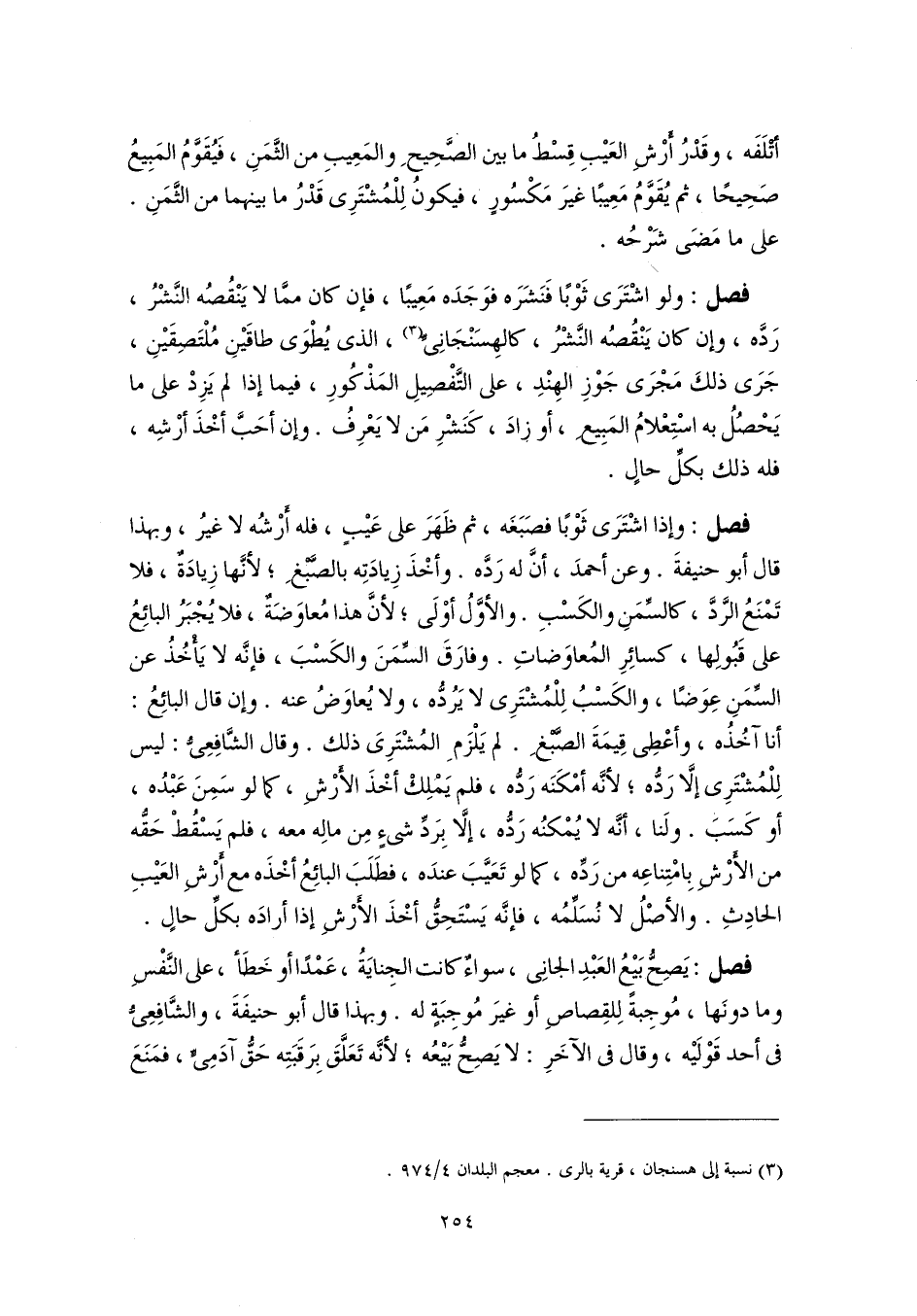 فصل: ولو اشْتَرَى ثَوْبًا فَنَشَرَه فوَجَدَه مَعِيبًا، فإن كان ممَّا لا يَنْقُصُه النَّشْرُ، رَدَّه، وإن كان يَنْقُصُه النَّشْرُ، كالهِسَنْجَانِىِّ (٣)، الذى يُطْوَى طاقَيْنِ مُلْتَصِقَيْنِ، جَرَى ذلكَ مَجْرَى جَوْزِ الهِنْدِ، على التَّفْصِيلِ المَذْكُورِ، فيما إذا لم يَزِدْ على ما يَحْصُلُ به اسْتِعْلامُ المَبِيعِ، أو زادَ، كَنَشْرِ مَن لا يَعْرِفُ. وإن أحَبَّ أخْذَ أرْشِه، فله ذلك بكلِّ حالٍ.