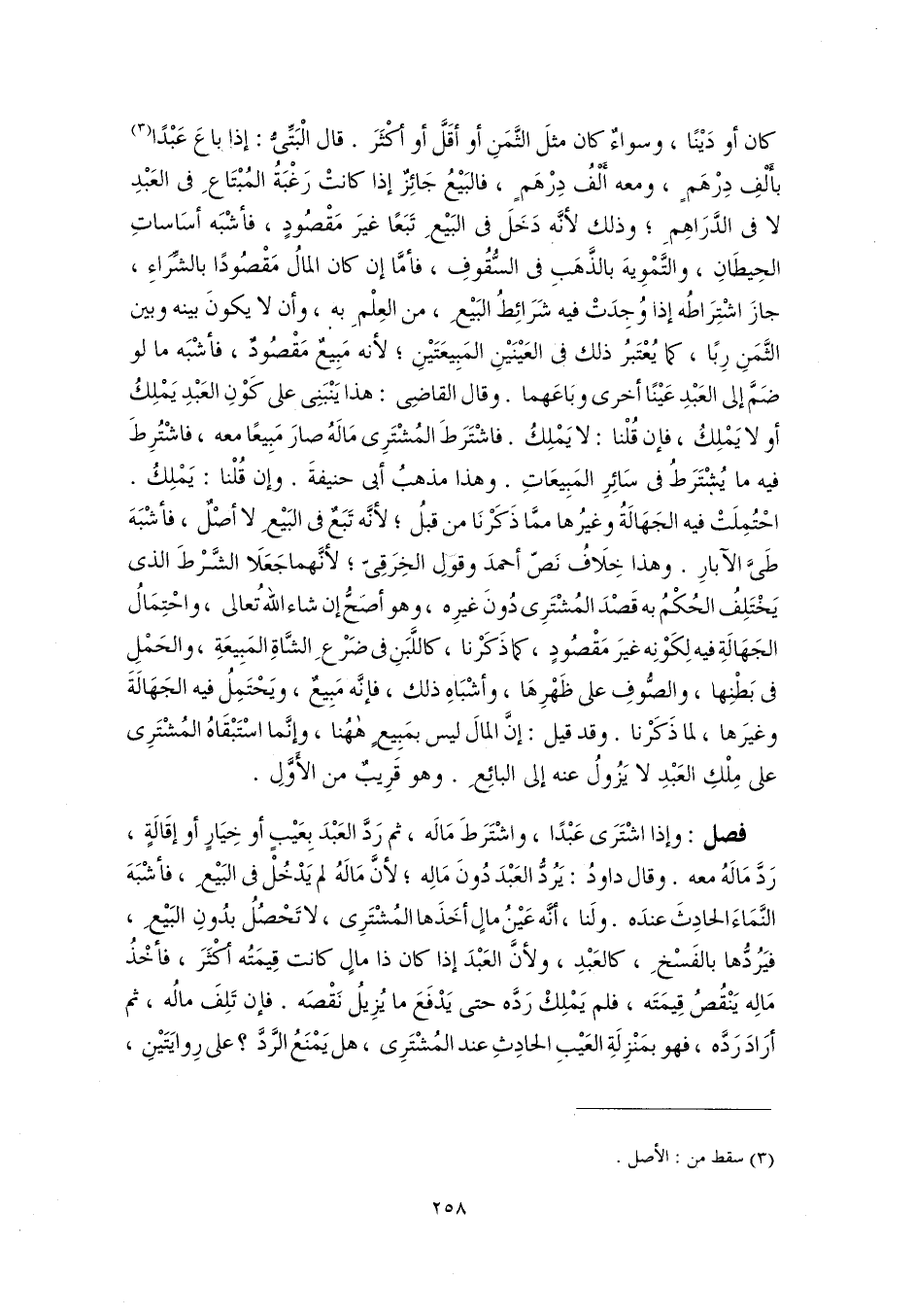فصل: وإذا اشْتَرَى عَبْدًا، واشْتَرَطَ مَالَه، ثم رَدَّ العَبْدَ بِعَيْبٍ أو خِيَارٍ أو إقَالَةٍ، رَدَّ مَالَهُ معه. وقال داودُ: يَرُدُّ العَبْدَ دُونَ مَالِه؛ لأنَّ مَالَهُ لم يَدْخُلْ في البَيْعِ، فأشْبَهَ النَّمَاءَ الحادِثَ عندَه. ولَنا، أنَّه عَيْنُ مالٍ أخَذَها المُشْتَرِى، لا تَحْصُلُ بدُونِ البَيْعِ، فيَرُدُّها بالفَسْخِ، كالعَبْدِ، ولأنَّ العَبْدَ إذا كان ذا مالٍ كانت قِيمَتُه أكْثَرَ، فأخْذُ مَالِه يَنْقُصُ قِيمَتَه، فلم يَمْلِكْ رَدَّه حتى يَدْفَعَ ما يُزِيلُ نَقْصَه. فإن تَلِفَ مالُه، ثم أرَادَ رَدَّه، فهو بمَنْزِلَةِ العَيْبِ الحادِثِ عند المُشْتَرِى، هل يَمْنَعُ الرَّدَّ؟ على رِوايَتَيْنِ،