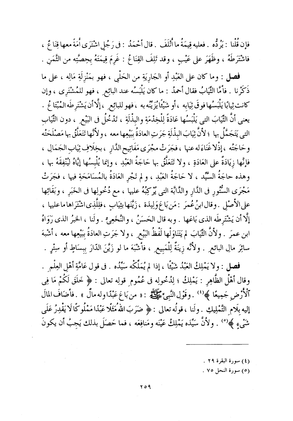 فصل: وما كان على العَبْدِ أو الجَارِيَةِ من الحَلْىِ، فهو بمَنْزِلَةِ مَالِه، على ما ذَكَرْنا. فأمَّا الثِّيَابُ فقال أحمدُ: ما كان يَلْبَسُه عند البائِعِ، فهو للمُشْتَرِى، وإن كانت ثِيابًا يَلْبَسُها فوقَ ثِيَابِه، أو شَيْئًا يُزَيِّنُه به، فهو للبائِعِ، إلَّا أن يَشْتَرِطَه المُبْتَاعُ. يعنى أنَّ الثِّيَابَ التى يَلْبَسُها عَادَةً لِلْخِدْمَةِ والبِذْلَةِ، تَدْخُلُ في البَيْعِ، دون الثِّيَابِ التى يَتَجَمَّلُ بها؛ لأنَّ ثِيَابَ البِذْلَةِ جَرَتِ العادَةُ ببَيْعِها معه، ولأنَّها تَتَعَلَّقُ بها مَصْلَحَتُه وحَاجَتُه، إذْ لا غَنَاءَ له عنها، فجَرَتْ مجْرَى مَفَاتِيح الدَّارِ، بخِلَافِ ثِيَابِ الجَمَالِ، فإنَّها زِيَادَةٌ على العَادَةِ، ولا تَتَعَلَّقُ بها حَاجَةُ العَبْدِ، وإنما يُلْبِسُها إيَّاهُ ليُنْفِقَهُ بها، وهذه حاجَةُ السَّيِّد، لا حَاجَةُ العَبْدِ، ولم تَجْرِ العَادَةُ بالمُسَامَحَةِ فيها، فجَرَتْ مَجْرَى السُّتُورِ في الدَّارِ والدَّابَّة التى يُرْكِبُهُ عليها، مع دُخُولِها في الخَبَرِ، وبَقَائِها على الأصْلِ. وقال ابنُ عُمرَ: مَن بَاعَ وَلِيدَة، زَيَّنَهَا بثِيَابٍ، فلِلَّذِي اشْتَرَاها ما عليها، إلَّا أن يَشْتَرِطَه الذى بَاعَها. وبه قال الحَسَنُ، والنَّخَعِيُّ. ولَنا، الخبرُ الذى رَوَاهُ ابن عمرَ. ولأنَّ الثِّيَابَ لم يَتَنَاوَلْها لَفْظُ البَيْعِ، ولا جَرَتِ العادَةُ بِبَيْعِها معه، أشْبهَ سائِرَ مالِ البائعِ. ولأنَّه زِينَةٌ لِلْمَبِيعِ، فأشْبَهَ ما لو زَيَّنَ الدّارَ بِبِسَاطٍ أو سِتْرٍ.