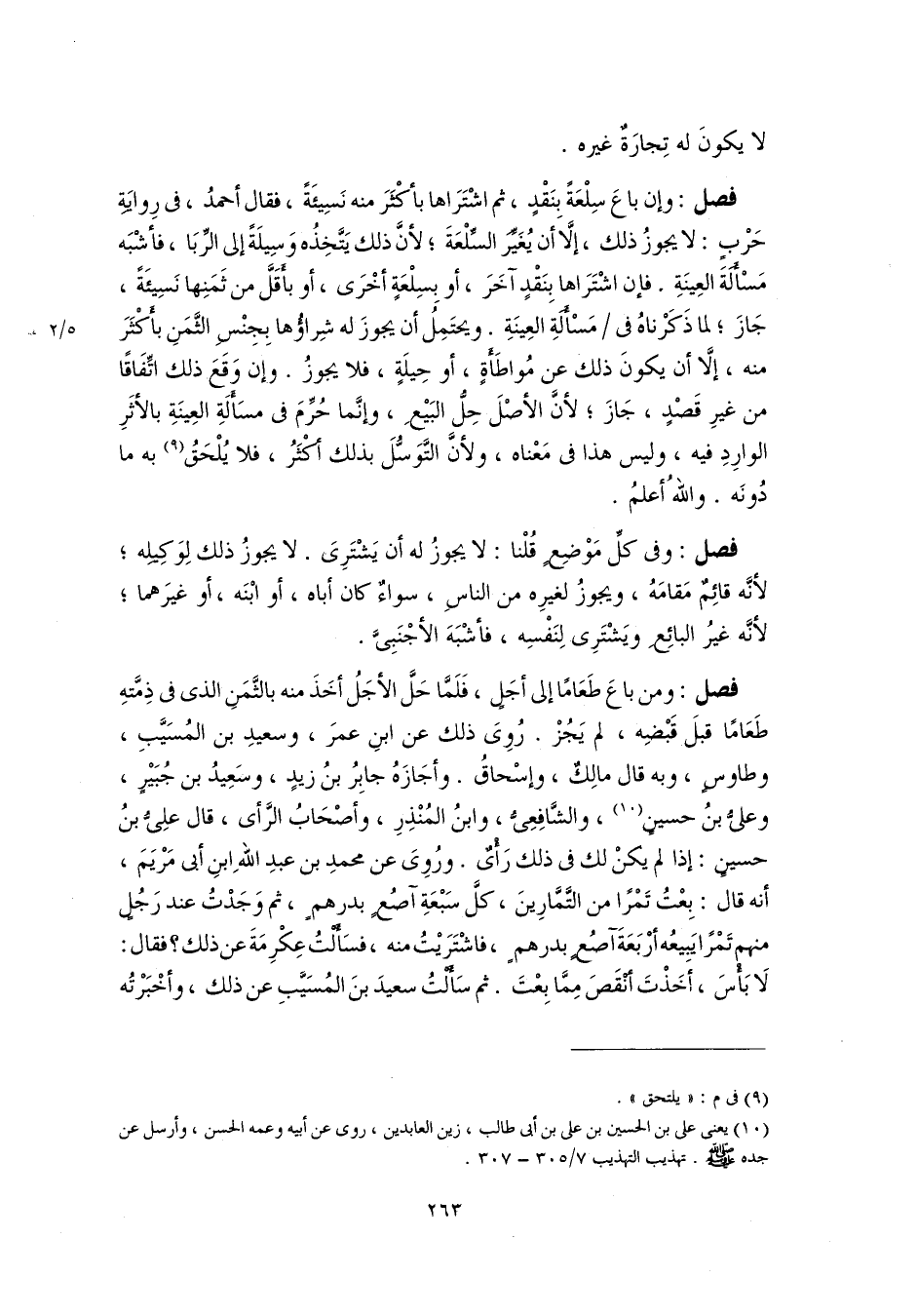 فصل: وإن باعَ سِلْعَةً بِنَقْدٍ، ثم اشْتَرَاها بأكْثَرَ منه نَسِيئَةً، فقال أحمدُ، في رِوايَةِ حَرْبٍ: لا يجوزُ ذلك، إلَّا أن يُغَيّرَ السِّلْعَةَ؛ لأنَّ ذلك يَتَّخِذُه وَسِيلَةً إلى الرِّبَا، فأشْبَه مَسْأَلَةَ العِينَةِ. فإن اشْتَرَاها بِنَقْدٍ آخَرَ، أو بِسِلْعَةٍ أخْرَى، أو بأقَلَّ من ثَمَنِها نَسِيئَةً، جَازَ؛ لما ذَكَرْناهُ في مَسْأَلَةِ العِينَةِ. ويحتَمِلُ أن يجوزَ له شِراؤُها بِجِنْسِ الثَّمَنِ بأَكْثَرَ منه، إلَّا أن يكونَ ذلك عن مُواطَأَةٍ، أو حِيلَةٍ، فلا يجوزُ. وإن وَقَعَ ذلك اتِّفَاقًا من غيرِ قَصْدٍ، جَازَ؛ لأنَّ الأصْلَ حِلُّ البَيْعِ، وإنَّما حُرِّمَ في مسَأَلَةِ العِينَةِ بالأثَرِ الوارِدِ فيه، وليس هذا في مَعْناه، ولأنَّ التَّوَسُّلَ بذلك أكْثَرُ، فلا يُلْحَقُ (٩) به ما دُونَه. واللهُ أعلمُ.