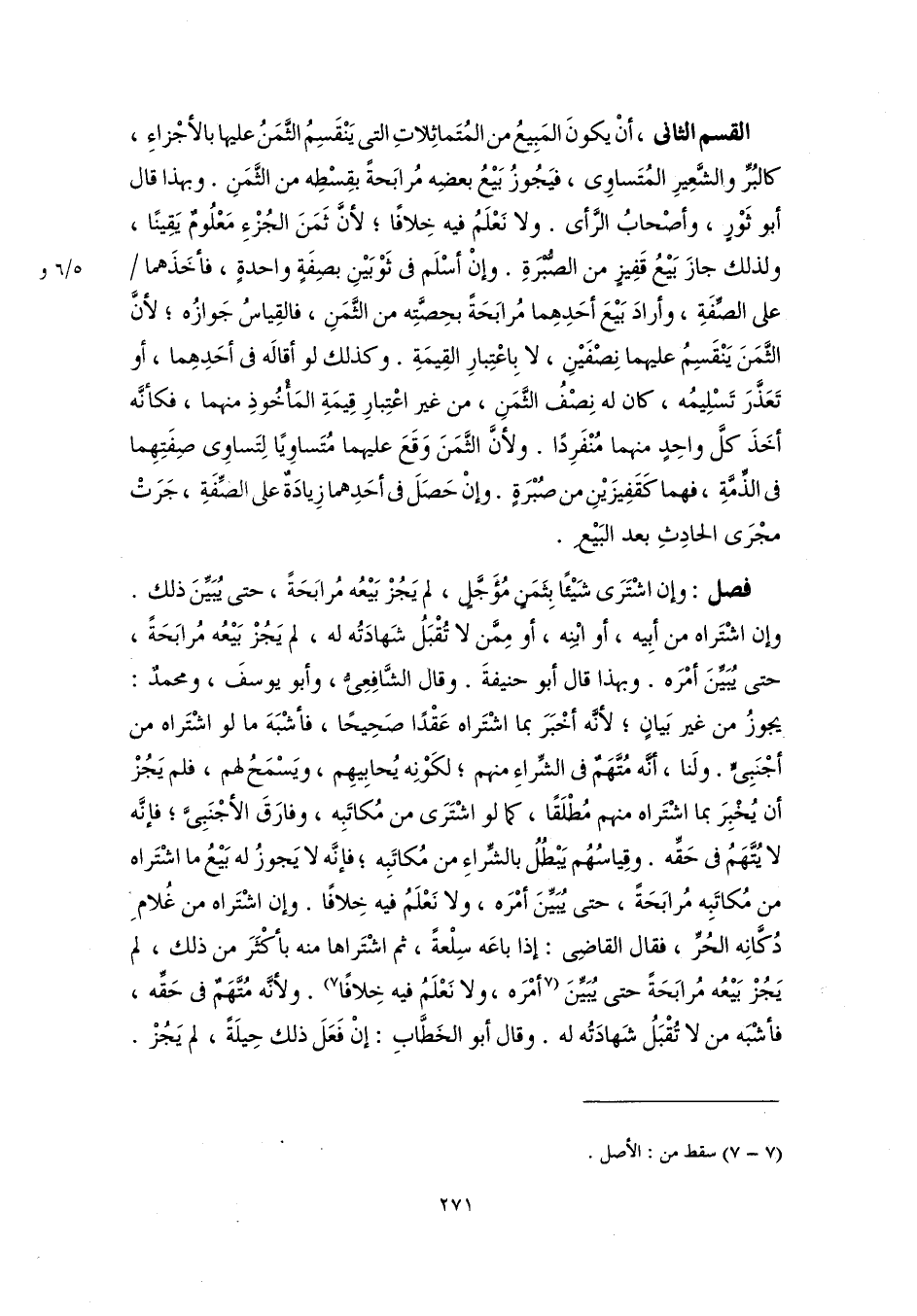 القسم الثانى، أنْ يكونَ المَبِيعُ من المُتَماثِلاتِ التى يَنْقَسِمُ الثَّمَنُ عليها بالأجْزاءِ، كالبُرِّ والشَّعِيرِ المُتَساوِى، فيَجُوزُ بَيْعُ بعضِه مُرابَحةً بقِسْطِه من الثَّمَنِ. وبهذا قال أبو ثَوْرٍ، وأصْحابُ الرَّأى. ولا نَعْلَمُ فيه خِلافًا؛ لأنَّ ثَمَنَ الجُزْءِ مَعْلُومٌ يَقِينًا، ولذلك جازَ بَيْعُ قَفِيزٍ من الصُّبْرَةِ. وإنْ أسْلَم فى ثَوْبَيْنِ بصِفَةٍ واحدةٍ، فأخَذَهما على الصِّفَةِ، وأرادَ بَيْعَ أحَدِهِما مُرابَحَةً بحِصَّتِه من الثَّمَنِ، فالقِياسُ جَوازُه؛ لأنَّ الثَّمَنَ يَنْقَسِمُ عليهما نِصْفَيْنِ، لا بِاعْتِبارِ القِيمَةِ. وكذلك لو أقالَه فى أحَدِهِما، أو تَعَذَّرَ تَسْلِيمُه، كان له نِصْفُ الثَّمَنِ، من غير اعْتِبارِ قِيمَةِ المَأْخُوذِ منهما، فكأنَّه أخَذَ كلَّ واحِدٍ منهما مُنْفَرِدًا. ولأنَّ الثَّمَنَ وَقَعَ عليهما مُتَساوِيًا لِتَساوِى صِفَتِهِما فى الذِّمَّةِ، فهما كَقَفِيزَيْنِ من صُبْرَةٍ. وإنْ حَصَلَ فى أحَدِهما زِيادَةٌ على الصِّفَةِ، جَرَتْ مجْرَى الحادِثِ بعد البَيْعِ.