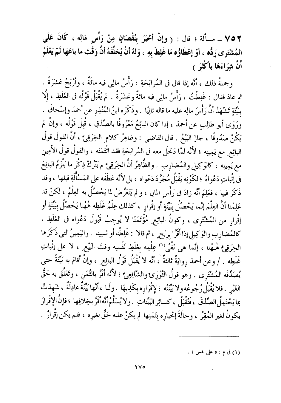 ٧٥٢ - مسألة؛ قال: (وإنْ أخْبَرَ بِنُقْصَانٍ مِنْ رَأْسِ مَالِه، كَانَ عَلَى المُشْتَرى رَدُّه، أوْ إعْطَاؤُه مَا غَلِطَ بهِ، وَلهُ أنْ يُحَلِّفَهُ أنَّ وَقْتَ ما باعَهَا لَمْ يَعْلَمْ أنَّ شِرَاءَهَا بأكْثَرَ)