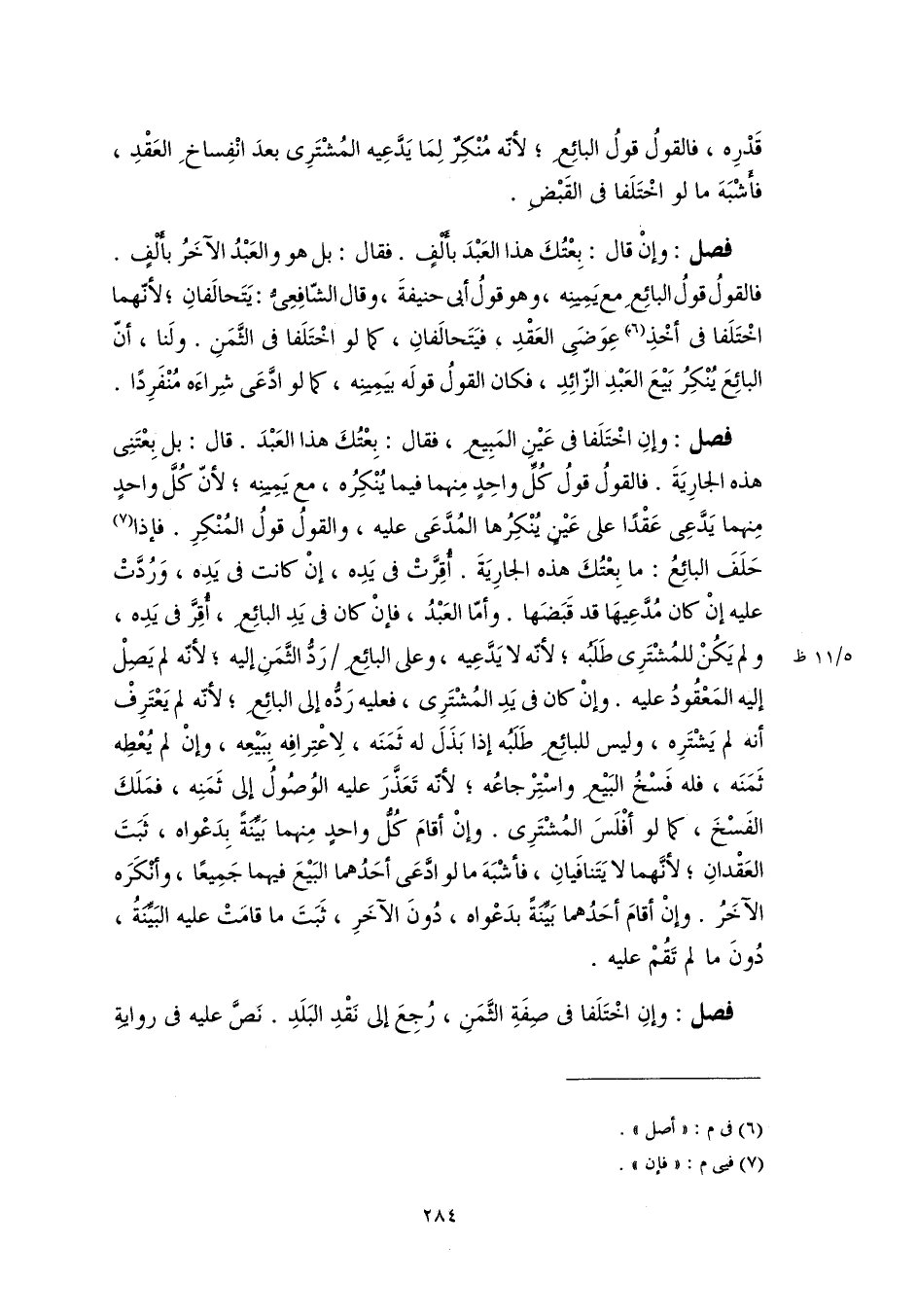 فصل: وإنِ اخْتَلَفا فى عَيْنِ المَبِيعِ، فقال: بِعْتُكَ هذا العَبْدَ. قال: بل بِعْتَنِى هذه الجارِيَةَ. فالقولُ قولُ كُلِّ واحِدٍ مِنهما فيما يُنْكِرُه، مع يَمِينِه؛ لأنّ كُلَّ واحدٍ مِنهما يَدَّعِى عَقْدًا على عَيْنٍ يُنْكِرُها المُدَّعَى عليه، والقولُ قولُ المُنْكِرِ. فإذا (٧) حَلَفَ البائِعُ: ما بِعْتُكَ هذه الجارِيَةَ. أُقِرَّتْ فى يَدِه، إنْ كانت فى يَدِه، وَرُدَّتْ عليه إنْ كان مُدَّعِيهَا قد قَبَضَها. وأمّا العَبْدُ، فإنْ كان فى يَدِ البائِعِ، أُقِرَّ فى يَدِه، ولم يَكُنْ للمُشْتَرِى طَلبُه؛ لأنّه لا يَدَّعِيه، وعلى البائِعِ رَدُّ الثَّمَنِ إليه؛ لأنّه لم يَصِلْ إليه المَعْقُودُ عليه. وإنْ كان فى يَدِ المُشْتَرِى، فعليه رَدُّه إلى البائِع؛ لأنّه لم يَعْتَرِفْ أنه لم يَشْتَرِه، وليس للبائِعِ طَلَبُه إذا بَذَلَ له ثَمَنَه، لِاعْتِرافِه بِبَيْعِه، وإنْ لم يُعْطِه ثَمَنَه، فله فَسْخُ البَيْعِ واسْتِرْجاعُه؛ لأنّه تَعَذَّرَ عليه الوُصُولُ إلى ثَمَنِه، فمَلَكَ الفَسْخَ، كما لو أفْلَسَ المُشْتَرِى. وإنْ أقامَ كُلُّ واحدٍ مِنهما بَيِّنَةً بِدَعْواه، ثَبَتَ العَقْدانِ؛ لأنَّهما لا يَتَنافَيانِ، فأشْبَهَ ما لو ادَّعَى أحَدُهما البَيْعَ فيهما جَمِيعًا، وأنْكَرَه الآخَرُ. وإنْ أقامَ أحَدُهما بَيِّنَةً بدَعْواه، دُونَ الآخَرِ، ثَبَتَ ما قامَتْ عليه البَيِّنَةُ، دُونَ ما لم تَقُمْ عليه.