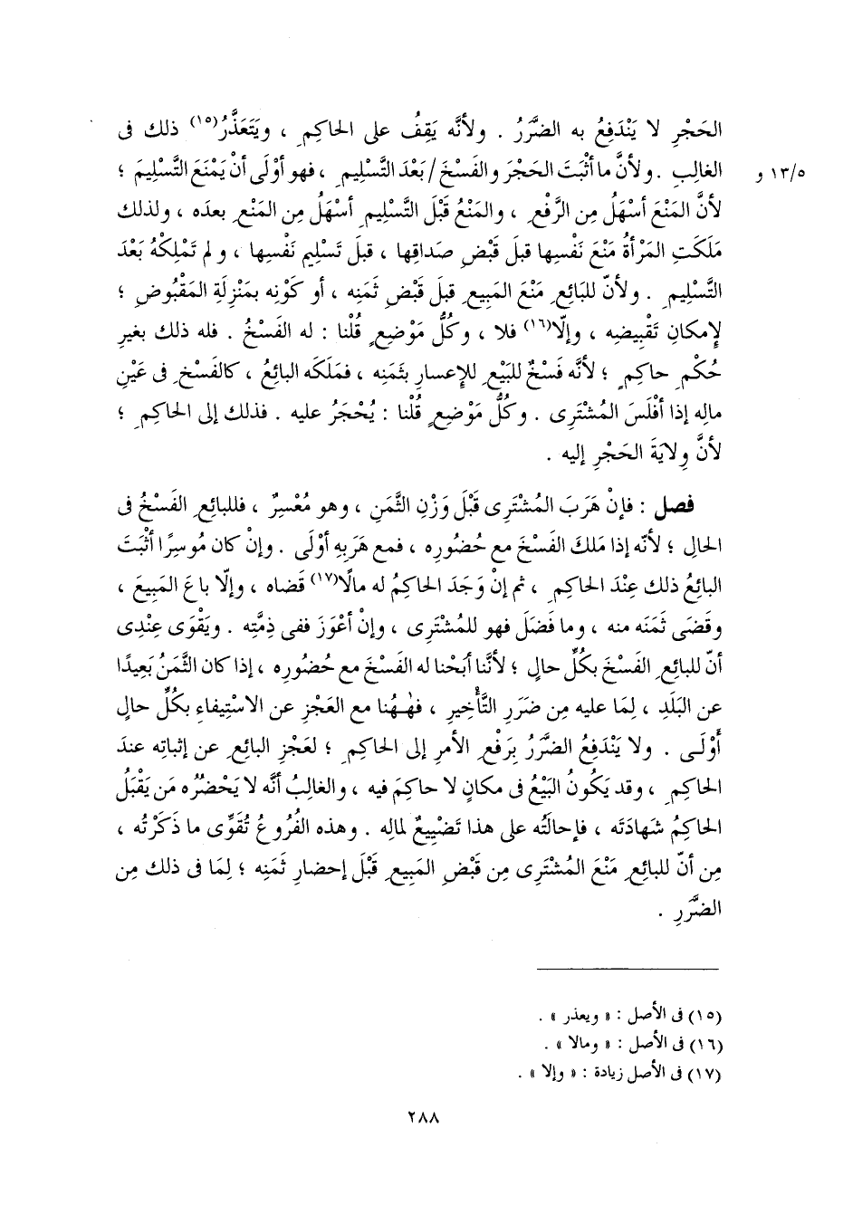 الحَجْرِ لا يَنْدَفِعُ به الضَّرَرُ. ولأنَّه يَقِفُ على الحاكِمِ، ويَتَعَذَّرُ (١٥) ذلك فى الغالِبِ. ولأنَّ ما أثْبَتَ الحَجْرَ والفَسْخَ بَعْدَ التَّسْلِيمِ، فهو أوْلَى أنْ يَمْنَعَ التَّسْلِيمَ؛ لأنَّ المَنْعَ أسْهَلُ مِن الرَّفْعِ، والمَنْعُ قَبْلَ التَّسْلِيمِ أسْهَلُ مِن المَنْعِ بعدَه، ولذلك مَلَكَتِ المَرْأةُ مَنْعَ نَفْسِها قبلَ قَبْضِ صَداقِها، قبلَ تَسْلِيم نَفْسِها، ولم تَمْلِكْهُ بَعْدَ التَّسْلِيمِ. ولأنّ للبَائِعِ مَنْعَ المَبِيعِ قبلَ قَبْضِ ثَمَنِه، أو كَوْنِه بمَنْزِلَةِ المَقْبُوضِ؛ لإِمكانِ تَقْبِيضِه، وإلّا (١٦) فلا، وكُلُّ مَوْضِعٍ قُلْنا: له الفَسْخُ. فله ذلك بغيرِ حُكْمِ حاكِمٍ؛ لأنَّه فَسْخٌ للبَيْعِ للإِعسارِ بثَمَنِه، فمَلَكَه البائِعُ، كالفَسْخِ فى عَيْنِ مالِه إذا أفْلَسَ المُشْتَرِى. وكُلُّ مَوْضِعٍ قُلْنا: يُحْجَرُ عليه. فذلك إلى الحاكِمِ؛ لأنَّ وِلايةَ الحَجْرِ إليه.