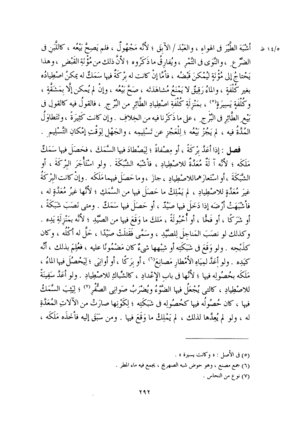 فصل: إذا أعَدَّ بِرْكَةً، أو مِصْفاةً؛ لِيَصْطادَ فيها السَّمَكَ، فحَصَلَ فيها سَمَكٌ مَلَكَه؛ لأنَّه آلَةٌ مُعَدَّةٌ للاصْطِيادِ، فأشْبَه الشَّبَكَةَ. ولو اسْتَأْجَرَ البِرْكَةَ، أو الشَّبَكَةَ، أو اسْتَعارَهما للاصْطِيادِ، جازَ، وما حَصَلَ فيهما مَلَكَه. وإنْ كانت البِرْكَةُ غيرَ مُعَدَّةٍ للاصْطِيادِ، لم يَمْلِكْ ما حَصَلَ فيها من السَّمَكِ، لأنَّها غيرُ مُعَدَّةٍ له، فأشْبَهَتْ أرْضَه إذا دَخَلَ فيها صَيْدٌ، أو حَصَلَ فيها سَمَكٌ. ومتى نَصَبَ شَبَكَةً، أو شَرَكًا، أو فَخًّا، أو أُحْبُولَةً، مَلكَ ما وَقَعَ فيها من الصَّيْدِ؛ لأنَّه بمَنْزِلَةِ يَدِه. وكذلك لو نصَبَ المَناجِلَ لِلصَّيْدِ، وسَمَّى فَقَتلَت صَيْدًا، حَلَّ له أكْلُه، وكان كذَبْحِه. ولو وَقَعَ فى شَبَكَتِه أو شِبْهها شىءٌ كان مَضْمُونًا عليه، فعُلِمَ بذلك، أَنَّه كيَدِه. ولو أعَدَّ لمِيَاهِ الأمْطارِ مَصانِعَ (٦)، أو بِرَكًا، أو أوانِىَ؛ لِيَحْصُلَ فيها الماءُ، مَلَكَه بحُصُولِه فيها؛ لأنَّها فى بابِ الإِعْدادِ، كالشِّباكِ للاصْطِيادِ. ولو أعَدَّ سَفِينَةً للاصْطِيادِ، كالتى يُجْعَلُ فيها الضَّوْءُ ويُضْرَبُ صَوانِى الصُّفْرِ (٧)، لِيَثِبَ السَّمَكُ فيها، كان حُصُولُه فيها كحُصُولِه فى شَبَكَتِه؛ لِكَوْنِها صارَتْ من الآلاتِ المُعَدَّةِ له، ولو لم يُعِدَّها لذلك، لم يَمْلِكْ ما وَقَعَ فيها. ومن سَبَقَ إليه فأخَذَه مَلَكَه،
