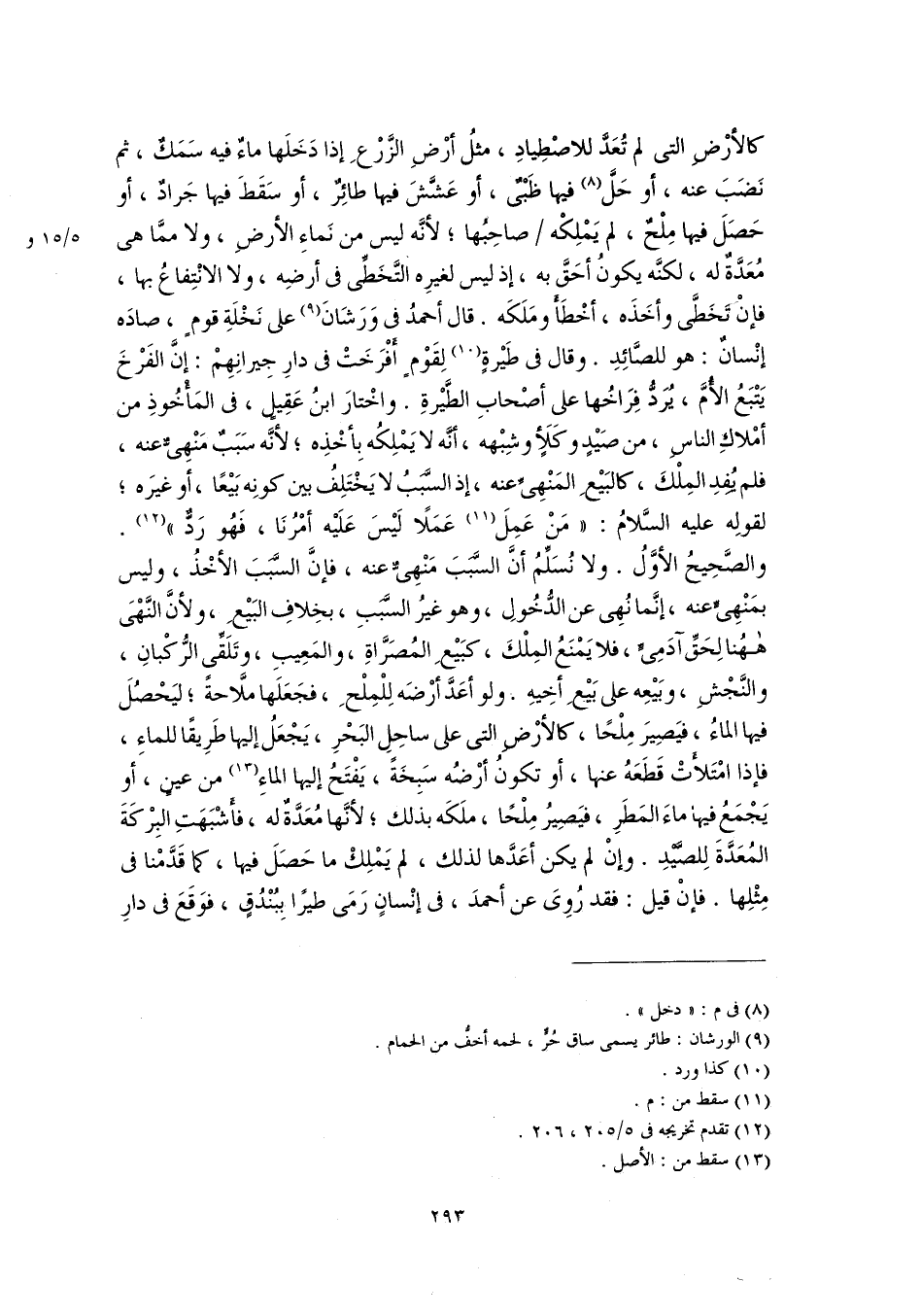 كالأرْضِ التى لم تُعَدَّ للاصْطِيادِ، مثلُ أرْضِ الزَّرْعِ إذا دَخَلَها ماءٌ فيه سَمَكٌ، ثم نَضَبَ عنه، أو حَلَّ (٨) فيها ظَبْىٌ، أو عَشَّشَ فيها طائِرٌ، أو سَقَطَ فيها جَرادٌ، أو حَصَلَ فيها مِلْحٌ، لم يَمْلِكْه صاحِبُها؛ لأنَّه ليس من نَماءِ الأرضِ، ولا ممَّا هى مُعَدَّةٌ له، لكنَّه يكونُ أحَقَّ به، إذ ليس لغيرِه التَّخَطِّى فى أرضِه، ولا الانْتِفاعُ بها، فإن تخَطَّى وأخَذَه، أخْطَأَ ومَلَكَه. قال أحمدُ فى وَرَشَانَ (٩) على نَخْلَةِ قومٍ، صادَه إنْسانٌ: هو للصَّائِدِ. وقال فى طَيْرةٍ (١٠) لِقَوْمٍ أَفْرَخَتْ فى دارِ جِيرانِهِمْ: إنَّ الفَرْخَ يَتْبَعُ الأُمَّ، يُرَدُّ فِرَاخُها على أصْحابِ الطَّيْرةِ. واخْتارَ ابنُ عَقِيلٍ، فى المَأْخُوذِ من أمْلاكِ الناسِ، من صَيْدٍ وكَلَأٍ وشِبْهه، أنَّه لا يَمْلِكُه بِأخْذِه؛ لأنَّه سَبَبٌ مَنْهِىٌّ عنه، فلم يُفِدِ المِلْكَ، كالبَيْعِ المَنْهِىِّ عنه، إذ السَّبَبُ لا يَخْتَلِفُ بين كونِه بَيْعًا، أو غيرَه؛ لقولِه عليه السَّلامُ: "مَن عَمِلَ (١١) عَمَلًا لَيْسَ عَلَيْه أمْرُنَا، فَهُو رَدٌّ" (١٢). والصَّحِيحُ الأوَّلُ. ولا نُسَلِّمُ أنَّ السَّبَبَ مَنْهِىٌّ عنه، فإنَّ السَّبَبَ الأخْذُ، وليس بمَنْهِىٍّ عنه، إنَّما نُهِى عن الدُّخُولِ، وهو غيرُ السَّبَبِ، بخِلافِ البَيْعِ، ولأنَّ النَّهْىَ هاهُنا لِحَقِّ آدَمِىٍّ، فلا يَمْنَعُ المِلْكَ، كبَيْعِ المُصَرَّاةِ، والمَعِيبِ، وتَلَقِّى الرُّكْبانِ، والنَّجْشِ، وبَيْعِه على بَيْعِ أخِيهِ. ولو أعَدَّ أرْضَه لِلْمِلْحِ، فجَعَلَها ملَّاحةً؛ ليَحْصُلَ فيها الماءُ، فيَصِيرَ مِلْحًا، كالأرْضِ التى على ساحِلِ البَحْرِ، يَجْعَلُ إليها طَرِيقًا للماءِ، فإذا امْتَلأَتْ قَطَعَهُ عنها، أو تكونُ أرْضُه سَبِخَةً، يَفْتَحُ إليها الماءِ (١٣) من عينٍ، أو يَجْمَعُ فيها ماءَ المَطَرِ، فيَصِيرُ مِلْحًا، ملَكَه بذلك؛ لأنَّها مُعَدَّةٌ له، فأَشْبَهَتِ البِرْكَةَ المُعَدَّةَ لِلصَّيْدِ. وإنْ لم يكن أعَدَّها لذلك، لم يَمْلِكْ ما حَصَلَ فيها، كما قَدَّمْنا فى مِثْلِها. فإنْ قيل: فقد رُوِىَ عن أحمدَ، فى إنْسانٍ رَمَى طيرًا بِبُنْدُقٍ، فوَقَعَ فى دارِ