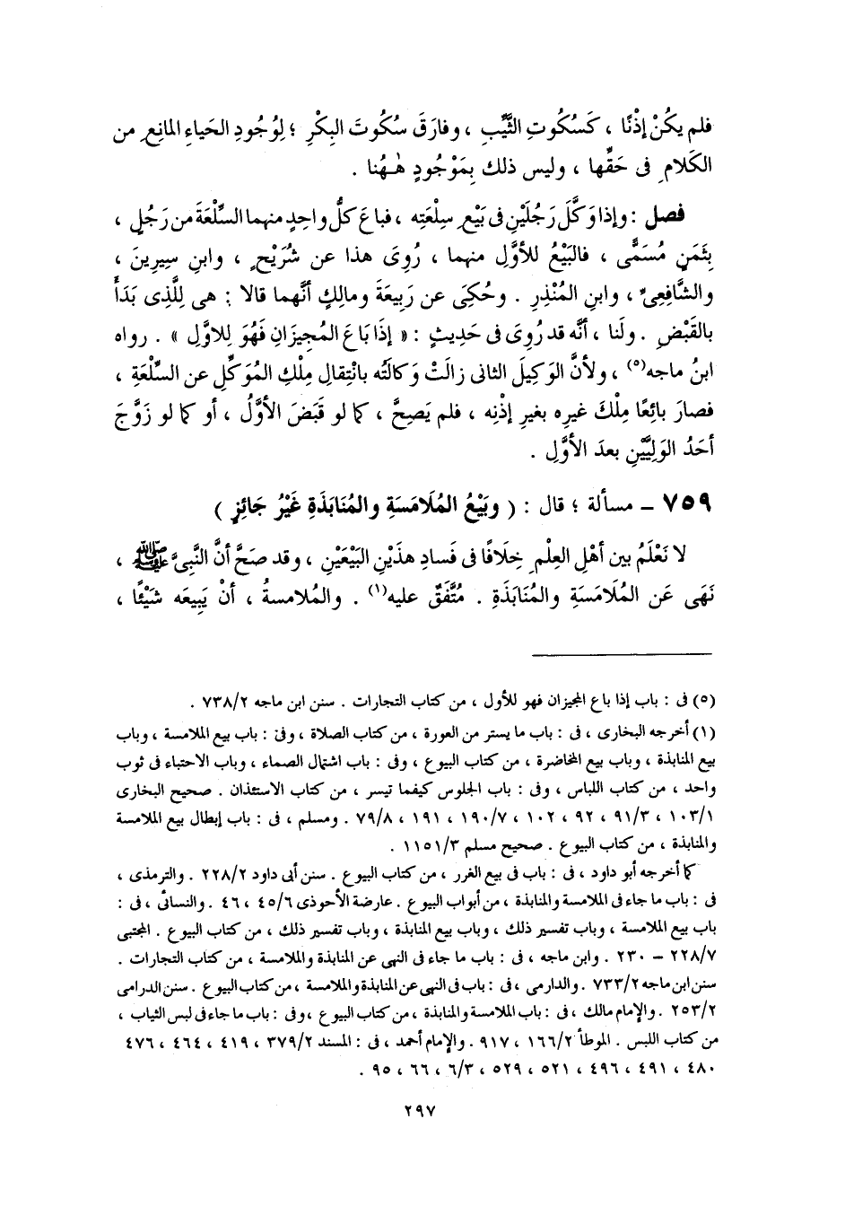 (١) أخرجه البخارى، فى: باب ما يستر من العورة، من كتاب الصلاة، وفى: باب بيع الملامسة، وباب بيع المنابذة، وباب بيع المخاضرة، من كتاب البيوع، وفى: باب اشتمال الصماء، وباب الاحتباء فى ثوب واحد، من كتاب اللباس، وفى: باب الجلوس كيفما تيسر، من كتاب الاستئذان. صحيح البخارى ١/ ١٠٣، ٣/ ٩١، ٩٢، ١٠٢، ٧/ ١٩٠، ١٩١، ٨/ ٧٩. ومسلم، فى: باب إبطال بيع الملامسة والمنابذة، من كتاب البيوع. صحيح مسلم ٣/ ١١٥١.