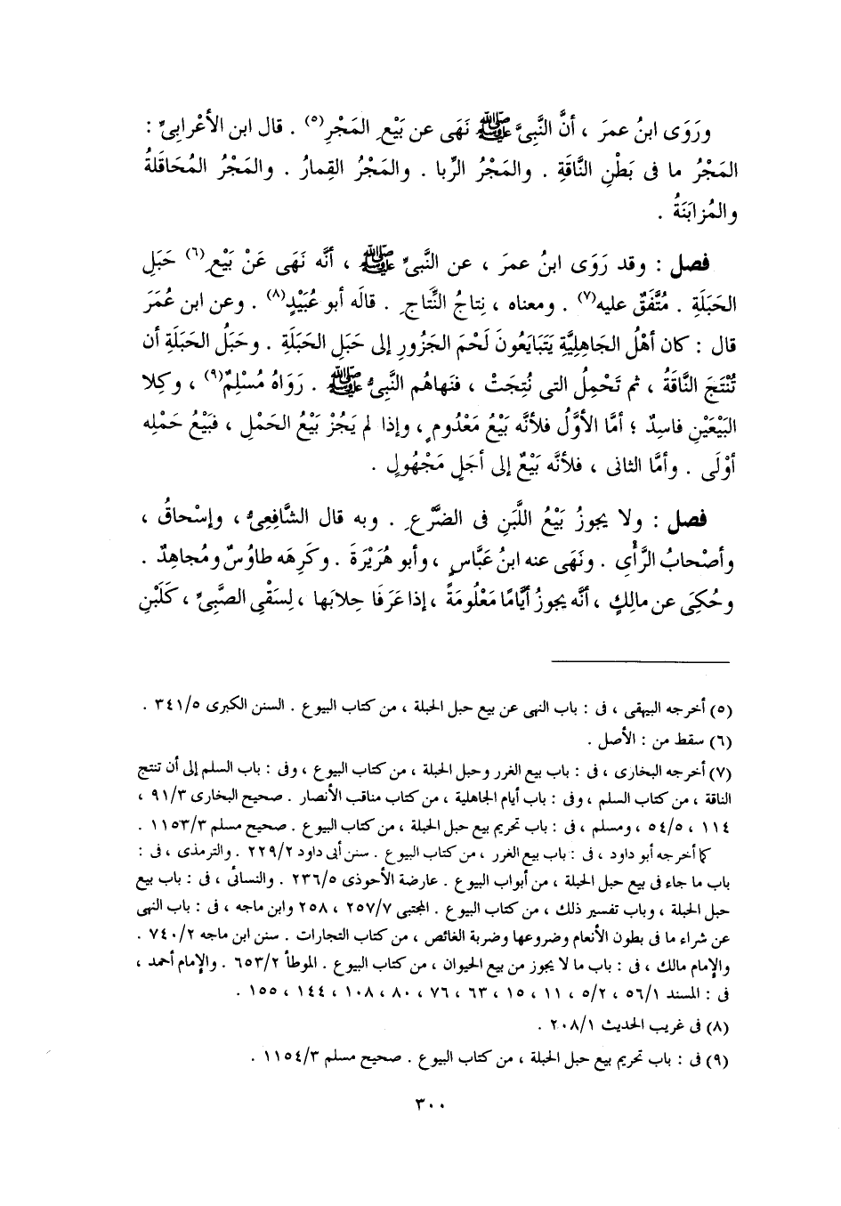 (٧) أخرجه البخارى، فى: باب بيع الغرر وحبل الحبلة، من كتاب البيوع، وفى: باب السلم إلى أن تنتج الناقة، من كتاب السلم، وفى: باب أيام الجاهلية، من كتاب مناقب الأنصار. صحيح البخارى ٣/ ٩١، ١١٤، ٥/ ٥٤، ومسلم، فى: باب تحريم بيع حبل الحبلة، من كتاب البيوع. صحيح مسلم ٣/ ١١٥٣. كما أخرجه أبو داود، فى: باب بيع الغرر، من كتاب البيوع. سنن أبى داود ٢/ ٢٢٩. والترمذى، فى: باب ما جاء فى بيع حبل الحبلة، من أبواب البيوع. عارضة الأحوذى ٥/ ٢٣٦. والنسائي، فى: باب بيع حبل الحبلة، وباب تفسير ذلك، من كتاب البيوع. المجتبى ٧/ ٢٥٧، ٢٥٨ وابن ماجه، فى: باب النهى عن شراء ما فى بطون الأنعام وضروعها وضربة الغائص، من كتاب التجارات. سنن ابن ماجه ٢/ ٧٤٠. والإمام مالك، فى: باب ما لا يجوز من بيع الحيوان، من كتاب البيوع. الموطأ ٢/ ٦٥٣. والإمام أحمد، فى: المسند ١/ ٥٦، ٢/ ٥، ١١، ١٥، ٦٣، ٧٦، ٨٠، ١٠٨، ١٤٤، ١٥٥.