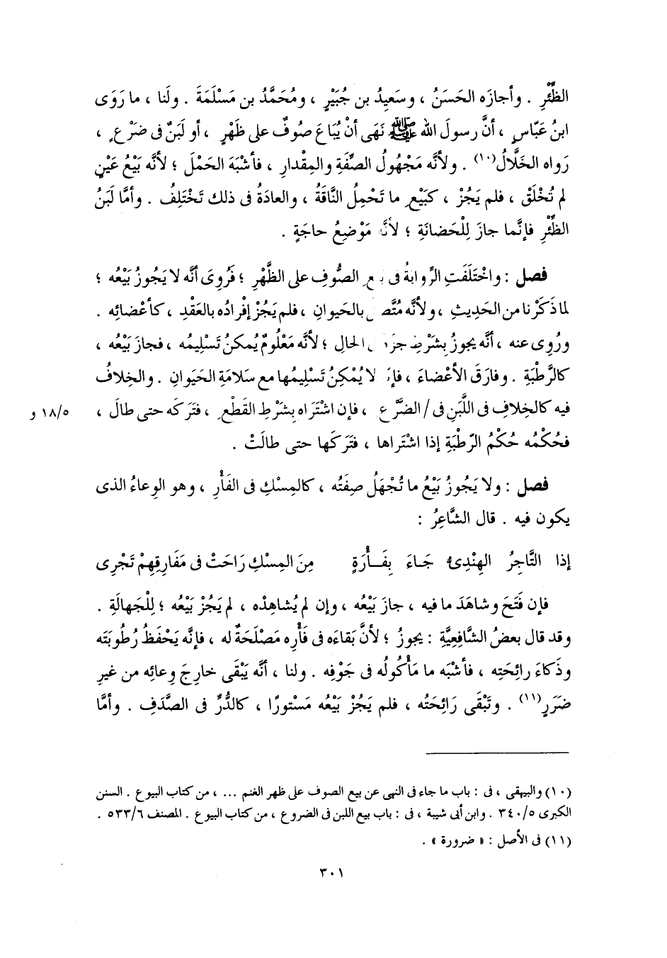 (١٠) والبيهقى، فى: باب ما جاء فى النهى عن بيع الصوف على ظهر الغنم. . .، من كتاب البيوع. السنن الكبرى ٥/ ٣٤٠. وابن أبي شيبة، فى: باب بيع اللبن فى الضروع، من كتاب البيوع. المصنِّف ٦/ ٥٣٣.